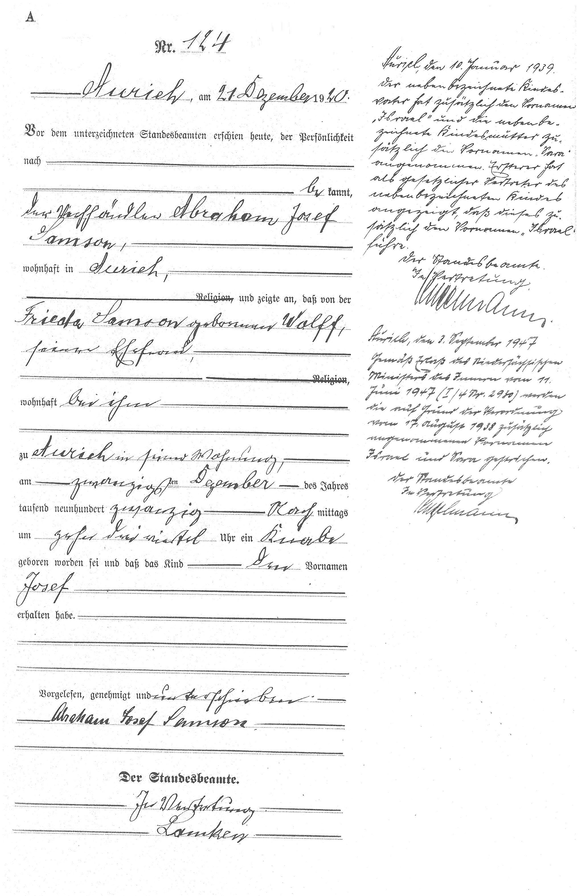 Josef Samson ist das zweite Kind der Eltern Abraham Josef und Frieda geb. Wolff aus Sandhorst. Die Familie wohnt in der Wallstraße 22 und zuletzt kurzzeitig im Haus Emder Straße 16. Die Familie ist sehr religiös und beachtet alle Gesetze der Religion. Um sie herum gibt es viel weitere Verwandtschaft der beiden Elternteile. Wie alle jüdischen Kinder kann Josef nach der jüdischen Volksschule keine weitere Schul- oder Berufsausbildung in Aurich anschließen. Der Antrag auf Aufnahme in das Ulricianum wird abgelehnt. Er arbeitet bei einem Bauern als landwirtschaftliche Hilfskraft in der Erwartung, dass diese Fähigkeiten bei einem Pionierleben in Palästina wichtig sind.