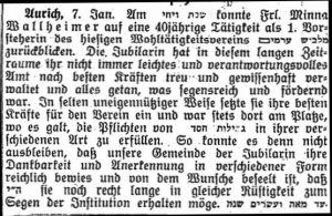 Aus Alemannia Judaica. Der Israelit 1932 über: den Israelitische Mädchenverein Malbisch Arumim (gegründet 1872; unter Leitung von Minna Wallheimer mit 45 Mitgliedern; Zweck und Ar-beitsgebiet: Unterstützung Bedürftiger, Brautausstattung)