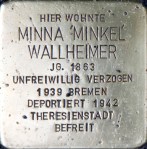 Mit den Verhandlungen zum Zwangsverkauf des Hauses zieht sie zusammen mit ihrem Bruder und dessen Frau nach Bremen (Biebricher Straße 7) in das Haus ihrer Schwester Goldine Grünberg und deren Familie. Ihr Bruder muss später mit seiner Frau in ein Judenhaus an der Großen Johannisstraße 85 in der Bremer Neustadt umziehen. In Bremen hat Minkel Wallheimer noch häufigen Kontakt mit der ebenfalls vertriebenen Auricher Familie Cohen von der Wallstraße 33.