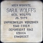 | Sarah Wolffs (geb. 20.10.1878) ist die Tochter von Wolf Selig Wolffs und Eva Abraham Wolffs, geb. Wolffs. Sie heiratet 1907 den Viehhändler und Schlachter Simon Cossmann Wolffs (geb. 14.9.1877) in Aurich. Die Wallstraße 12 gehört zu diesem Zeitpunkt noch Selig Wolff Wolffs, einem Bruder von Sarah. Nebenan, in der Wallstraße 14 wohnte übrigens Sarahs Bruder Abraham Wolff Wolffs (Malermeister), der letzte Synagogenvorsteher in Aurich (vertrieben aus Aurich 1940, Emden, September 1942 Chelmno).