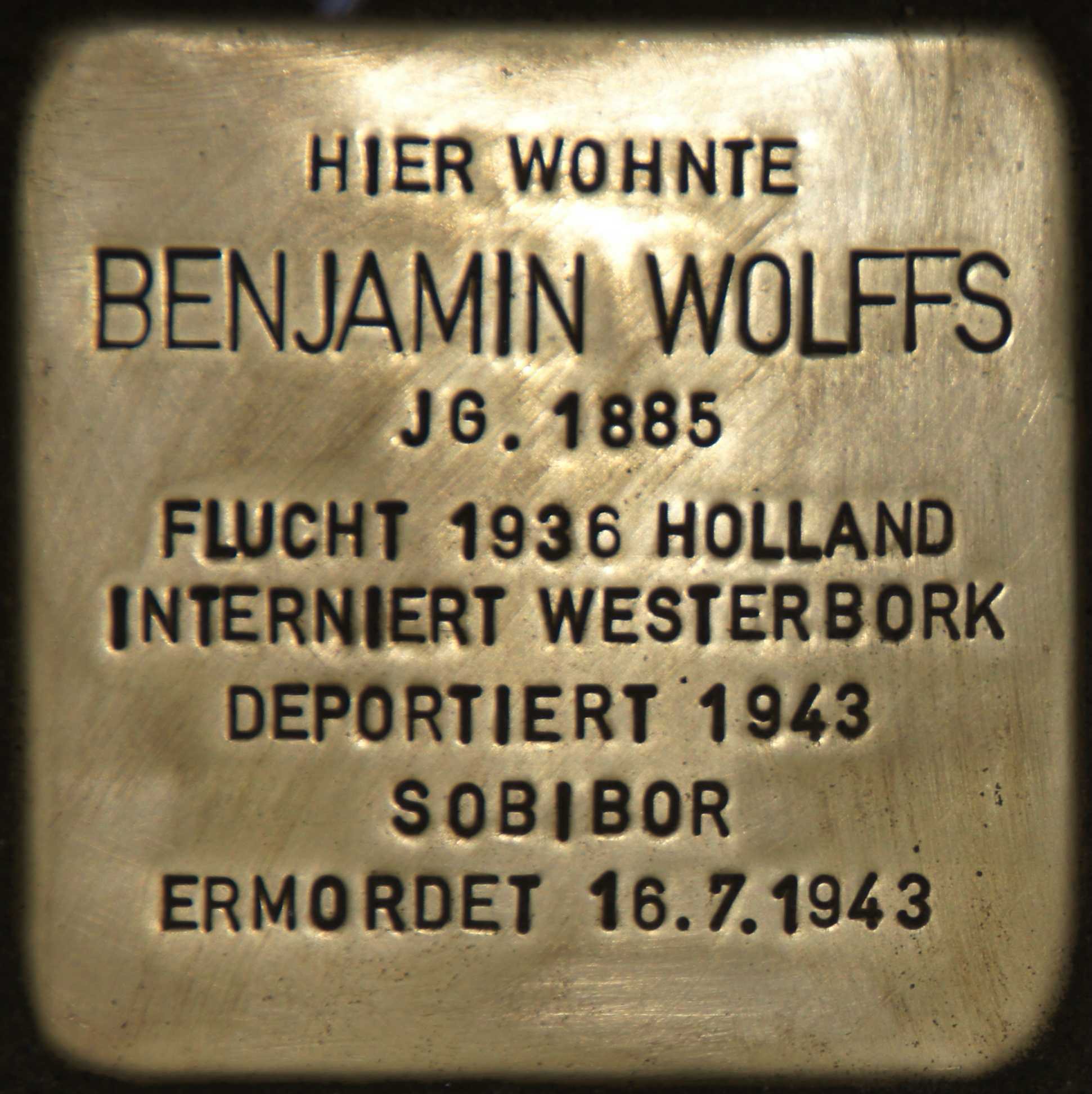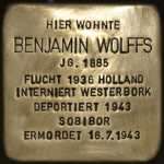 Am 30. Dezember 1919 heiratet Benjamin Paula Hess in Weener, die im Januar 1920 nach Aurich zieht. Ihre Ehe bleibt kinderlos. Ende der 20iger Jahre übernimmt Benjamin Wolffs das Geschäft seines Vaters als Schlachter und Viehhändler in der Osterstraße. Die nationalsozialistischen Boykottmaßnahmen gegen jüdische Geschäfte in Aurich treffen die Wolffs hart, sie müssen am 2. April 1936 das Haus samt Hofgrundstück versteigern lassen. Schon einen Monat später, am 5. Mai 1936, emigriert das Ehepaar in die Niederlande nach Leeuwarden. Am 4. Oktober 1942 werden sie von den Nationalsozialisten in das Durchgangslager Westerbork gebracht und dort interniert. Benjamin und Paula Wolffs werden am 13. Juli 1943 mit 1.986 weiteren Juden aus Westerbork in das Vernichtungslager Sobibor deportiert, das sie drei Tage später erreichen. |