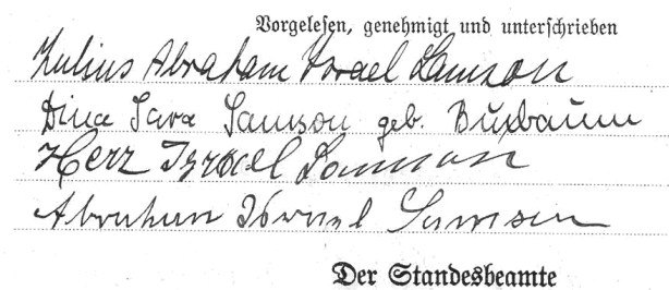 Heiratsurkunde Julius Samson und Dina Buxbaum am 24. 11. 39 in Aurich (Ausschnitt mit Unterschriften der Trauzeugen)