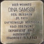 | Dina Samson, geboren als Dina Buxbaum am 24.11.1919 in Rennertehausen Kreis Frankenberg-Eder, wohnte in Aurich Sandhorst, Gut Coldehörn. Dina Samson ist das Kind der Eltern des Kaufmanns Simon Buxbaum *17.04.1874 in Römersberg und Auguste Stern *12.07.1876 in Battenberg. Am 24.06.1936 zieht sie von Kerstenhausen/Fritzlar nach Aurich in die von- Jhering-Str. 27 (bei Iwan Samson, einem Cousin ihres späteren Ehemanns Julius Samson) und ab 1.07.1937 lebt sie in der Osterstraße 13 bei Sally Goldschmidt, einem Bruder von Hedwig Samson, ihrer späteren Schwiegermutter. In Aurich lernt sie Julius Samson kennen. Sie zieht am 17.03.1938 noch einmal nach Kerstenhausen, ihrer oberhessischen Heimat. Sie heiratet Julius Samson am 24.11.39 in Aurich. Trauzeugen sind der Schwiegervater Abraham und dessen Bruder Herz (Ausschnitt der Heiratsurkunde s. u.). Im April 1940 zieht das Paar nach Dortmund, wo die Eltern Samson und Julius’ Schwester Emmi bereits leben. Sie wohnen zuerst in der Saarlandstraße71, dann in der Weiherstraße 75 und zuletzt Königswall 44 – alles Judenhäuser. Das Paar bekommt zwei Kinder: Reha *16.07.1940 und Dan *4.07.1942. Ihr Mann Julius leistet Zwangsarbeit in einer Dortmunder Tiefbaufirma. Am 2.03.1943, im Anschluss an die reichsweiten „Fabrikaktionen“, wird die ganze Familie nach Auschwitz deportiert.Am 27. 02. 43 wird Julius Samson an seiner Arbeitsstelle verhaftet und in ein Sammellager, die Gaststätte Deutsches Haus am Brackeler Hellweg, eingesperrt. Seine Familie wird aufgefordert, sich am nächsten Tag dort einzufinden. Am 2. März dann um acht Uhr müssen sich alle auf den Weg zum Südbahnhof machen. Von Brackel mit der Straßenbahn bis zum Ostentor, dann müssen sie in Formation zum Südbahnhof marschieren. Dort steht schon eine Lokomotive unter Dampf mit angehängten Viehwaggons bereit. Am Abend des 3. März kommt der Zug in Auschwitz an. „Männer nach rechts, Frauen nach links“. Julius Samson wird mit 50 anderen auf einen offenen Lastwagen verladen, der sie nach Auschwitz-Monowitz bringt. Der Kopf wird ihm zum zweiten Mal im Lebens kahl geschoren und er bekommt die Nummer 105496 auf den linken Unterarm eintätowiert.Dort, aufgrund der allerhärtesten Arbeitsbedingungen – die Baustelle Buna-Werk wird im übrigen zivil von Ingenieuren der IG-Farben geführt – sterben täglich Dutzende. Oder sie werden nach sogen. Überstellungslisten nach Auschwitz-Birkenau gebracht, weil sie krank und nicht mehr ausbeutbar waren. Ein solcher Überstellungseintrag fehlt. Man kann annehmen, Julius Samson ist im Krankenbau Monowitz dort an unbekanntem Datums, gestorben.