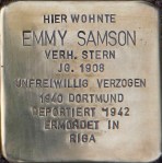 Ende der 30er Jahre geht sie nach Dortmund und heiratet Siegfried Stern. Das Paar hat keine Kinder und wohnt in der Westerbleichstraße 3, einem Judenhaus. In Riga wird ihnen jedoch alles abgenommen. Nachdem die vorgegebene Sollstärke von 1.000 Personen für Deportationstransporte erreicht ist, verlässt der Zug am 27.01.1942 Dortmund mit Ziel Riga. Am 1. Februar trifft der Zug in Riga-Skirotva ein. Emmi Samson muss im Ghetto, dessen eingesessene Bewohner vorher schon ermordet waren, Zwangsarbeit für die Wehrmachtsausrüstung leisten. Am 2. November 1943 wird das Ghetto geräumt. Ein Transport mit 1.000 Personen geht nach Auschwitz. Emmi könnte dabei gewesen sein. Eine Häftlingsnummer (d.h. wg. Arbeitsfähigkeit) aus Auschwitz existiert jedoch nicht. Von Siegfried ist noch bekannt, dass auch er am 2.11.1943 nach Auschwitz kommt. Der weitere Verbleib von Emmi Stern ist unbekannt. Für den 31.12.1943 wird sie 1950 vom Amtsgericht Dortmund für tot erklärt. |