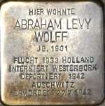 Abraham Levy Wolff wird am 23. Juni 1901 in Aurich geboren. Er ist das erste Kind des Schlachters und Viehhändlers Levy Abraham Wolff (geb. 10.08.1862 in Aurich) und seiner Ehefrau Clara / Clärchen geb. Wolffs (geb. 5.10.1872 in Aurich). Abraham erlernt das Handwerk seines Vaters und wird ebenfalls Schlachter wie auch sein Bruder Wolff. Dieser geht aber schon 1918 nach Frankfurt und arbeitet 1932 auch kurz auf Norderney. Am 11.2.1938 flieht Wolff Wolff nach Palästina, Haifa. Gelly heiratet 1926 den Händler Gustav Wolff aus Sandhorst, 1935 wird die Ehe wieder geschieden. Auch sie schafft es, rechtzeitig mit ihren beiden Kindern Cläre und Josef am 2.4.1937 nach Haifa, Palästina, zu fliehen. Während Gelly auf die Ausreisepapiere wartet, schickt sie ihre Kinder für einige Monate zu ihrem Bruder Abraham und ihrer Schwägerin Frieda nach Groningen. Abraham Wolff heiratet am 15.01.1928 Frieda Hess (*22.07.1902) aus Weener. Ihr Vater war ebenfalls Viehhändler und Fleischverkäufer. Das Ehepaar entschließt sich schon bald nach der Machtübernahme Hitlers, in die Niederlande zu fliehen. Am 13.09.1933 emigrieren die beiden nach Groningen in die Folkingestraat 19. Ihre Ehe wird kinderlos bleiben. Am 22.09.1937 stirbt Abrahams Vater im Alter von 75 Jahren. Daraufhin hält seine Mutter nichts mehr in Aurich, sie zieht im März 1938 zu ihrem Sohn und ihrer Schwiegertochter nach Groningen. Abraham wird 1942 im Sammellager Westerbork interniert und von dort am 16. Juli 1942 nach Auschwitz deportiert. In diesen Julitagen werden in drei Transporten etwa 3.000 Internierte von Westerbork nach Auschwitz deportiert und dort ermordet. Seine Ehefrau Frieda wird zusammen Abrahams Mutter Clara am 12. bzw. 13.03.1943 in Westerbork interniert. Warum sie erst ein Jahr später als ihr Mann Abraham aufgegriffen wurden, können wir nicht erklären. Vielleicht konnte sie sich einige Zeit versteckt halten. Kurz nach der Internierung werden Frieda und ihre Schwiegermutter Clara am 23.03.1943 in das Vernichtungslager Sobibor deportiert und dort nach ihrer Ankunft ermordet.