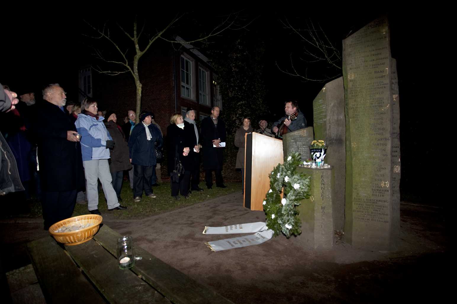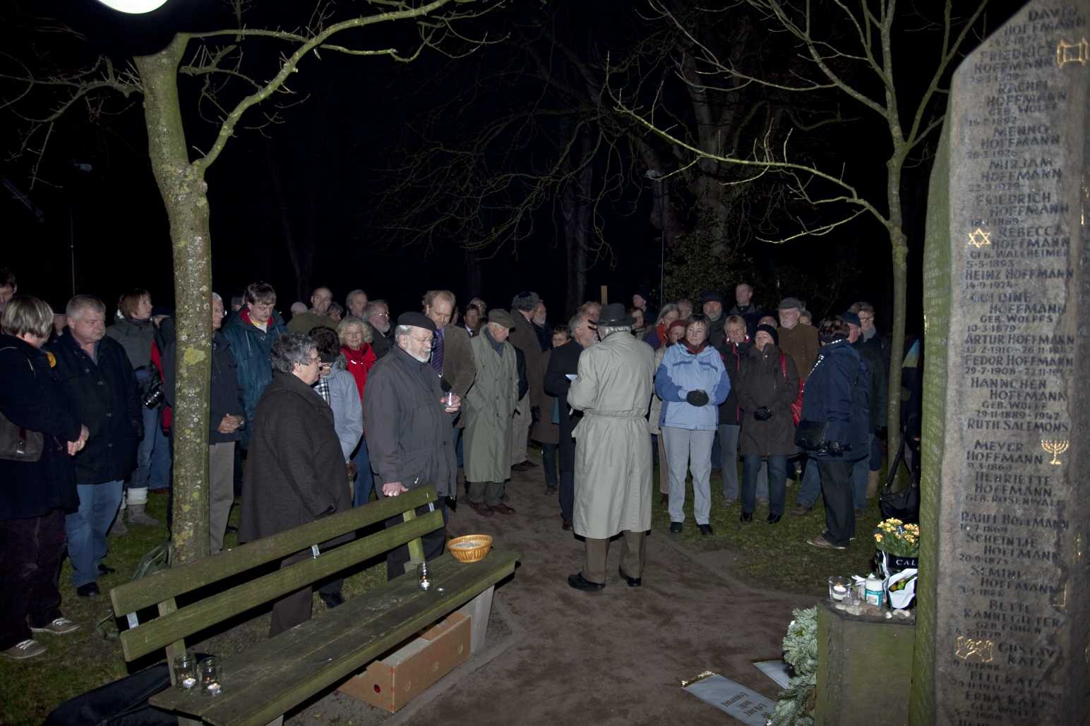 Die Gedenkfeier anlässlich der Pogromnacht am 9. November 1938 fand in diesem Jahr aufgrund der 1. Stolper- steinverlegung in Aurich bereits am 8. November statt. Etwa 100 Teilnehmer versammelten sich am Synagogenplatz. MdB Reinhold Robbe, Präsident der Deutsch-Israelischen Gesellschaft, betonte in seiner Ansprache: „Unsere Generation hat keine Schuld auf sich geladen, aber sie hat eine große Verantwortung, die Erinnerung in die nächsten Generationen weiterzutragen, damit sich die Geschichte nicht wiederholt.“ Tito Wolff, einer der letzten drei noch lebenden, in Aurich geborenen Juden, sprach einen jüdischen Segensspruch. Zum Abschluss der Gedenkfeier wurde ein Kranz in der Form eines Davidsterns zum Haus der Ärztekammer gebracht, zu der Stelle, wo füher einmal die jüdischen Schule stand.