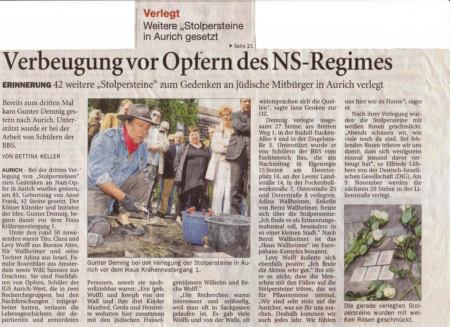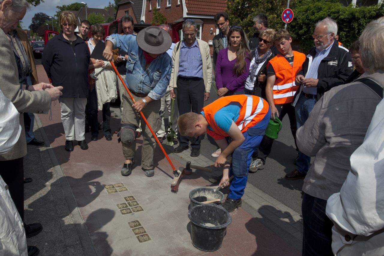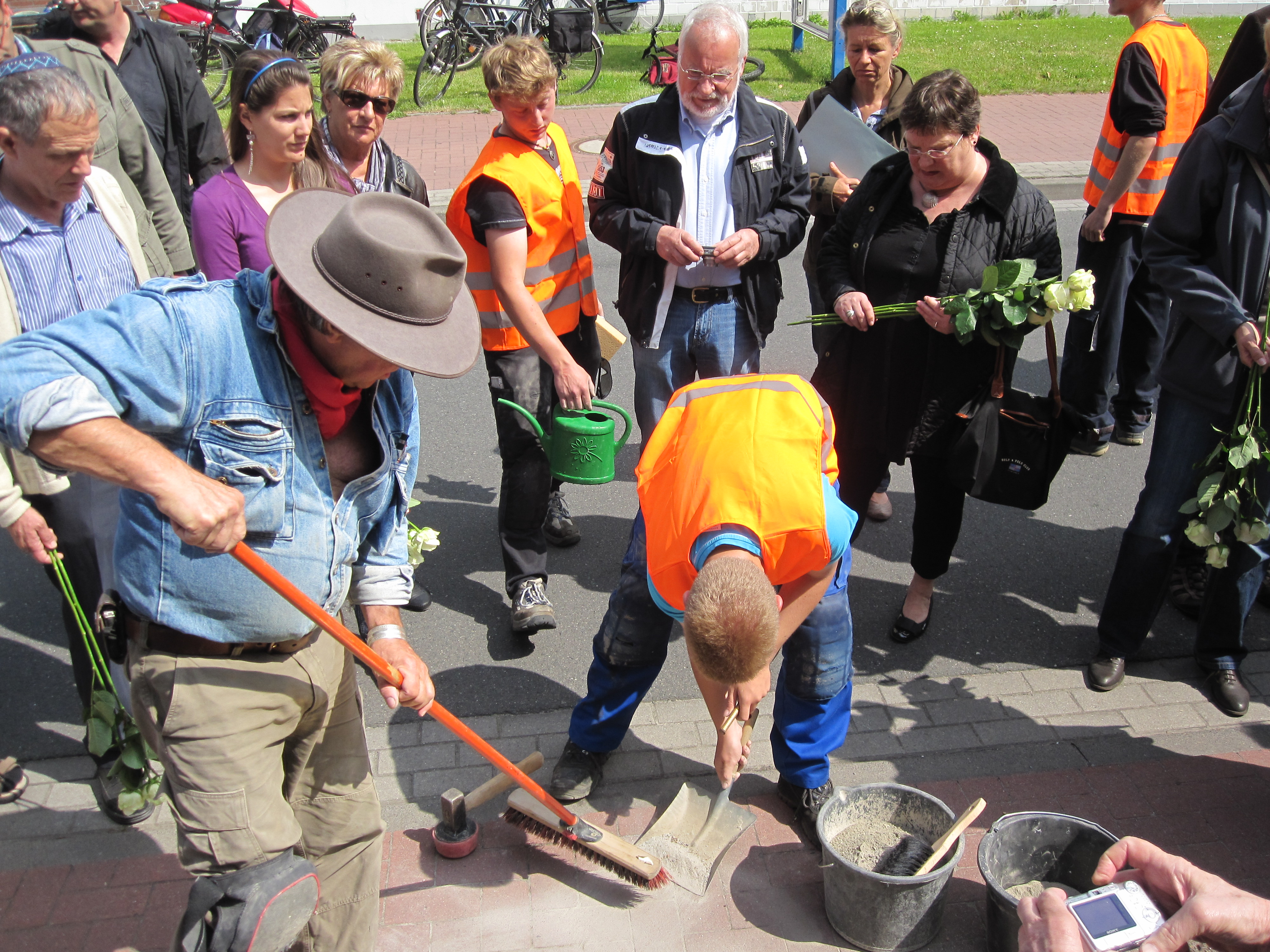 An diesem Tag sollten 42 Steine verlegt werden. Der Initiator des Stolpersteinprojektes, der Kölner Künstler Gunter Demnig, war höchstpersönlich angereist, um am Vormittag die Steine zu verlegen. Zur großen Freude der Arbeitsgruppe waren auch wieder Verwandte der Opfer als Gäste der Stadt Aurich aus Argentinien, Israel und den Niederlanden angereist.