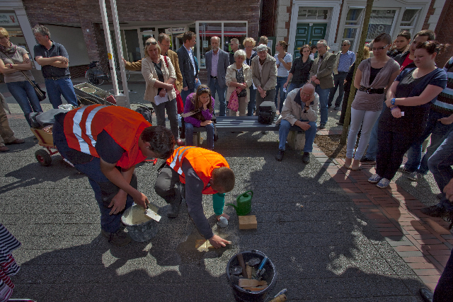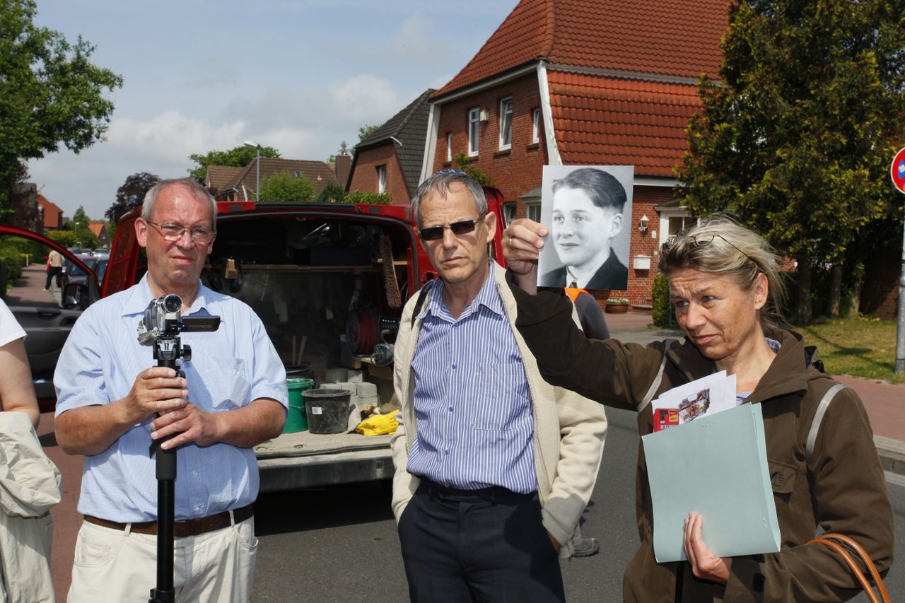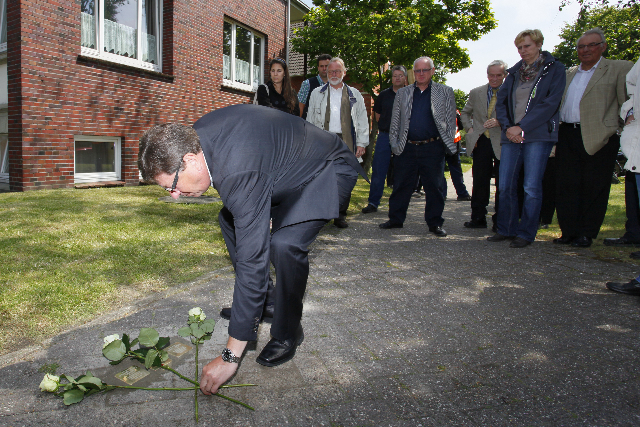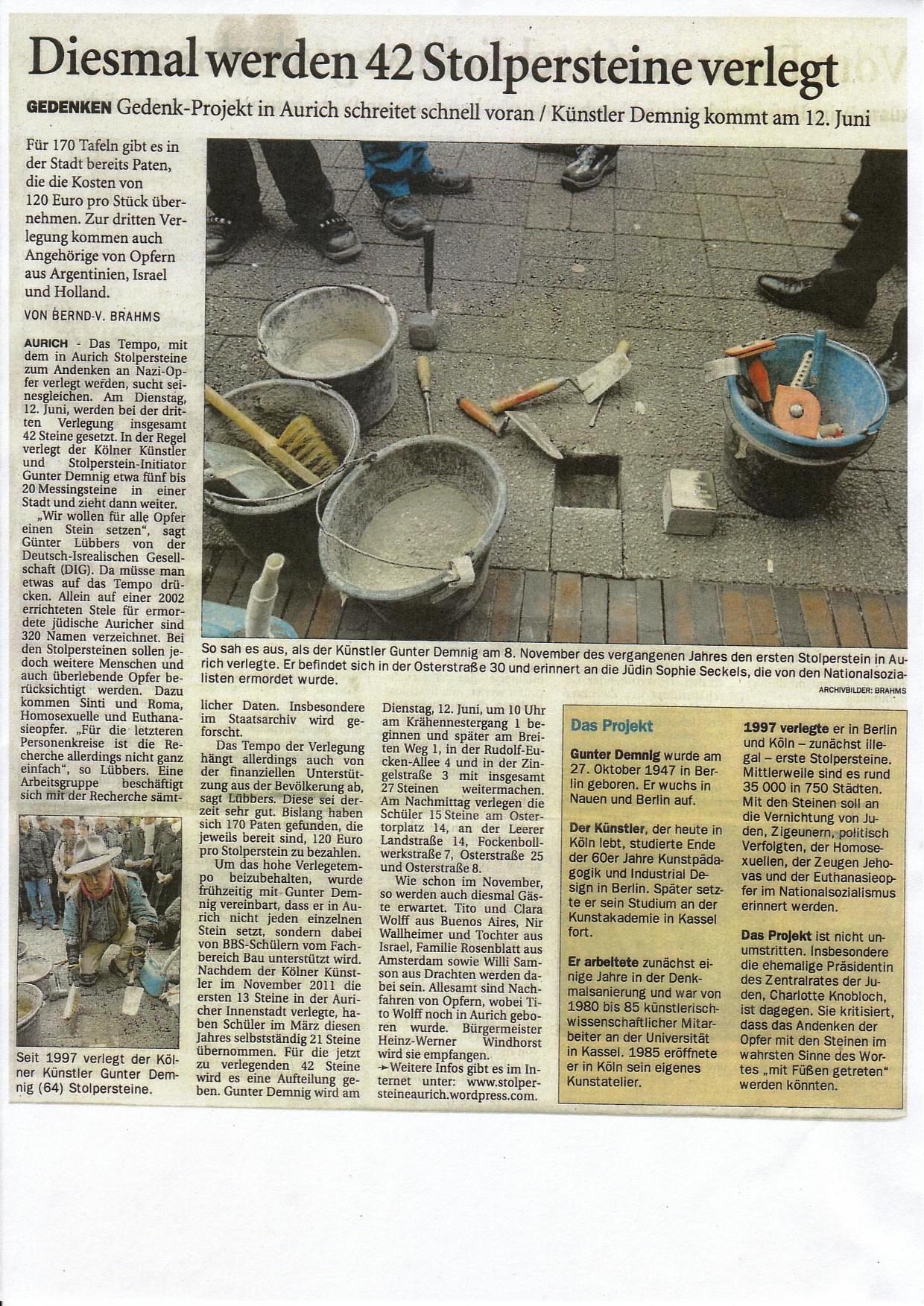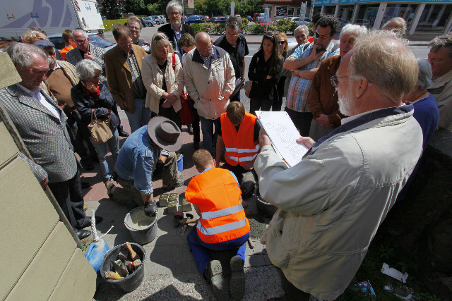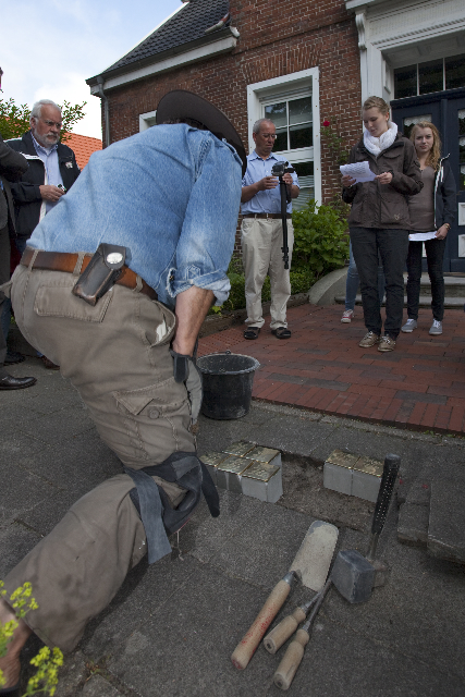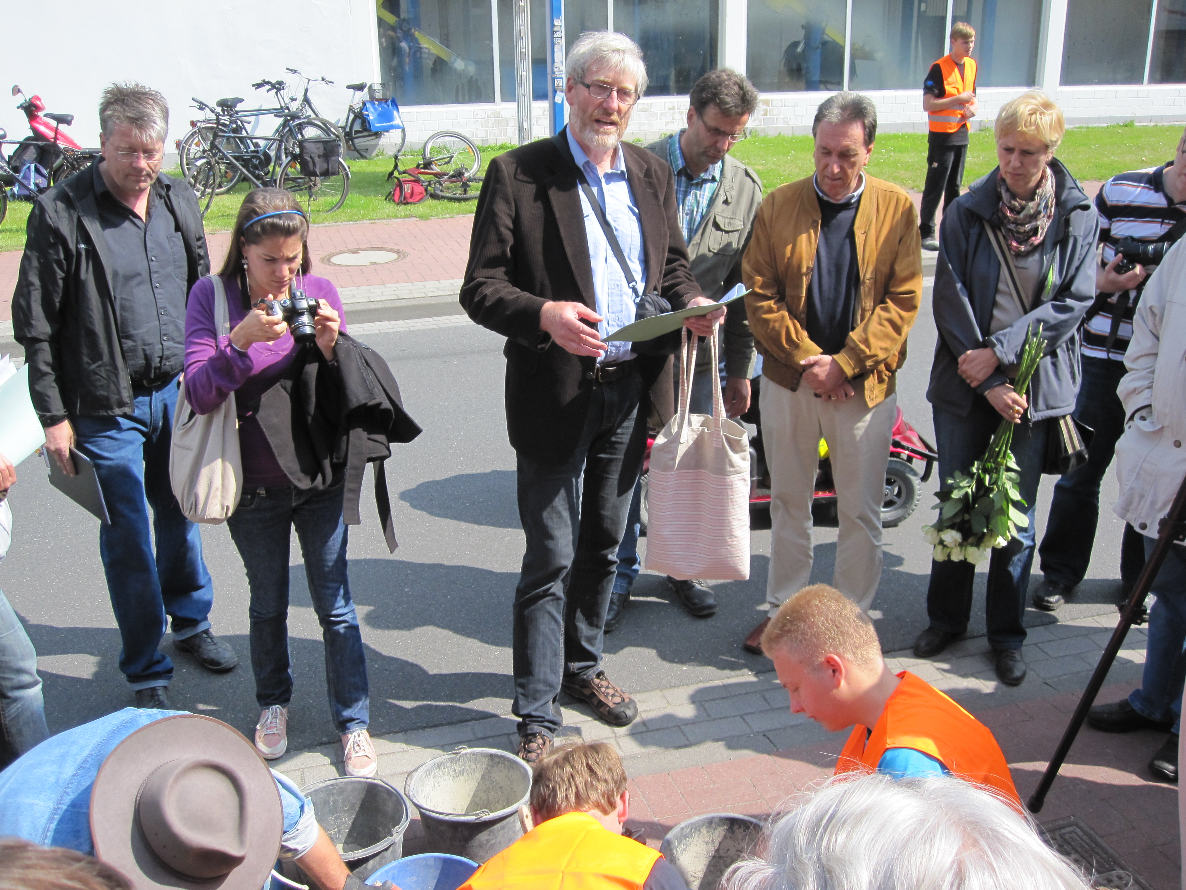 An diesem Tag sollten 42 Steine verlegt werden. Der Initiator des Stolpersteinprojektes, der Kölner Künstler Gunter Demnig, war höchstpersönlich angereist, um am Vormittag die Steine zu verlegen. Zur großen Freude der Arbeitsgruppe waren auch wieder Verwandte der Opfer als Gäste der Stadt Aurich aus Argentinien, Israel und den Niederlanden angereist.