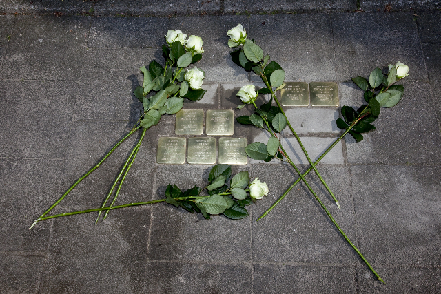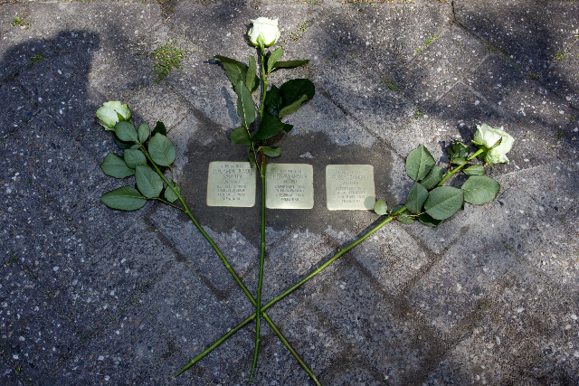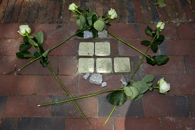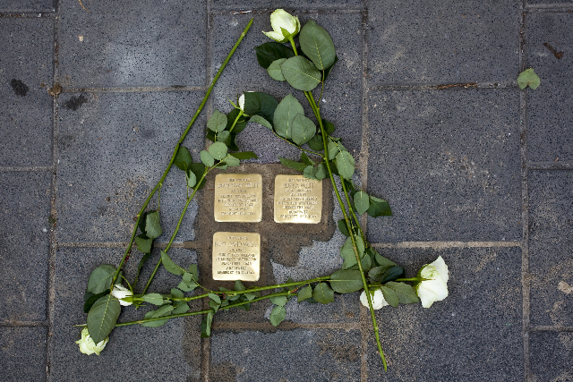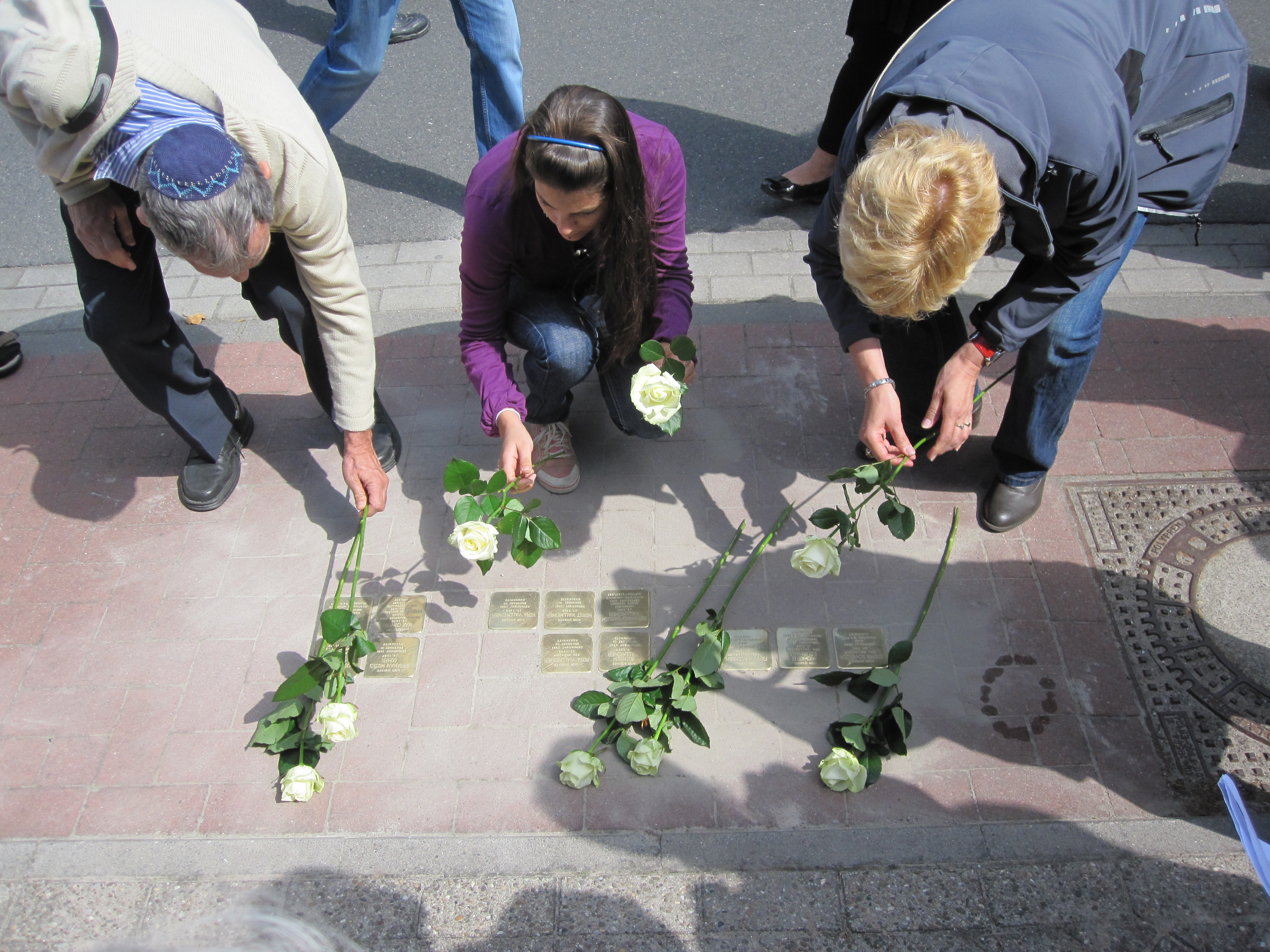 Die zweite Station der Verlegung war der „Breite Weg 1“. Hier gab es Probleme mit der Lage der Steine, da das originale Haus der Wallheimer nicht mehr existiert. Die Steine wurden daher ein wenig versetzt vor dem Haus „Wallheimer“ des „Europa Haus“, das den Namen der Familie trägt. Sohn und Enkeltochter von „Benni“ Wallheimer legten hier Rosen nieder.