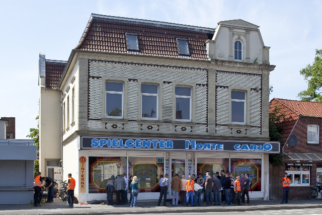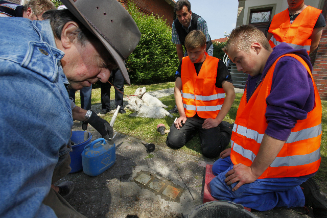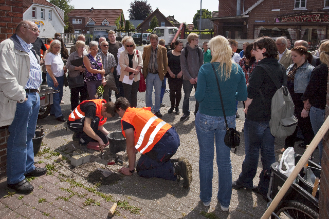 Nach einer Mittagspause übernahmen Schüler der Berufsfachschule Bau der BBS II Aurich die Verlegung der Steine. Die 7. Station des Tages war die Fockenbollwerkstraße 7