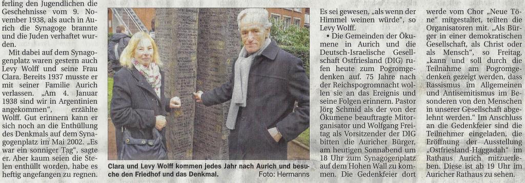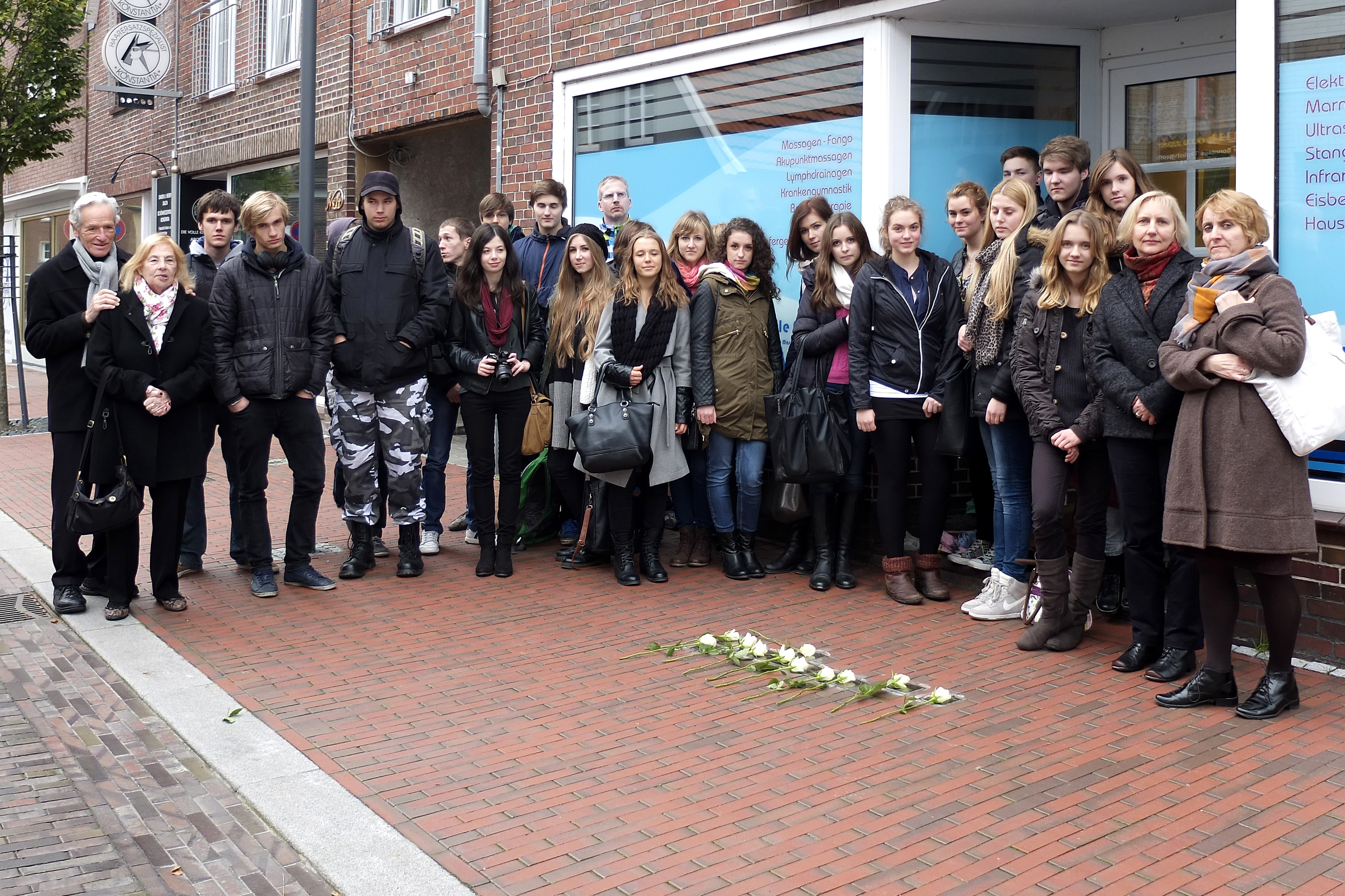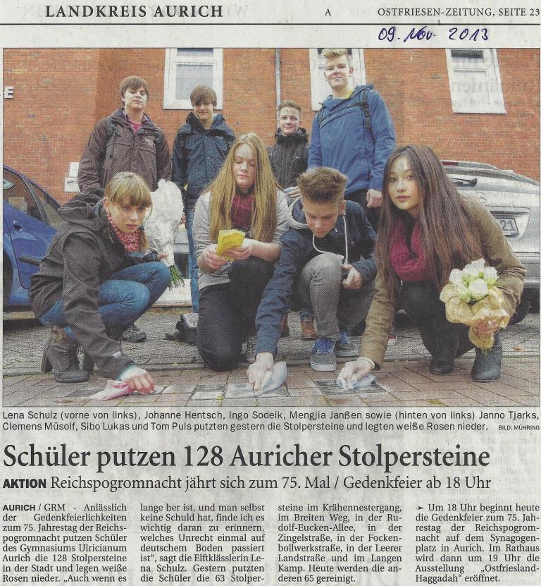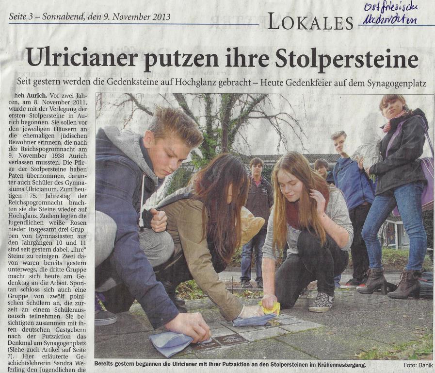 Spontan schloss sich den putzenden Ulricianern eine Gruppe von Schülern aus Kepno (Polen) an. Die Schüler des Liceums Kepno waren gerade zum Gegenbesuch im Rahmen eines Schüleraustausches mit dem Ulricianum hier zu Gast. Sie trafen vor dem Haus Wallheimer im Breiten Weg auf Tito und Clara Wolff aus Buenos Aires. Tito Wolff ist eines der letzten noch lebenden Mitglieder der jüdischen Gemeinde in Aurich – ein bewegendes Zusammentreffen.