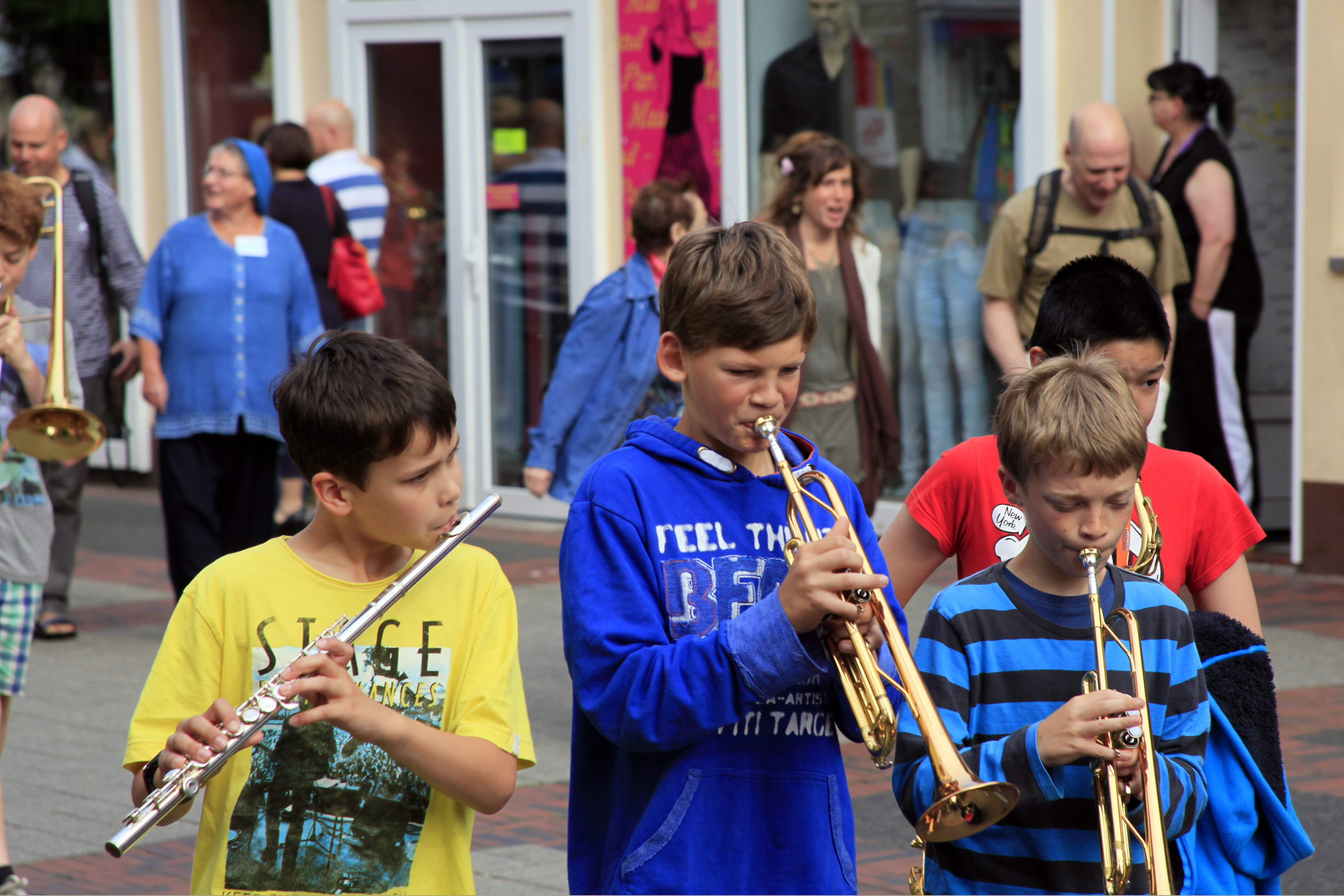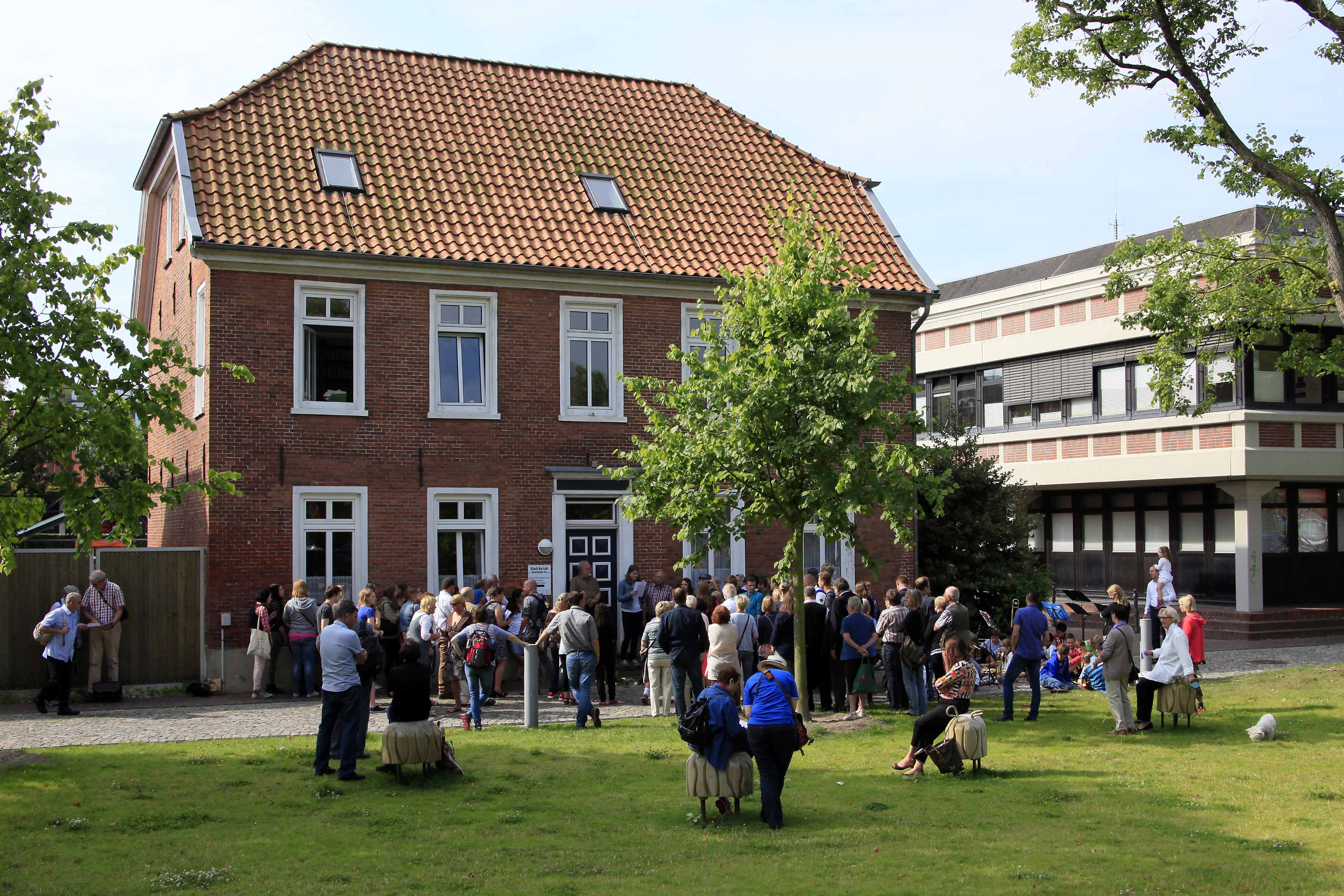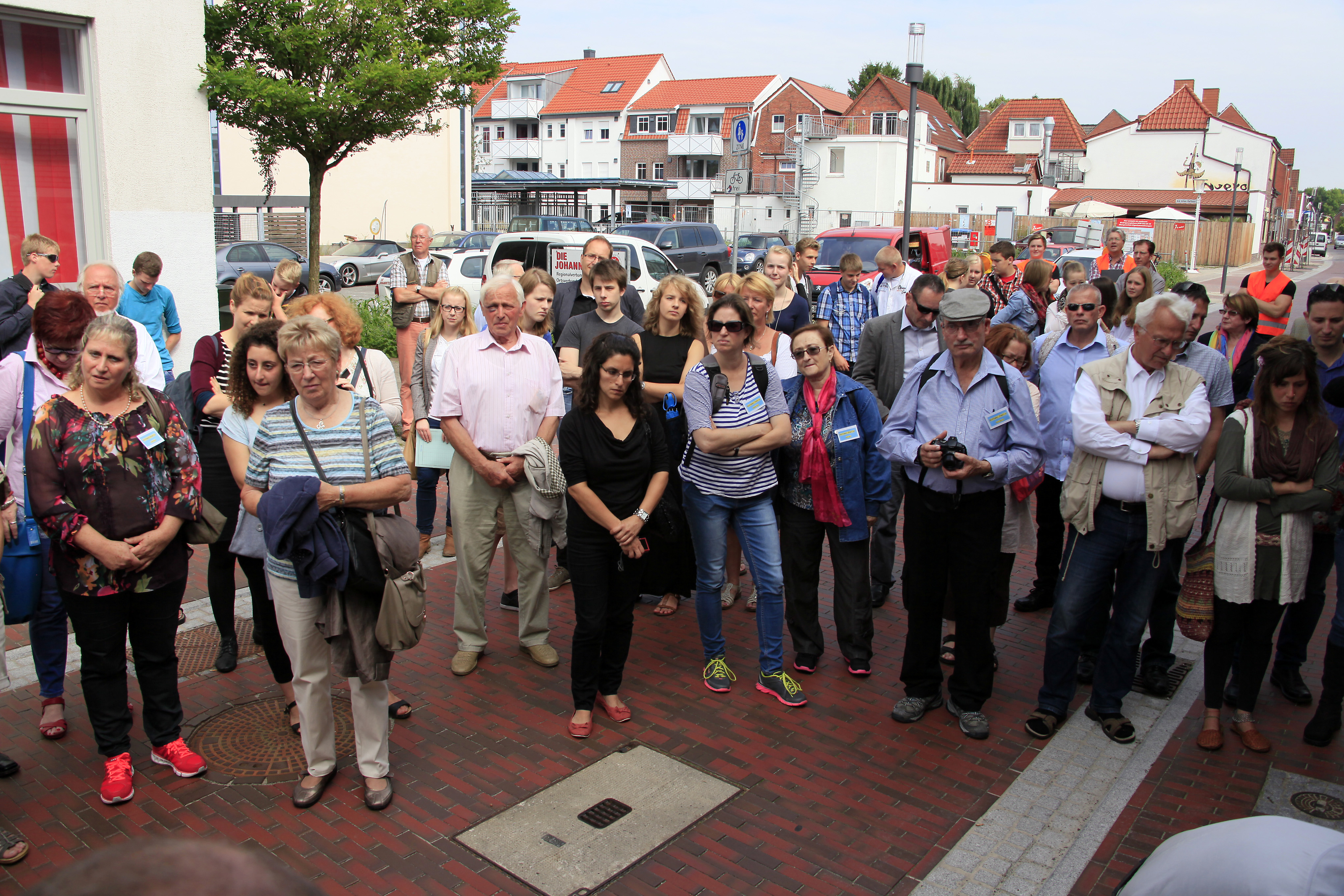 Vor der Verlegung treffen sich alle Gäste vor dem Hochzeitshaus – ganz links Brigitte Weber vom Kulturamt der Stadt Aurich, die die Verlegung in derArbeitsgruppe Stolpersteine mit vorbereitet hat und in der letzten Reihe links: Günther Lübbers,Vorsitzender der Arbeitsgruppe „Stolpersteine Aurich“.Die Bläserklasse 6B des Gymnasiums Ulricianum musiziert „Schalom Chaverim“ auf dem Weg durch die Fußgängerzone zur ersten Verlegestelle.