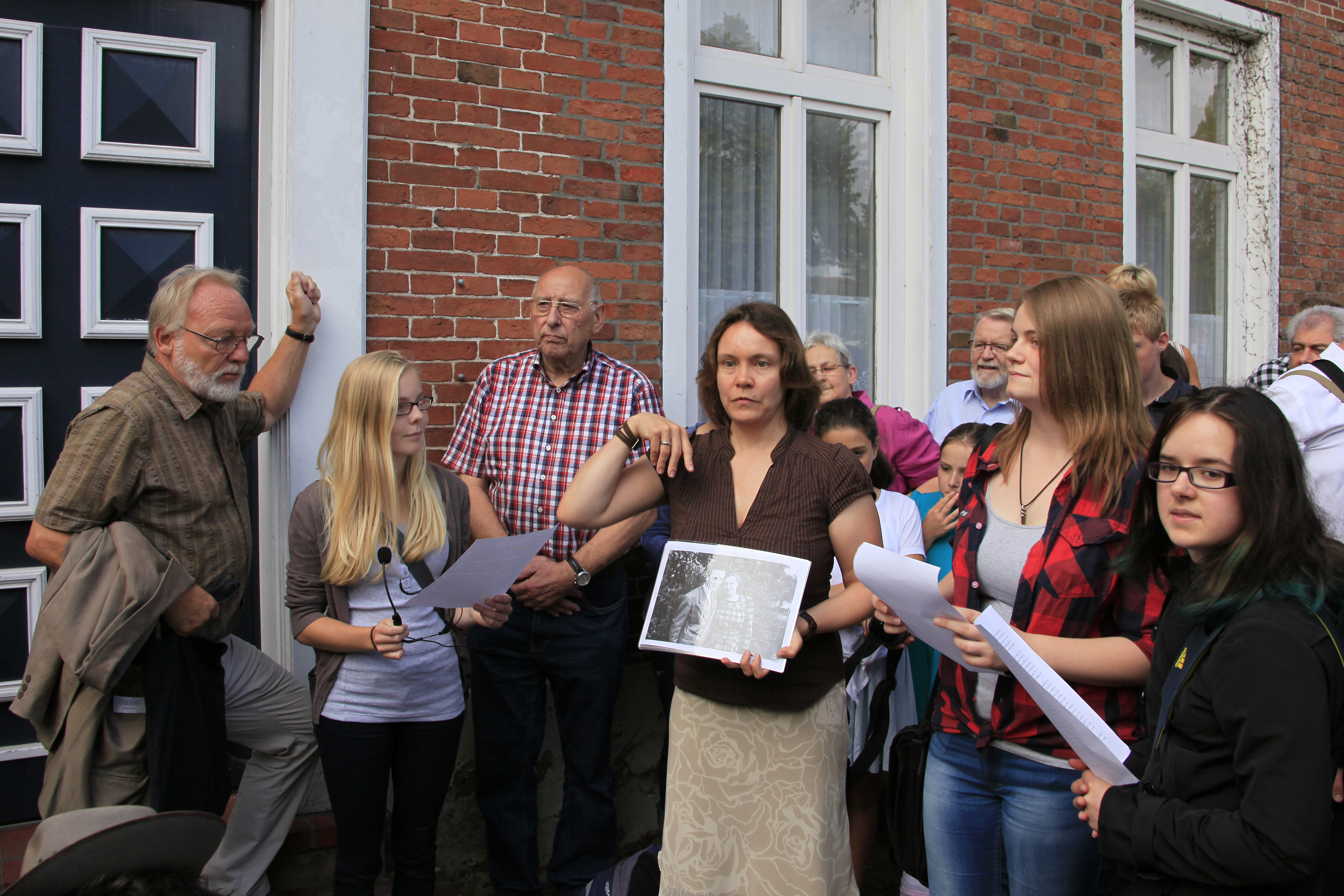 Heimann Wolffs – Lindenstraße 12 (heute: Georgswall 23) Pate: Gymnasium Ulricianum Aurich Rosa Wolffs geb. Stahl – Lindenstraße 12 (heute: Georgswall 23) Pate: Gymnasium Ulricianum Aurich Lazarus (Lutz) Wolffs – Lindenstraße 12 (heute: Georgswall 23) Pate: Gymnasium Ulricianum Aurich Wolff Heimann Wolffs – Lindenstraße 12 (heute: Georgswall 23) Pate: Gymnasium Ulricianum Aurich Otto Wolffs – Lindenstraße 12 (heute: Georgswall 23) Pate: Gymnasium Ulricianum Aurich Guste Margrit Wolffs – Lindenstraße 12 (heute: Georgswall 23) Pate: Gymnasium Ulricianum AurichSchülerinnen des Ulricianums haben mit ihrer Lehrerin Frau Dr. Weferling die Informationen zu den Biografien erarbeitet und tragen ihre Ergebnisse vor (Antke Duhan, Julie Kostka, Johanna Hentschel, Nadine Behrends, Amke Redenius und Myriam Voss)Fotos der Familie geben ein Bild von den Menschen, die einmal in diesem Haus gelebt haben – hier ein späteres Foto von Otto Wolffs und seiner Ehefrau Gertrud.Das jüngste Kind der Familie war Guste Margrit (s. gezeigtes Foto), die – wie ihr älterer Bruder Otto, der heute in Weinstadt lebt – mit einem „Kindertransport“ nach England entkommen konnte. Sie lebt heute als Margret Silbermann in London.Die Bläserklasse von Frau Könekamp-Glashoff spielt zu Ehren der Familie auf. Da Wolff Heimann Wolffs der letzte jüdische Abiturient des Ulricianums war, hat das Gymnasium die Patenschaft für alle Mitglieder der Familie Heimann Wolffs übernommen.