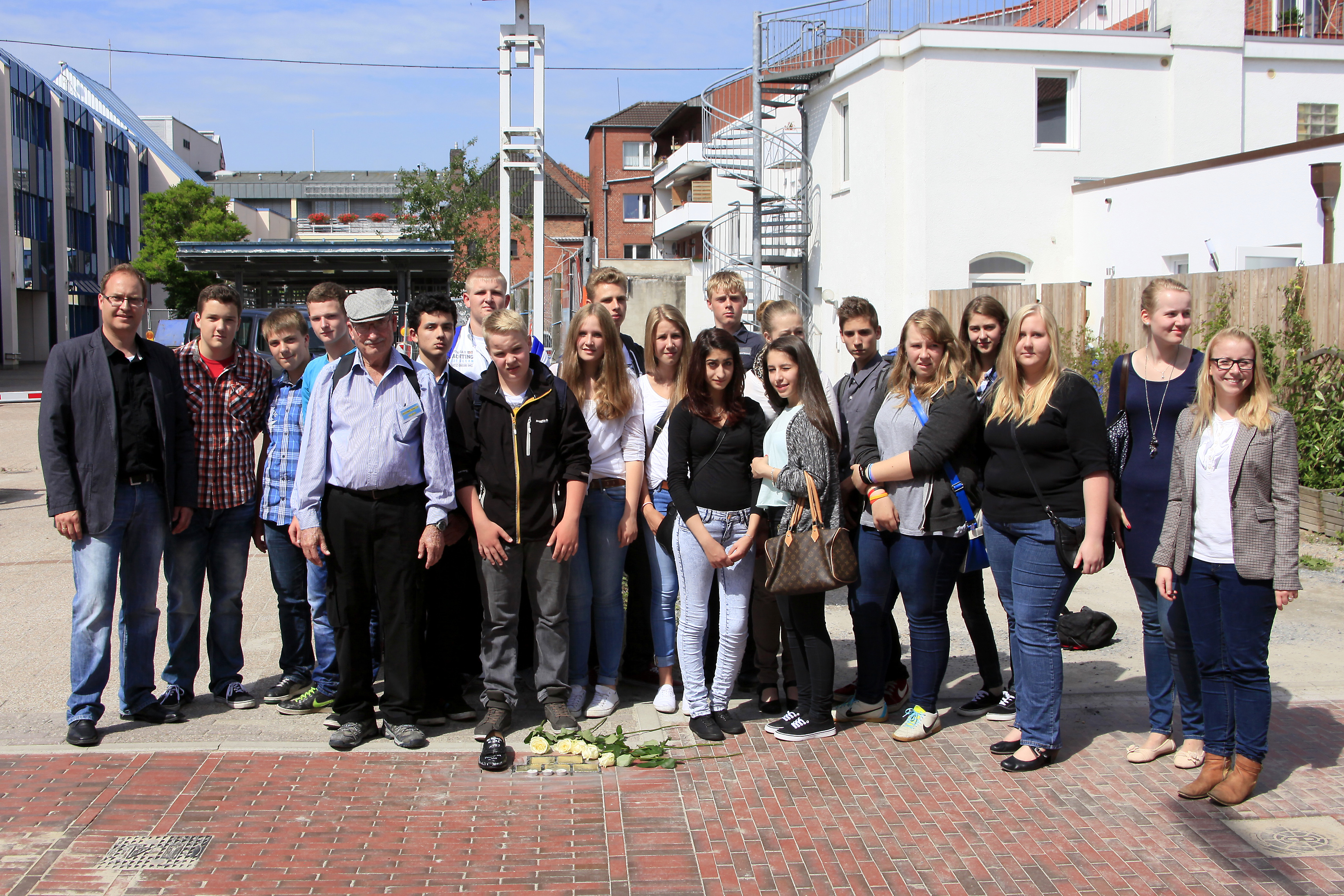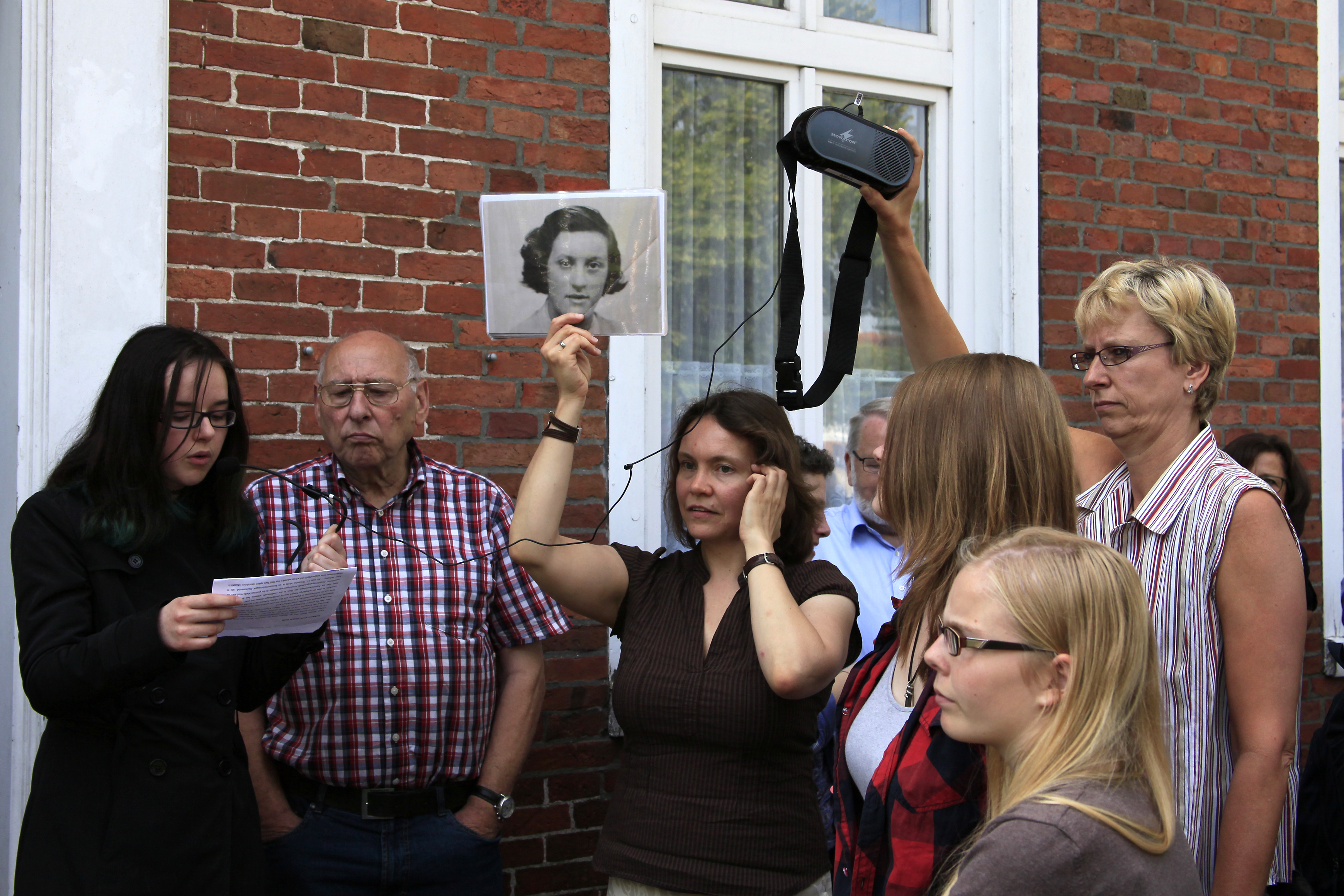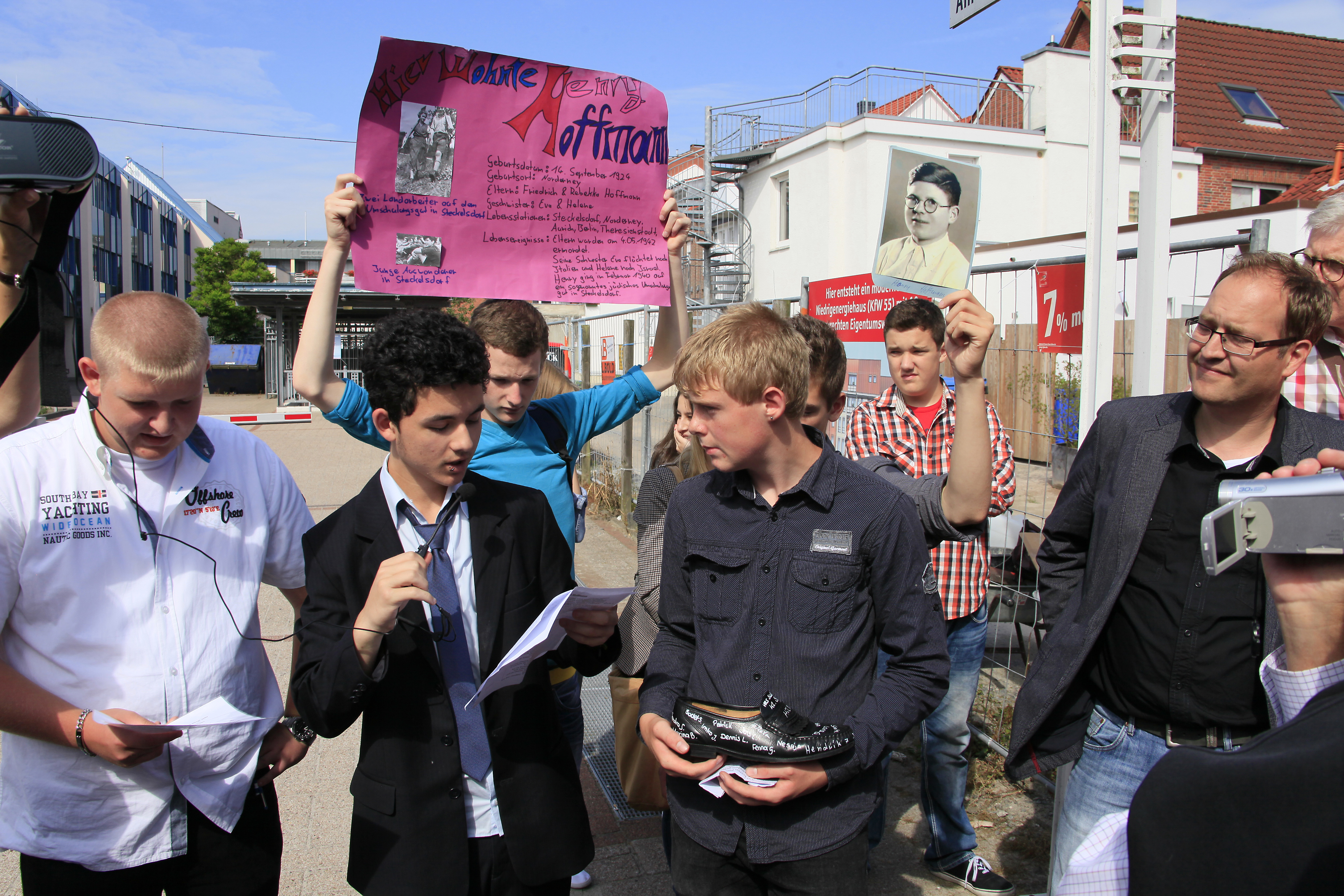 Friedrich (Fritz) Hoffmann – Wallstraße 19 Pate: Johann Peter Schmidt Rebecca Hoffmann geb. Wallheimer – Wallstraße 19 Pate: Volkstanzgruppe des Auricher Heimatvereins Eva Hoffmann verh. Fabbri – Wallstraße 19 Paten: Uwe und Elke Hemmelskamp Helene Hoffmann verh. Zuntz – Wallstraße 19 Pate: Hans-Gerd Meyerholz Heinz (Henry) Hoffmann – Wallstraße 19 Pate: Klasse 9E2 Realschule MoordorfJörg Peters und Schüler der Realschule Moordorf tragen die Biografien der Familie Hoffmann vor. Die Schüler haben ein Plakat zum Leben von Heinz „Henry“ Hoffmann erstellt und als Zeichen ihrer Anteilnahme einen Schuh (in Erinnerung an die eingesammelten Schuhe der Opfer) mit ihren Namen versehen.In bewegenden Worten erzählt die jüngste Tochter von Helene Zuntz, Miriam, von ihrer Mutter, die zuletzt als Leni Zuntz in Israel lebte und dort vor einigen Jahren starb. Zur Verlegung der Steine für ihre Angehörigen waren 20 Nachfahren der Familie, darunter alle fünf Kinder von Helene Zuntz, aus Israel angereist.Und hier die gesamte Klasse 9E2 der Realschule Moordorf (von links nach rechts): Herr Theilen (Klassenlehrer), Marvin van Echten. Jens Caspers, Jann Kruse, Hendrik Zohrabian, Keno Dettmers, Dennis Ley, Marina Brockmann, Imko Jaske, Lara Gerdes, Nesaja Niemann, Hilko Albers, Sina Memenga, Sadet Sulejmani, Patric Pascal Kielblock, Sandra Schütte, Denise Quidde, Fenna Grensemann, Julia Eckhoff, Frau Zureck.Die Volkstanzgruppe des Auricher Heimatvereins hat die Patenschaft für den Stein für Rebecca Hoffmann geb. Wallheimer übernommen.