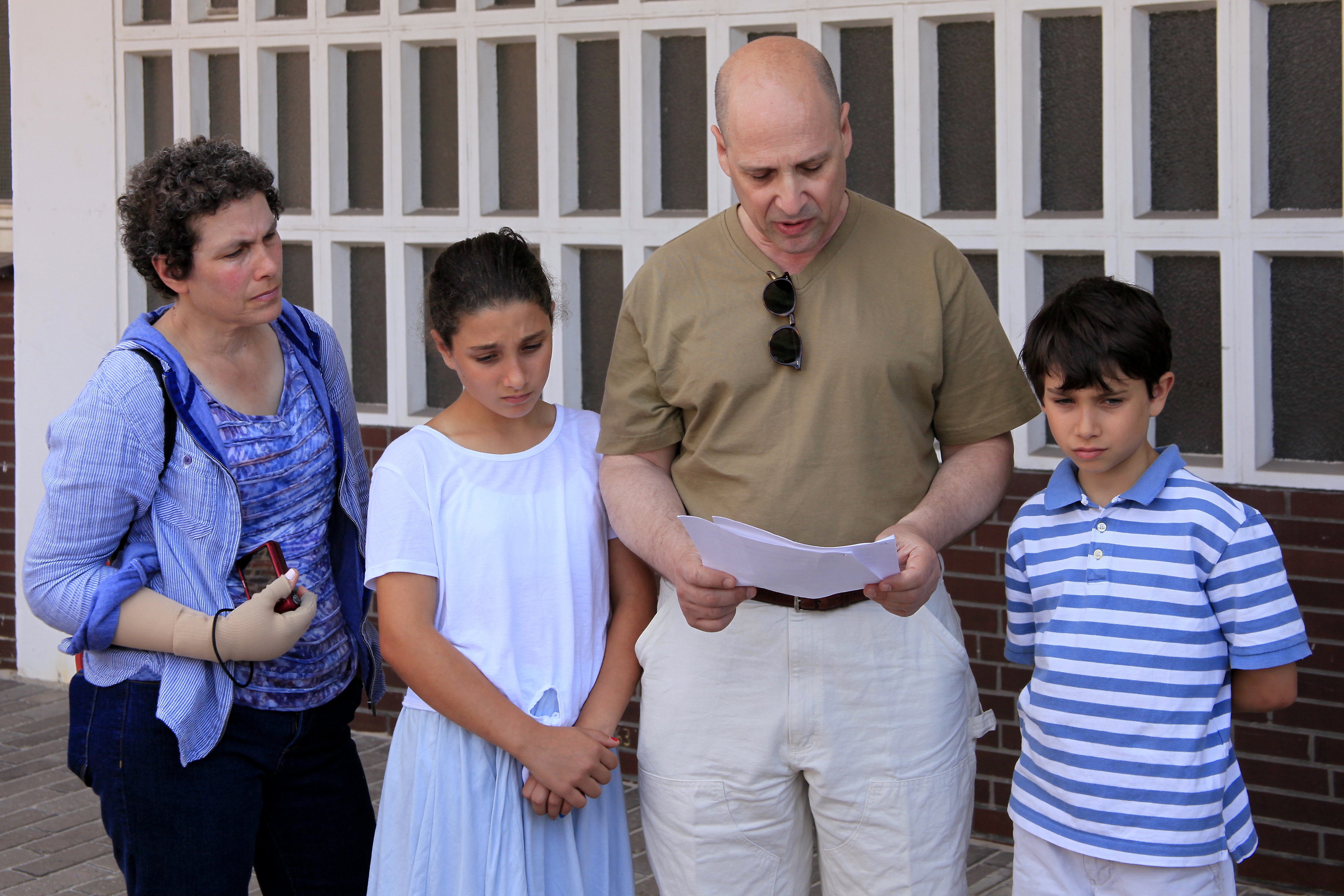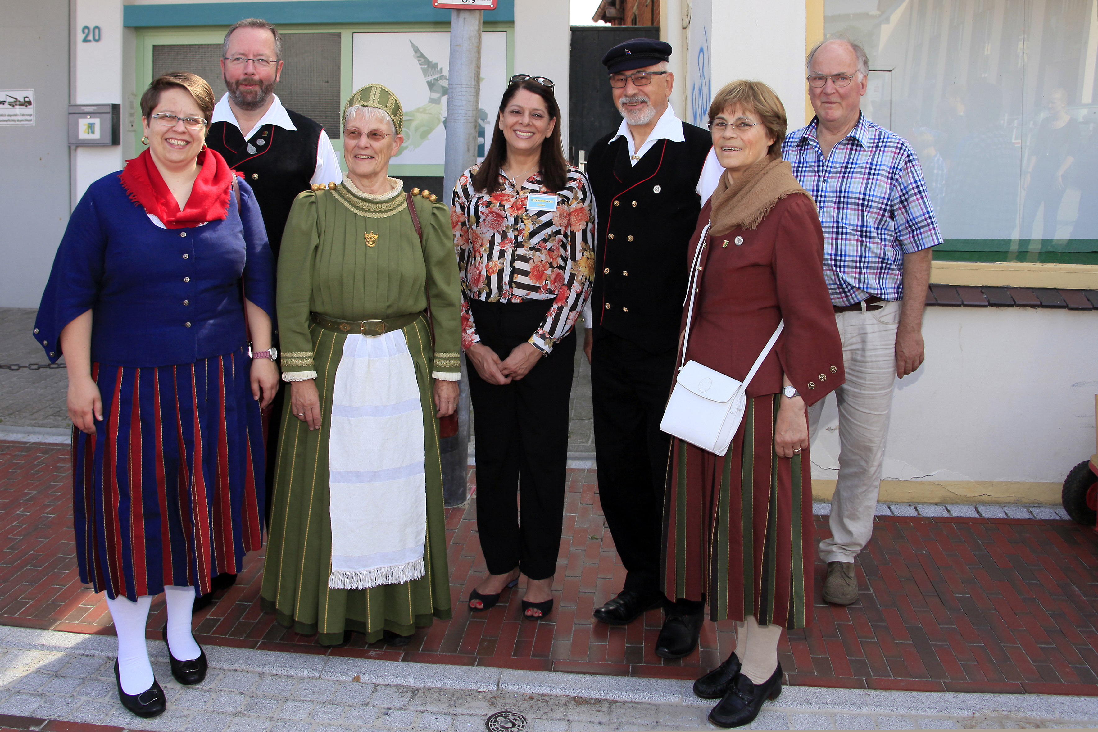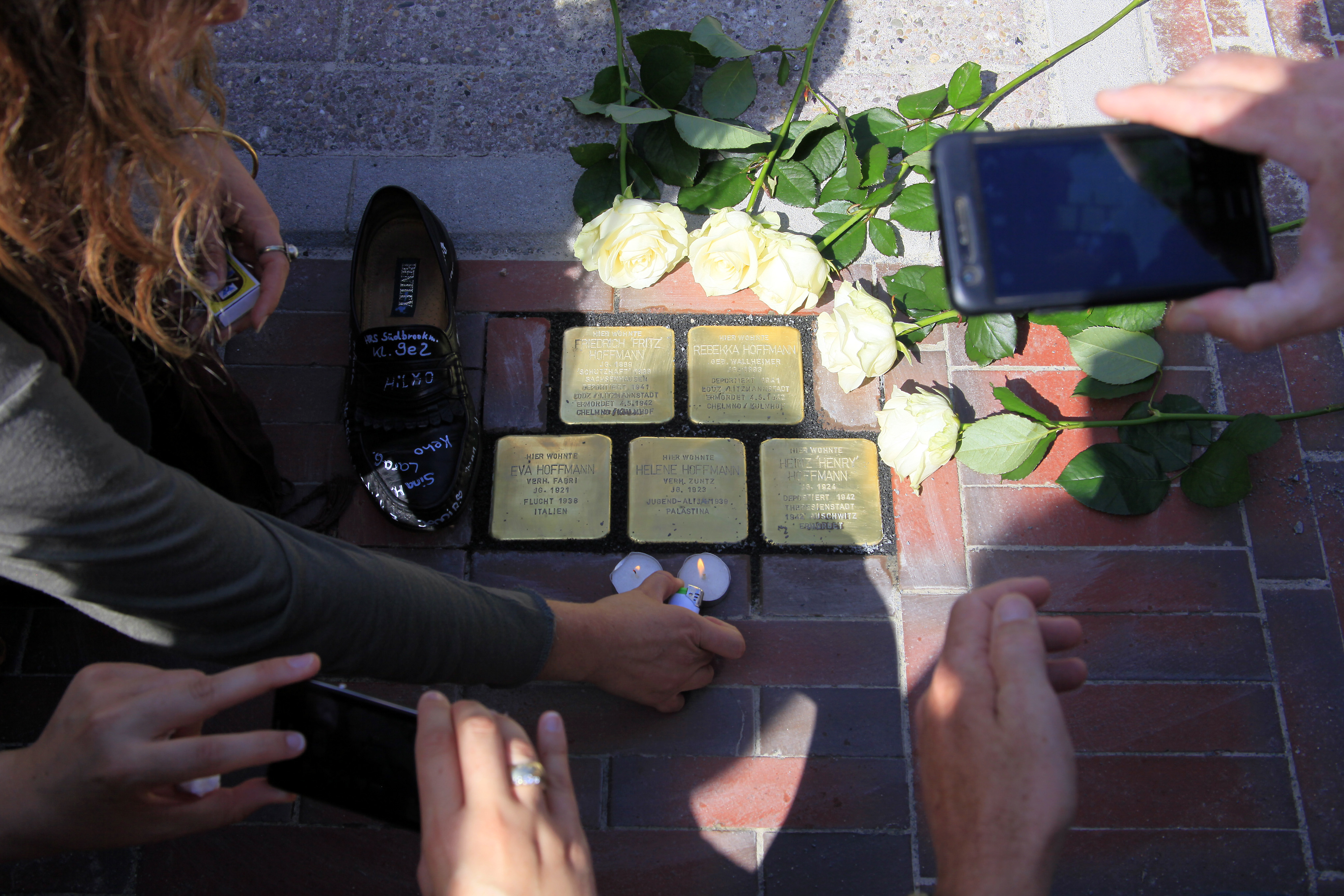 Friedrich (Fritz) Hoffmann – Wallstraße 19 Pate: Johann Peter Schmidt Rebecca Hoffmann geb. Wallheimer – Wallstraße 19 Pate: Volkstanzgruppe des Auricher Heimatvereins Eva Hoffmann verh. Fabbri – Wallstraße 19 Paten: Uwe und Elke Hemmelskamp Helene Hoffmann verh. Zuntz – Wallstraße 19 Pate: Hans-Gerd Meyerholz Heinz (Henry) Hoffmann – Wallstraße 19 Pate: Klasse 9E2 Realschule MoordorfJörg Peters und Schüler der Realschule Moordorf tragen die Biografien der Familie Hoffmann vor. Die Schüler haben ein Plakat zum Leben von Heinz „Henry“ Hoffmann erstellt und als Zeichen ihrer Anteilnahme einen Schuh (in Erinnerung an die eingesammelten Schuhe der Opfer) mit ihren Namen versehen.In bewegenden Worten erzählt die jüngste Tochter von Helene Zuntz, Miriam, von ihrer Mutter, die zuletzt als Leni Zuntz in Israel lebte und dort vor einigen Jahren starb. Zur Verlegung der Steine für ihre Angehörigen waren 20 Nachfahren der Familie, darunter alle fünf Kinder von Helene Zuntz, aus Israel angereist.Und hier die gesamte Klasse 9E2 der Realschule Moordorf (von links nach rechts): Herr Theilen (Klassenlehrer), Marvin van Echten. Jens Caspers, Jann Kruse, Hendrik Zohrabian, Keno Dettmers, Dennis Ley, Marina Brockmann, Imko Jaske, Lara Gerdes, Nesaja Niemann, Hilko Albers, Sina Memenga, Sadet Sulejmani, Patric Pascal Kielblock, Sandra Schütte, Denise Quidde, Fenna Grensemann, Julia Eckhoff, Frau Zureck.Die Volkstanzgruppe des Auricher Heimatvereins hat die Patenschaft für den Stein für Rebecca Hoffmann geb. Wallheimer übernommen.
