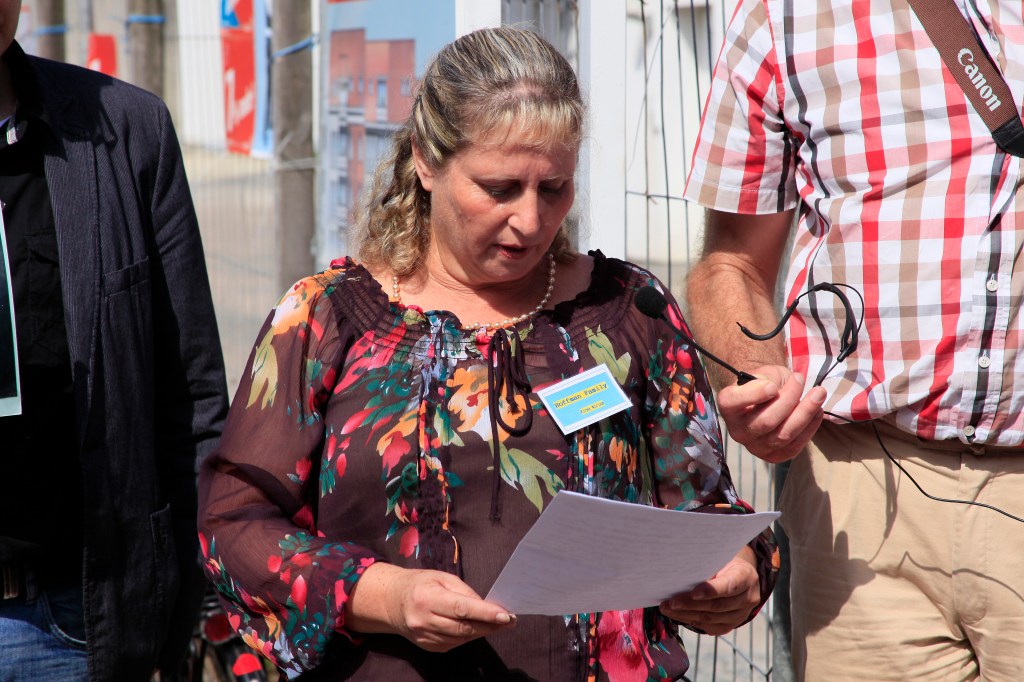 Hugo Kussel – Marktstraße 2 Pate: Stefan Schewiola Marianne Kussel geb. Wolff – Marktstraße 2 Pate: Fraktion „Gemeinsam für Aurich“ im Auricher Stadtrat Netta Kussel verh. Beil – Marktstraße 2 Pate: SPD-Fraktion im Auricher Stadtrat Elfriede Kussel – Marktstraße 2 Paten: Dr. Sandra Weferling und Heiko SchlakeWährend Gunter Demnig mit den Schülern der Berufsfachschule Bautechnik die Verlegung der Stolpersteie vornimmt, berichtet Frau Dr. Weferling über die Biografien der Familienmitglieder der Familie Kussel.