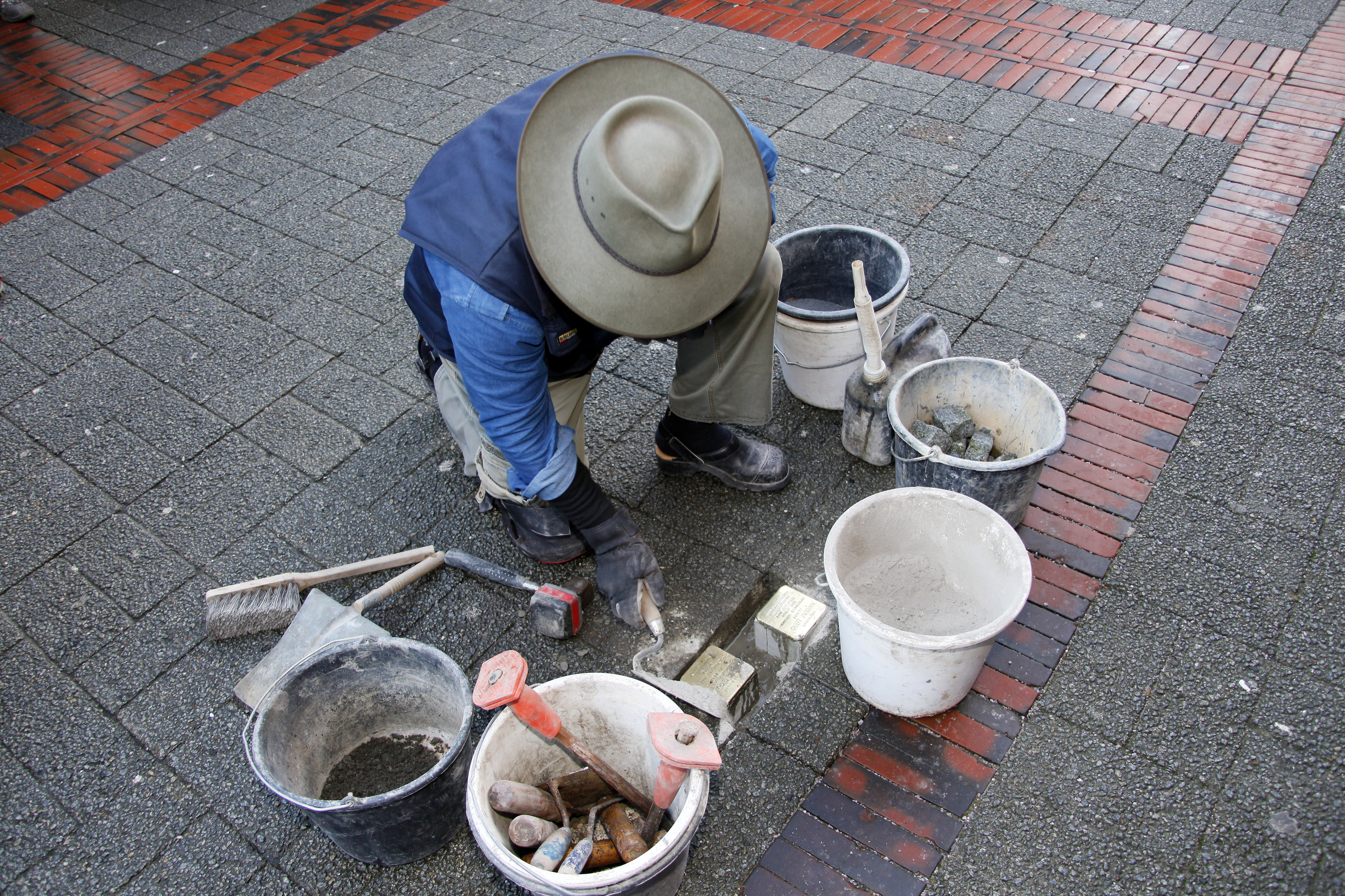 Weitere Steine werden am benachbarten Eingang verlegt.