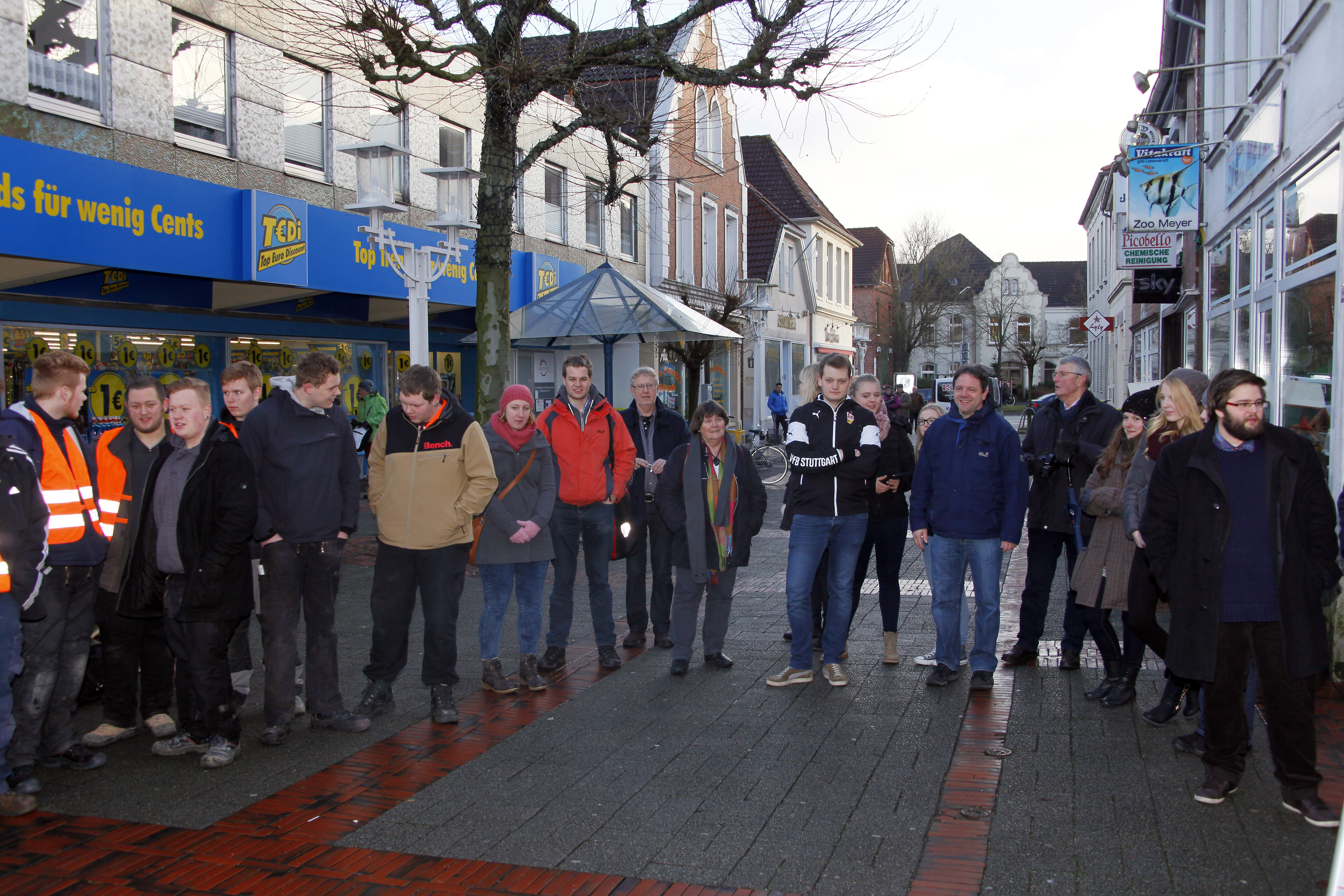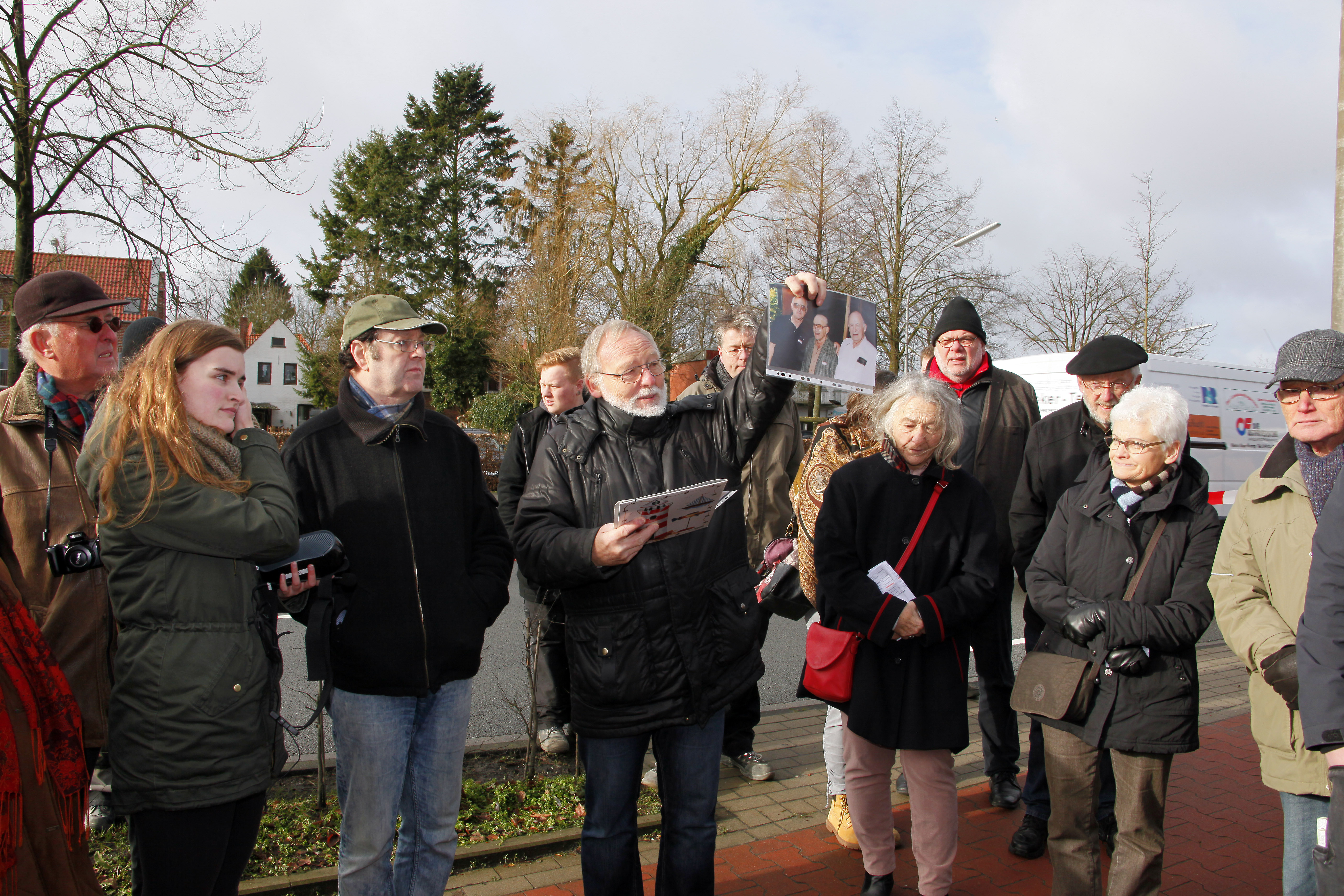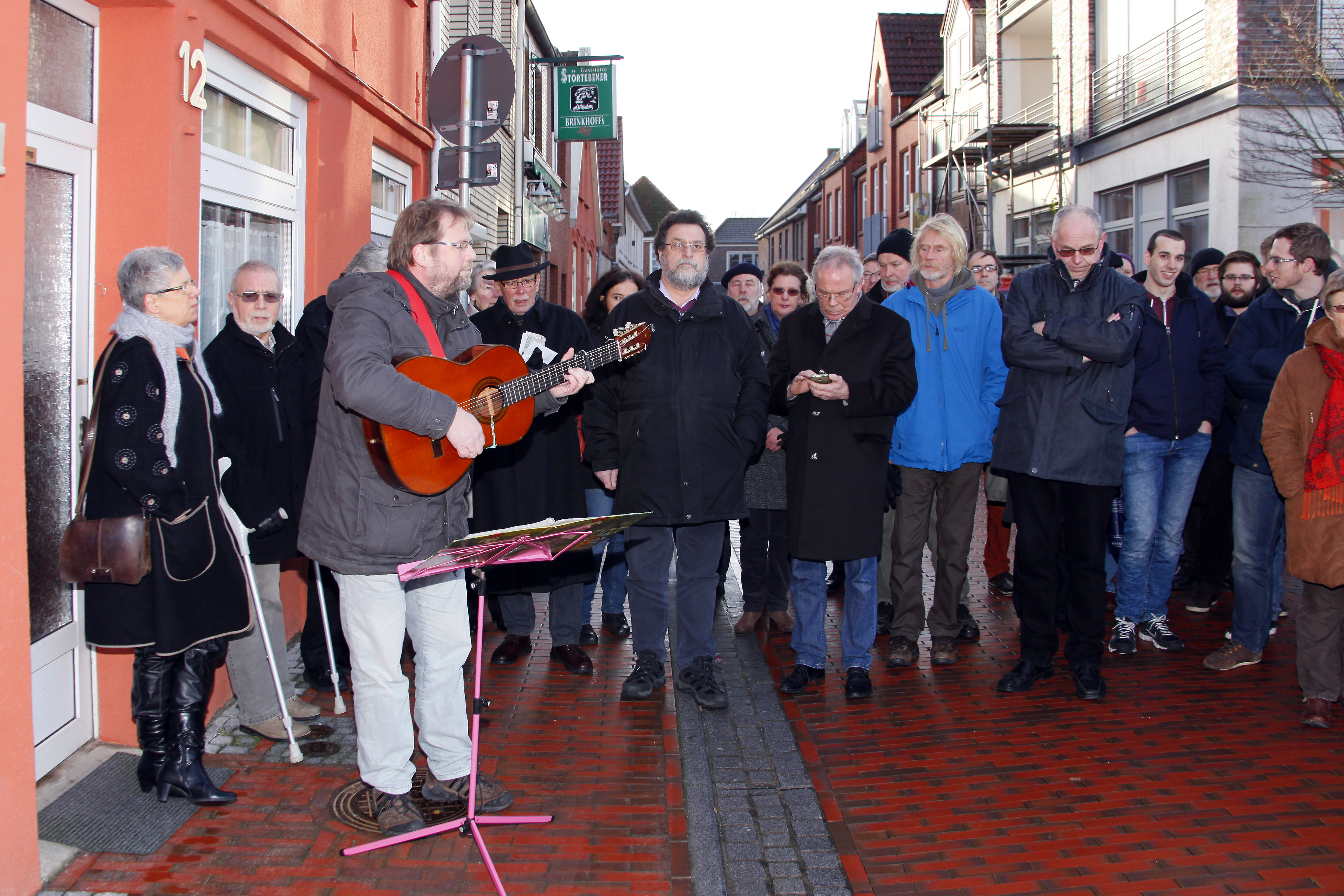 Gunter Demnig vor dem Haus Osterstraße 30 und die dort versammelten Teilnehmer der Verlegung