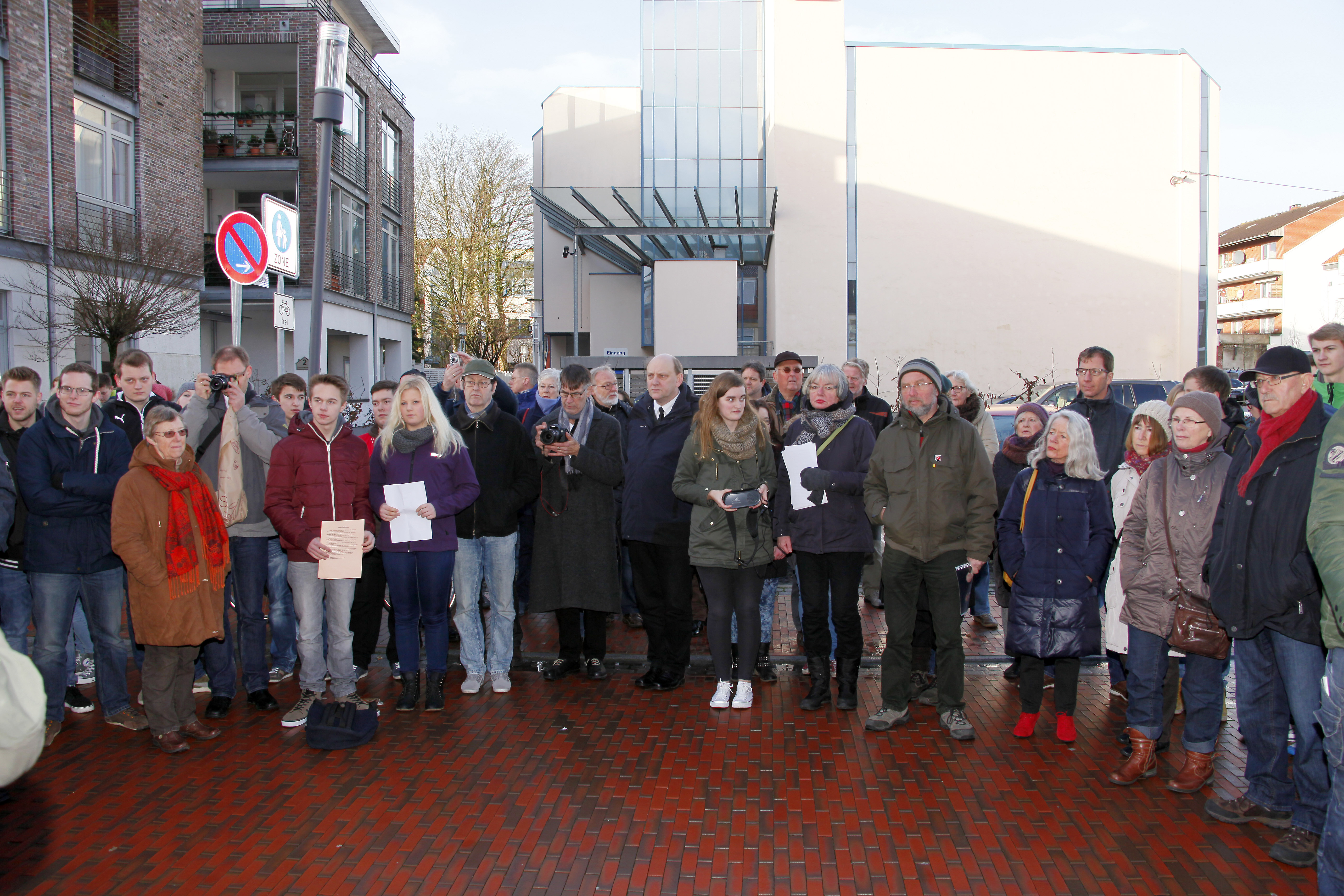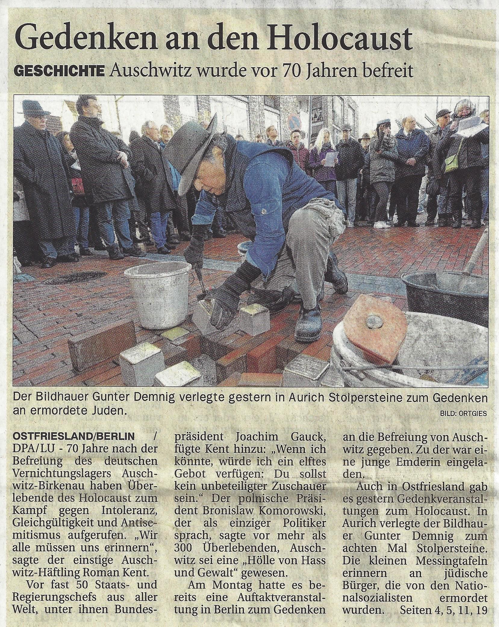 Am Nachmittag dieses Tages, dem 70. Jahrestag der Befreiung des KZ Auschwitz, wird im Gemeindezentrum der ev. – ref. Kirchengemeinde eine Ausstellung zu den Biografien der Opfer, für die heute Stolpersteine verlegt wurden, eröffnet.