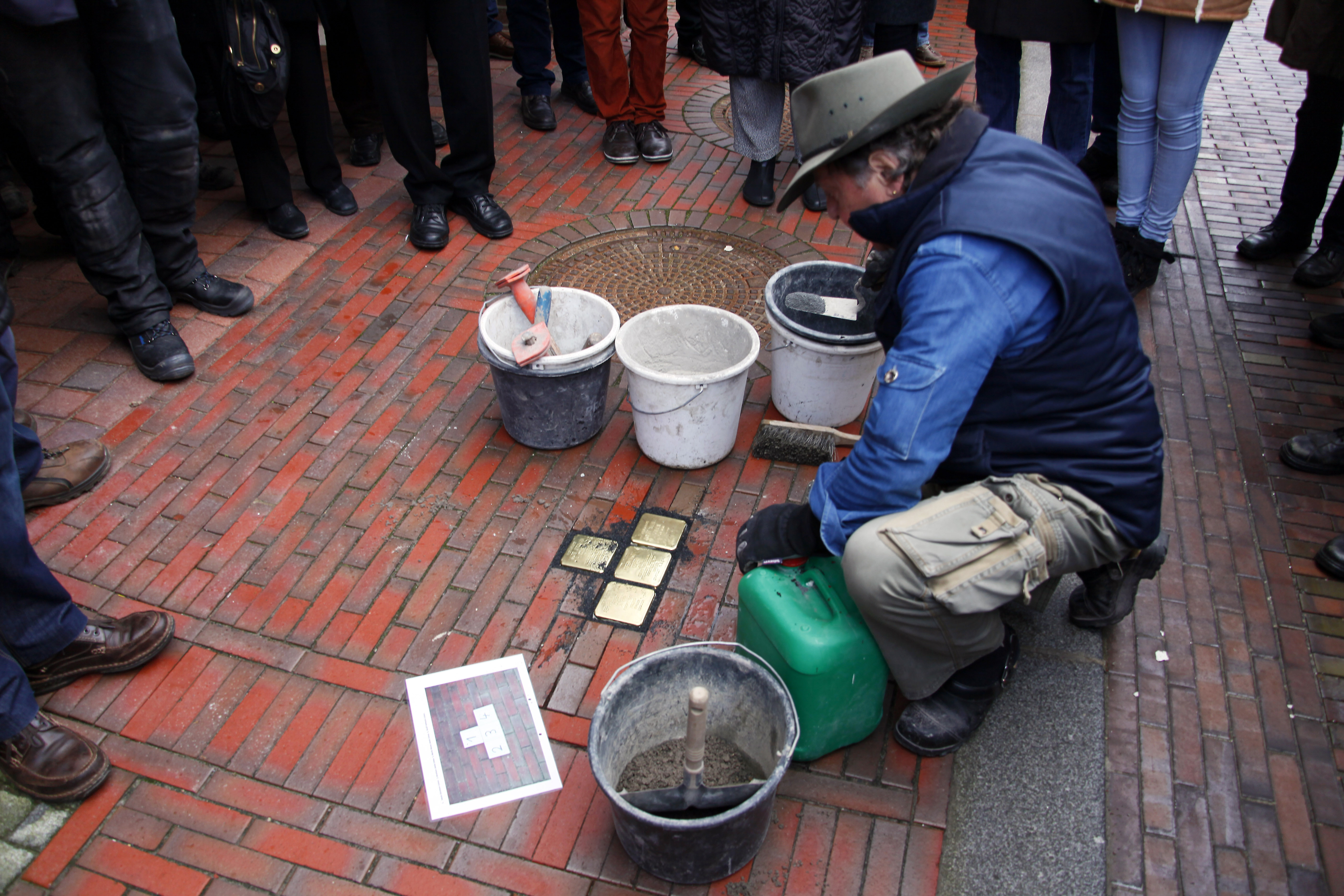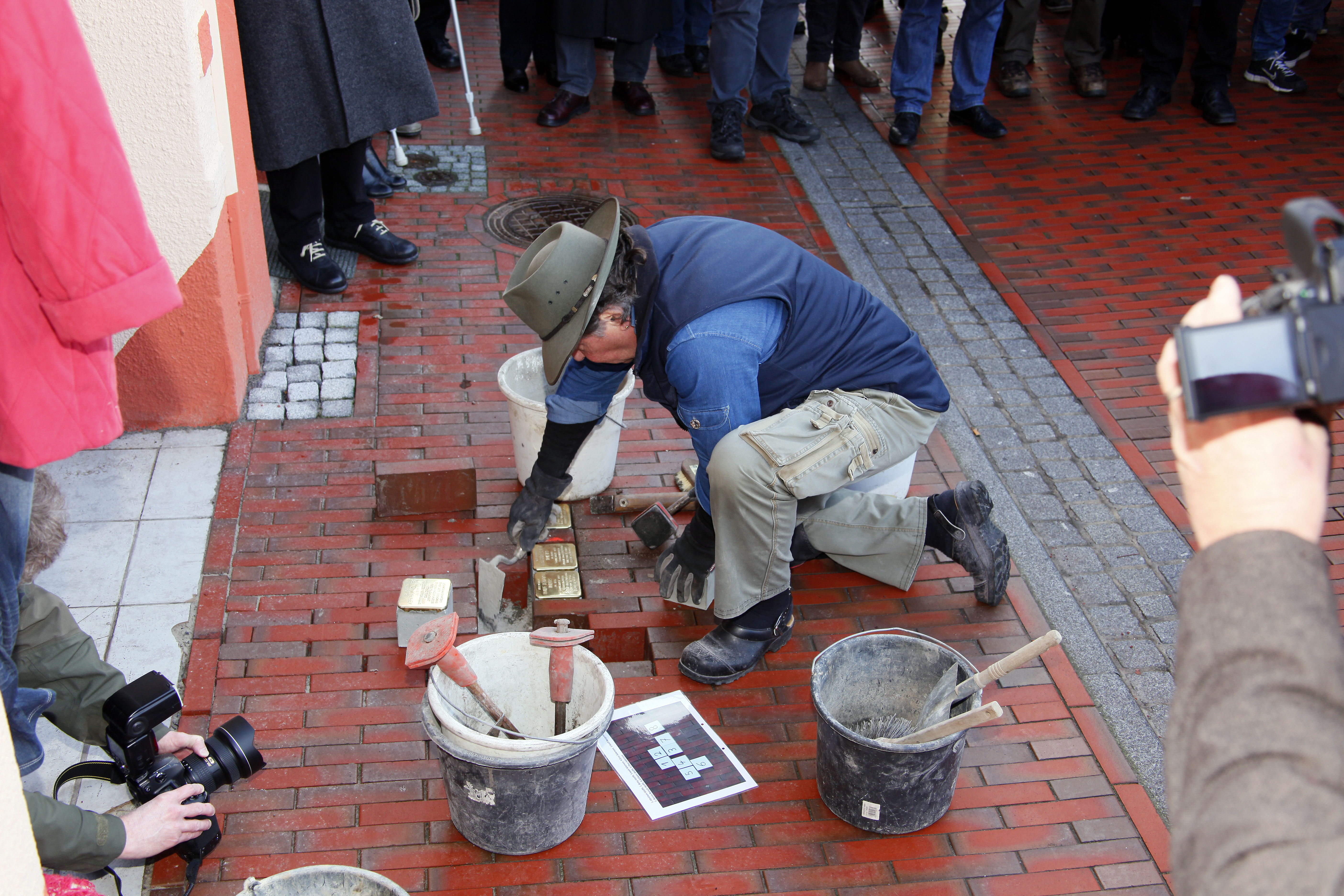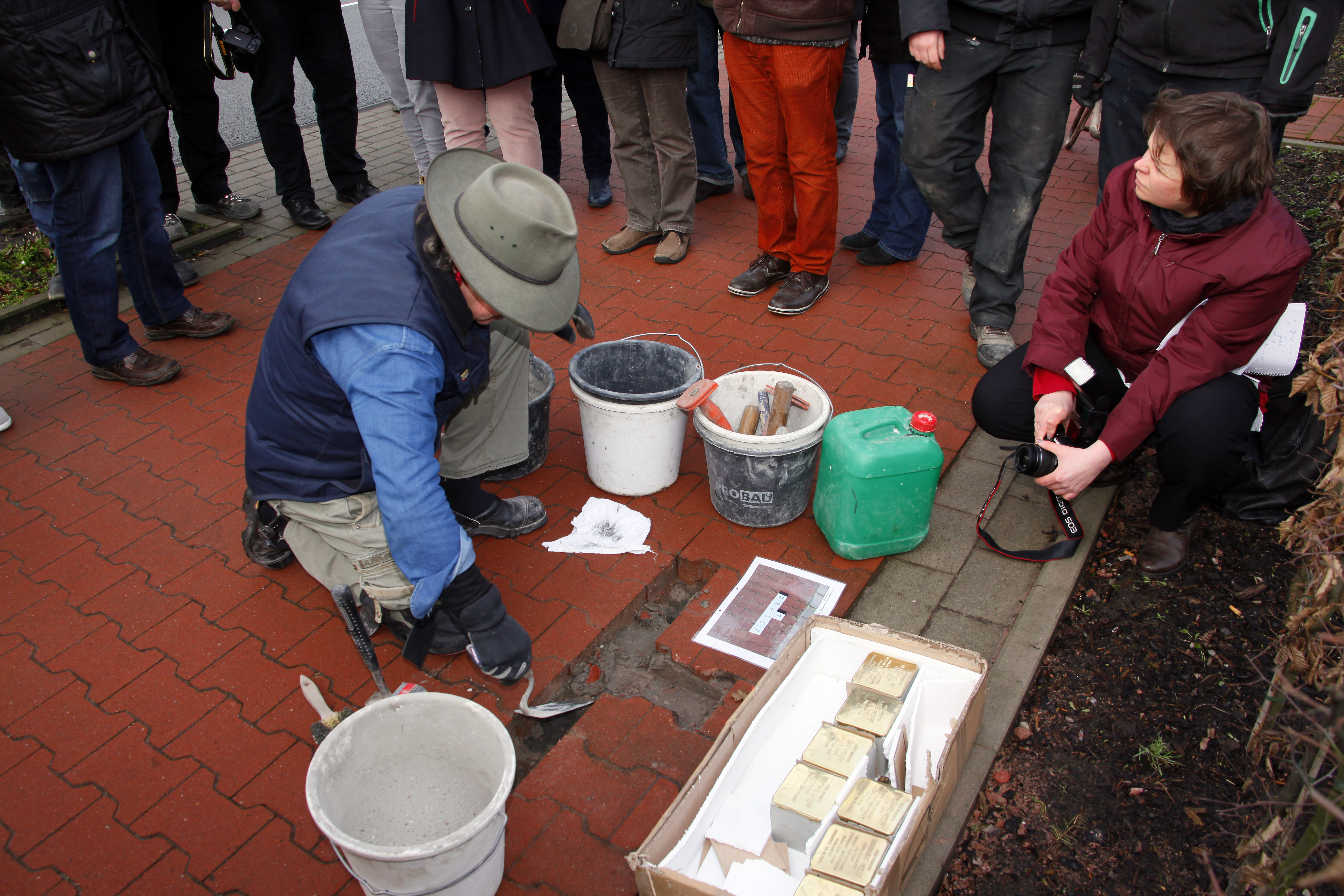 Rechts: Gunther Demnig bei derVerlegearbeit vor der Großen Mühlenwall Str. 1