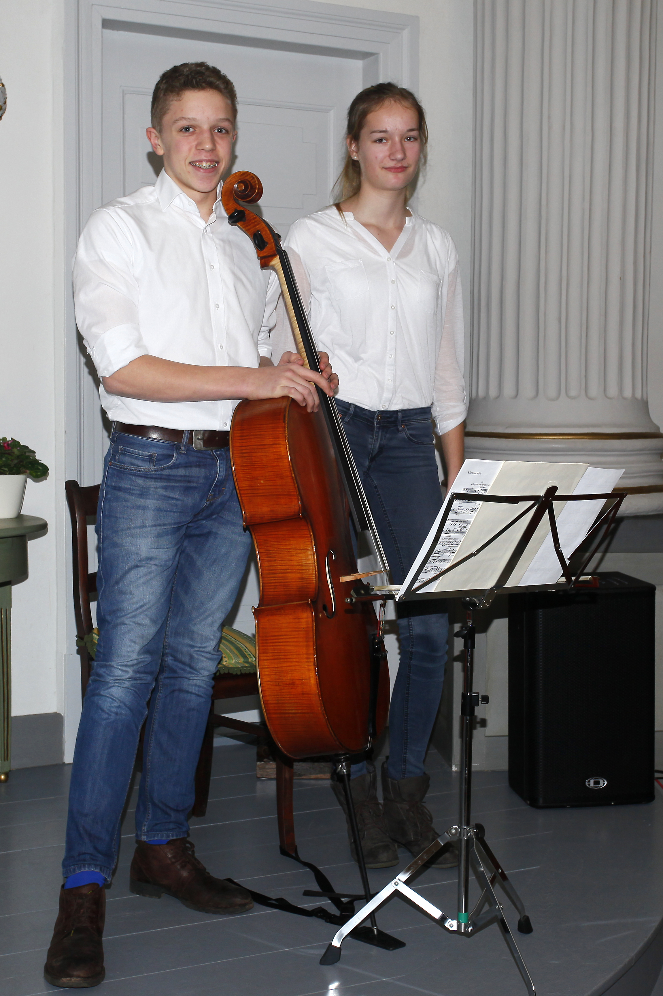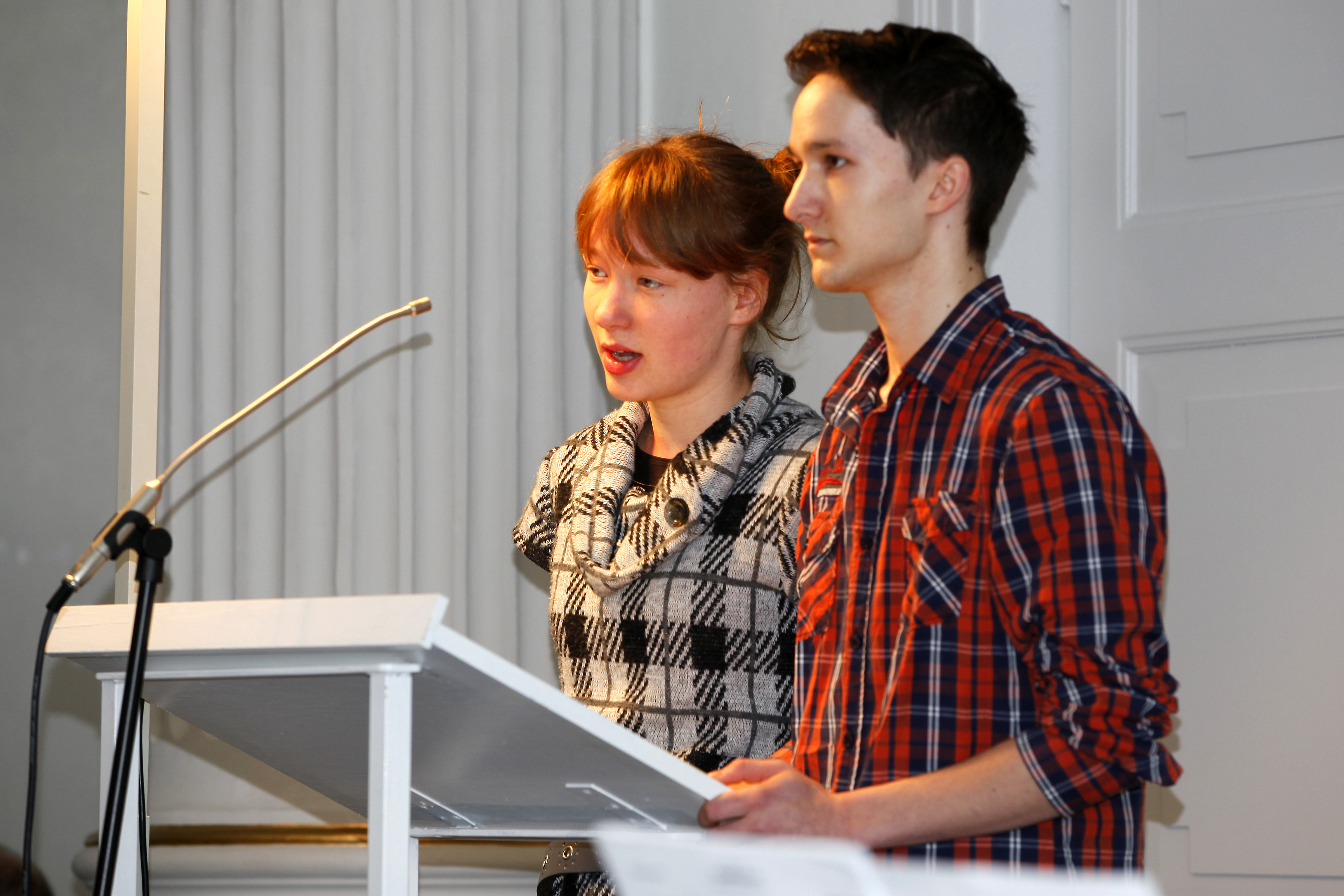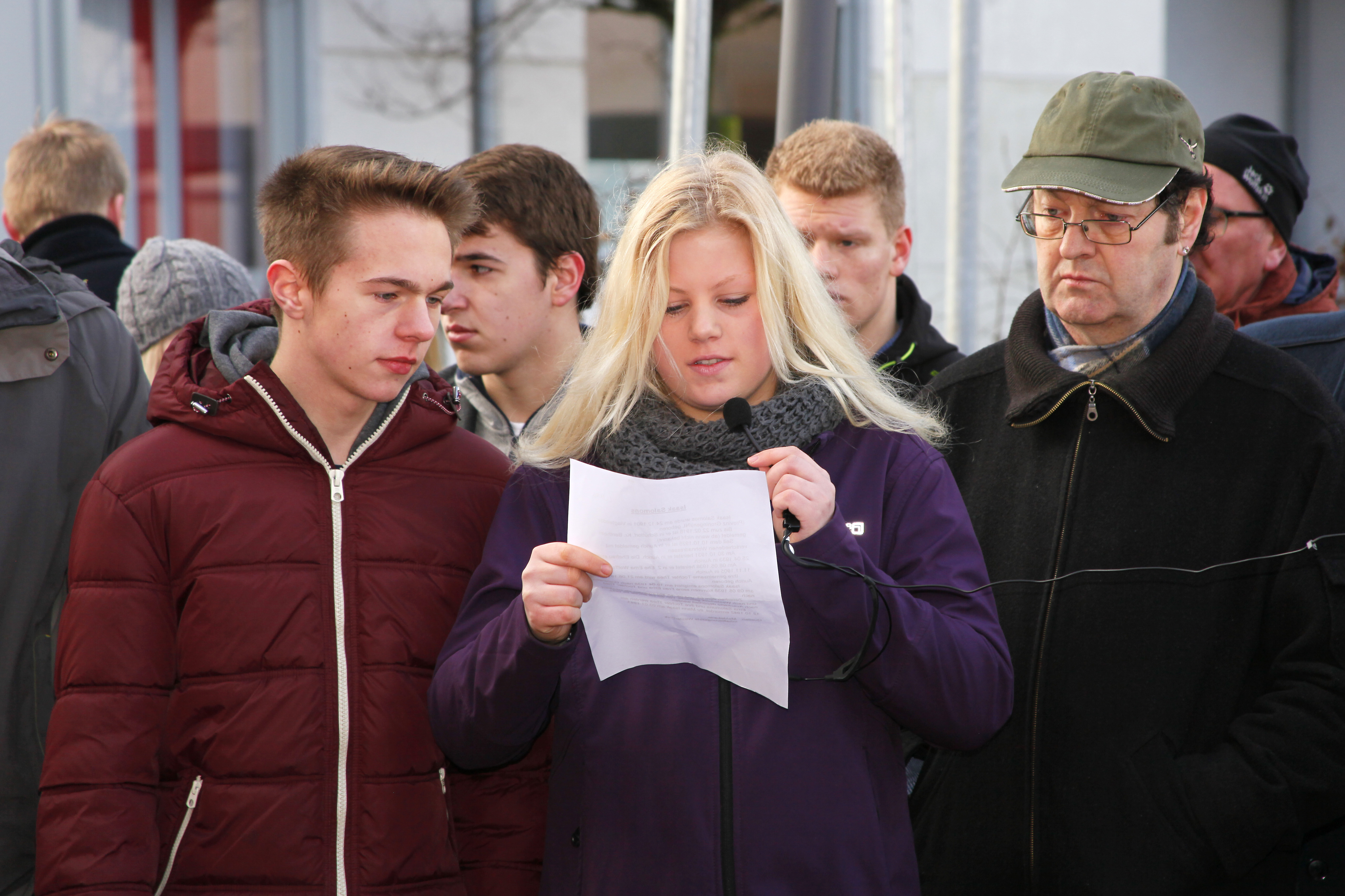 Links: Laura Lindena und Florian Linnemann von der Kirchengemeinde Victorbur (Patin für Thea Salomons) verlesen die von der Jugendgruppe recherchierten Biographien von Familie Salomons.