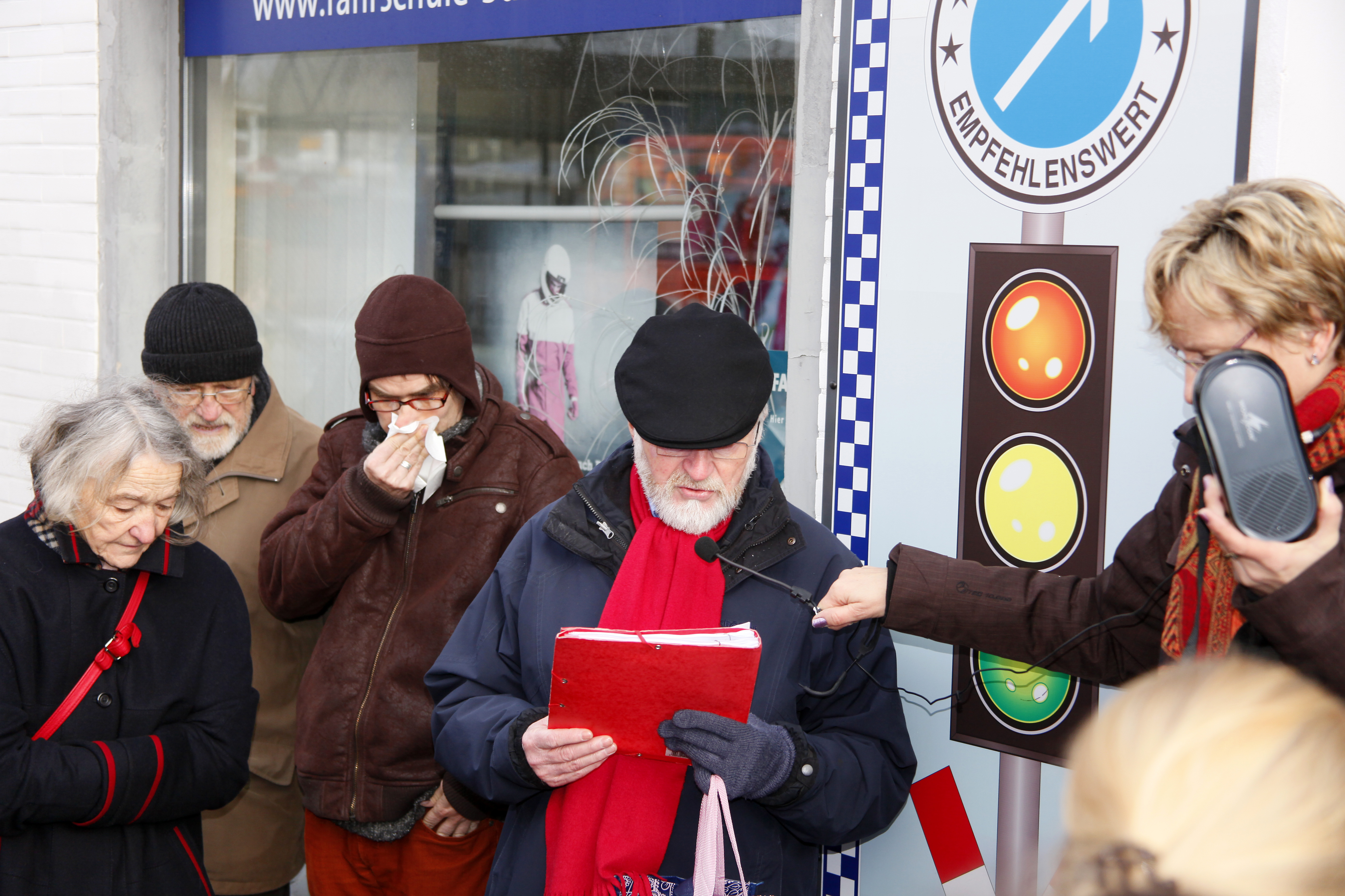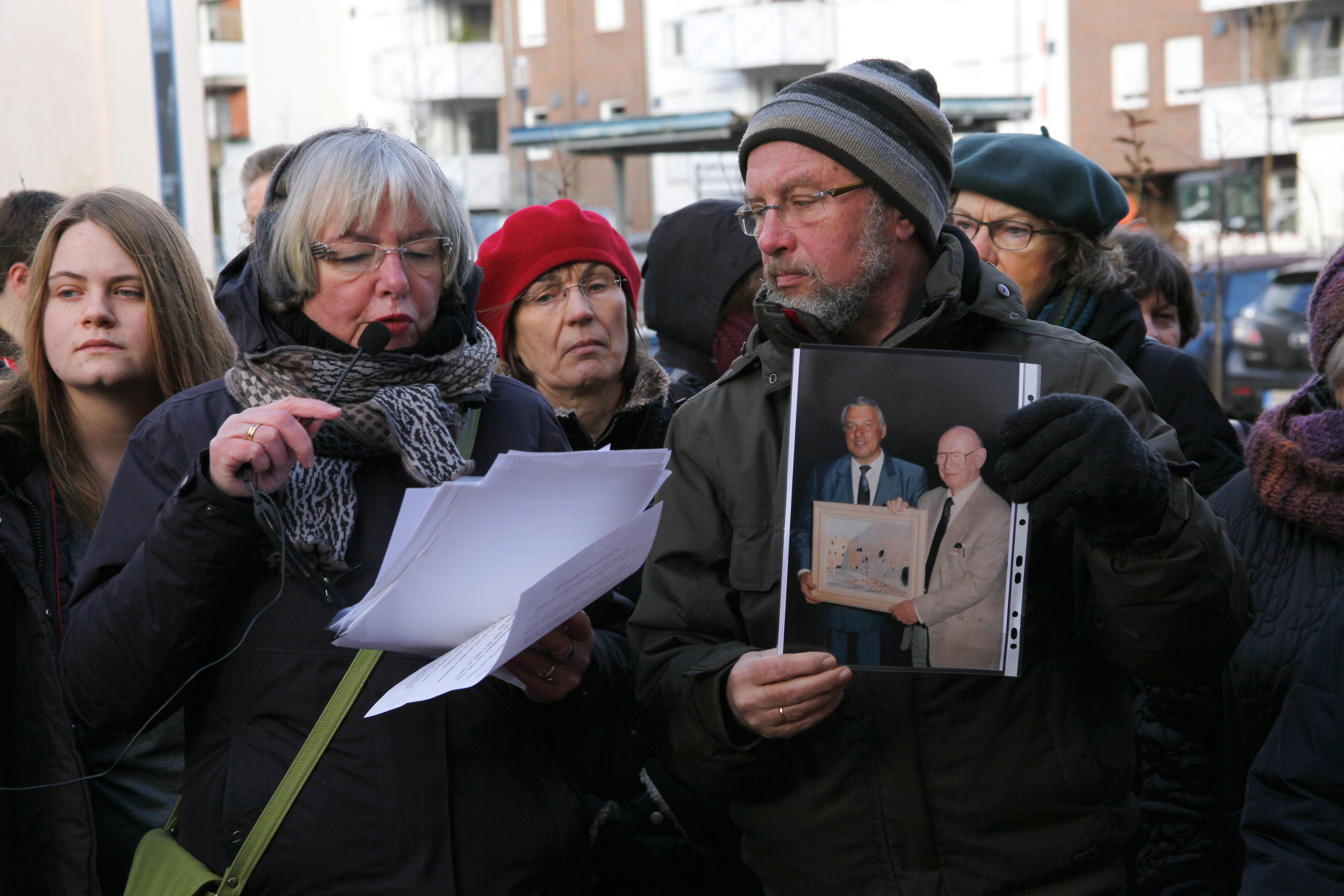Links: Hans-Jürgen Westermayer beim Verlesen der Biografie von Gelle Wolff.