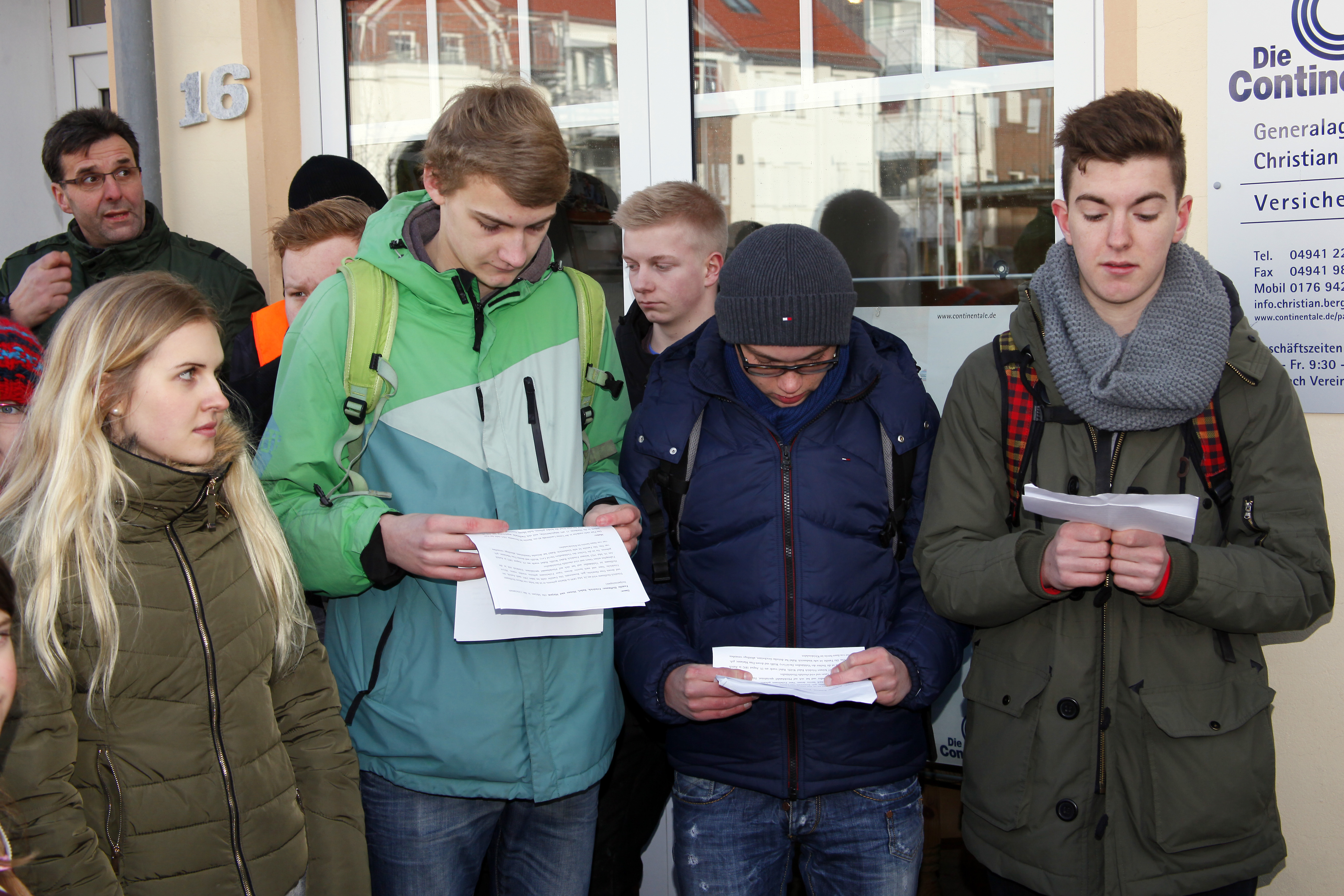 Rechts: Lynn Frühling, Dirk Zimmermann, Mattes Schmidt und Timon Uecker vom Grundkurs Geschichte der Klasse 11 des Gymnasiums Ulricianum Aurich tragen die Biografien der Familie Hoffmann vor.