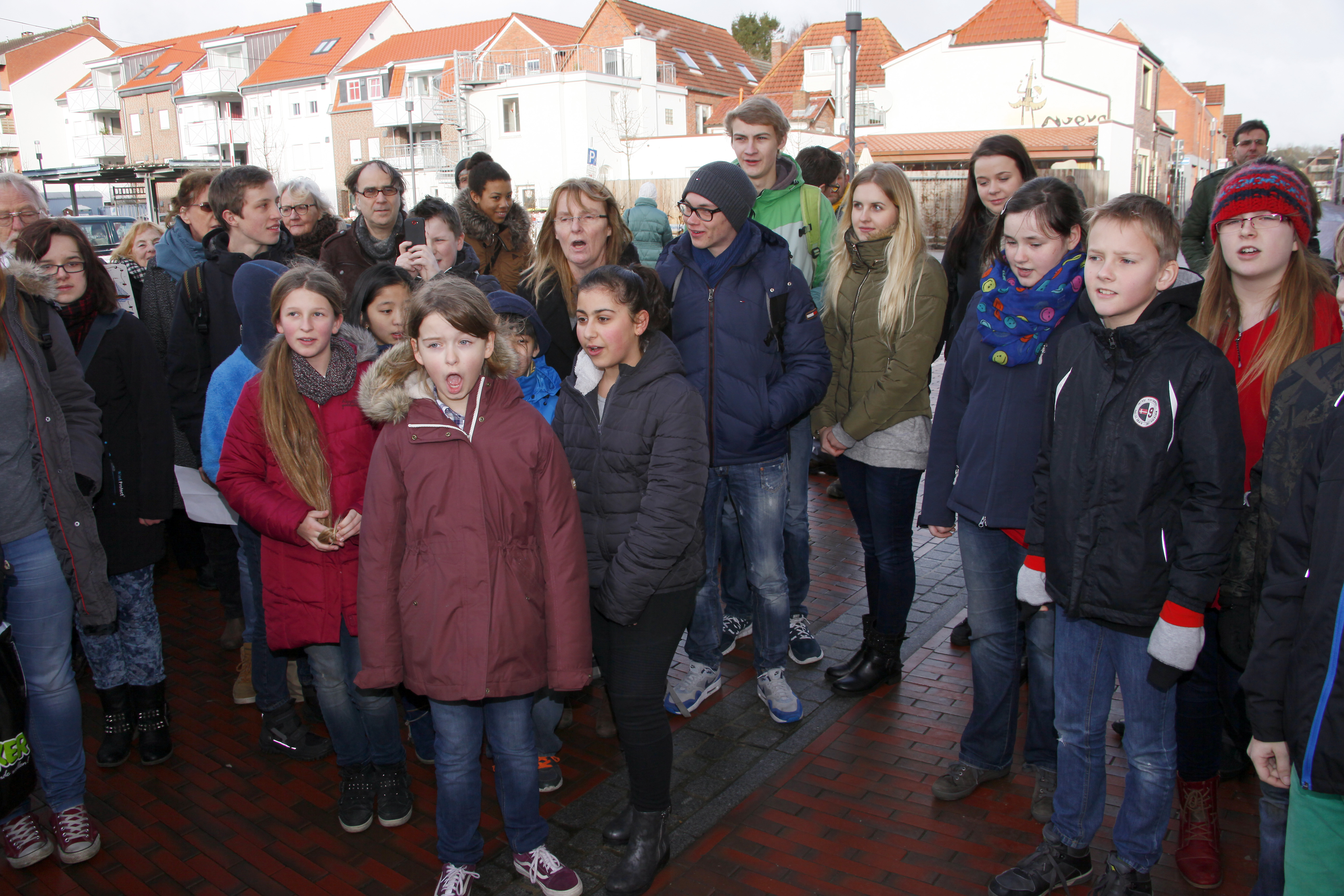 Rechts: Schüler des MTK-Kurses Musik, 5. Jahrgang Ulricianum, singen mit ihrer Lehrerin Jutta Glashoff das Lied „Schalom Chaverim“. Die anwesenden Teilnehmer sangen übrigens fast alle mit.