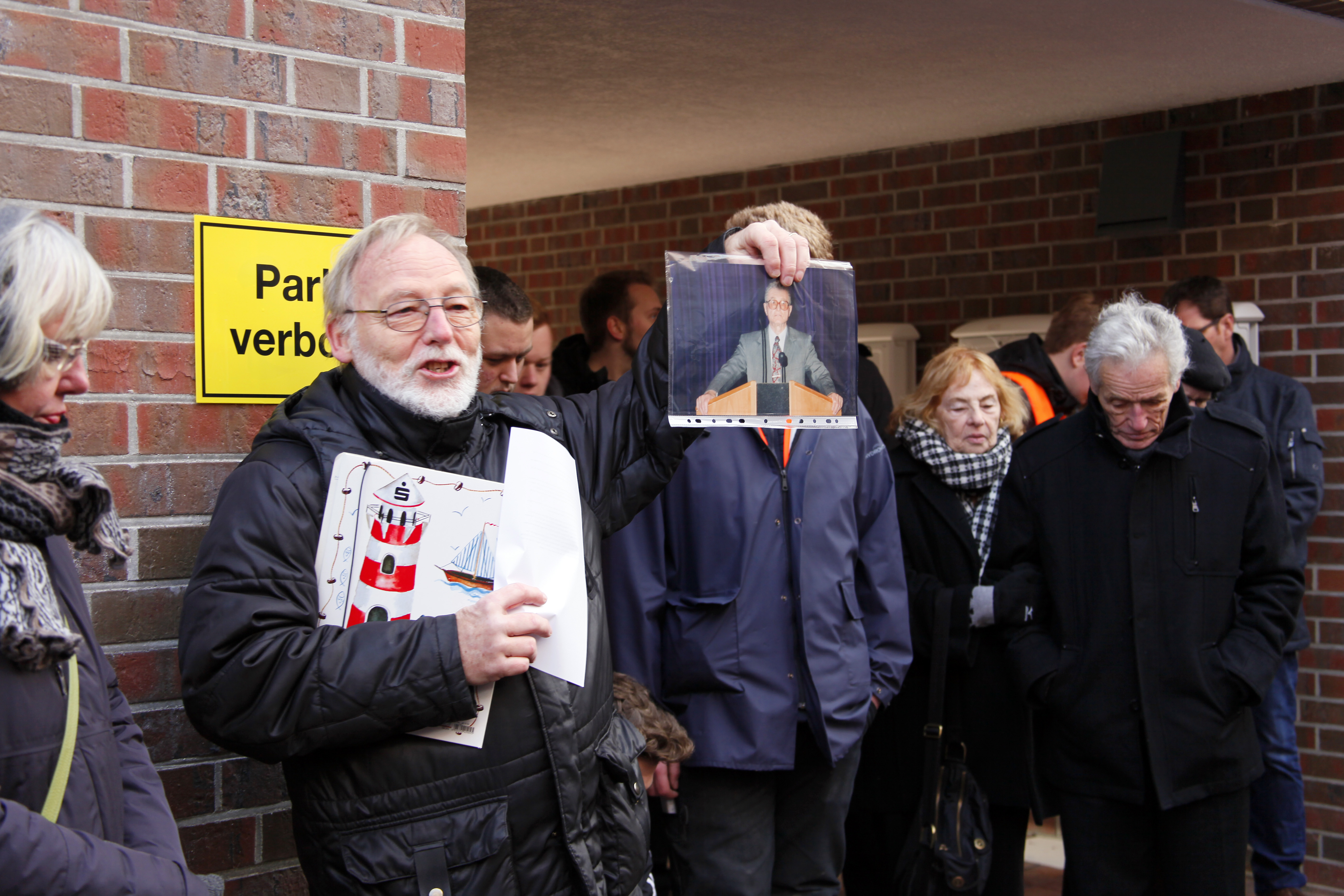 Links: Hans-Jürgen Westermayer trägt die Biografien der Familie Cohen vor und zeigt ein Foto