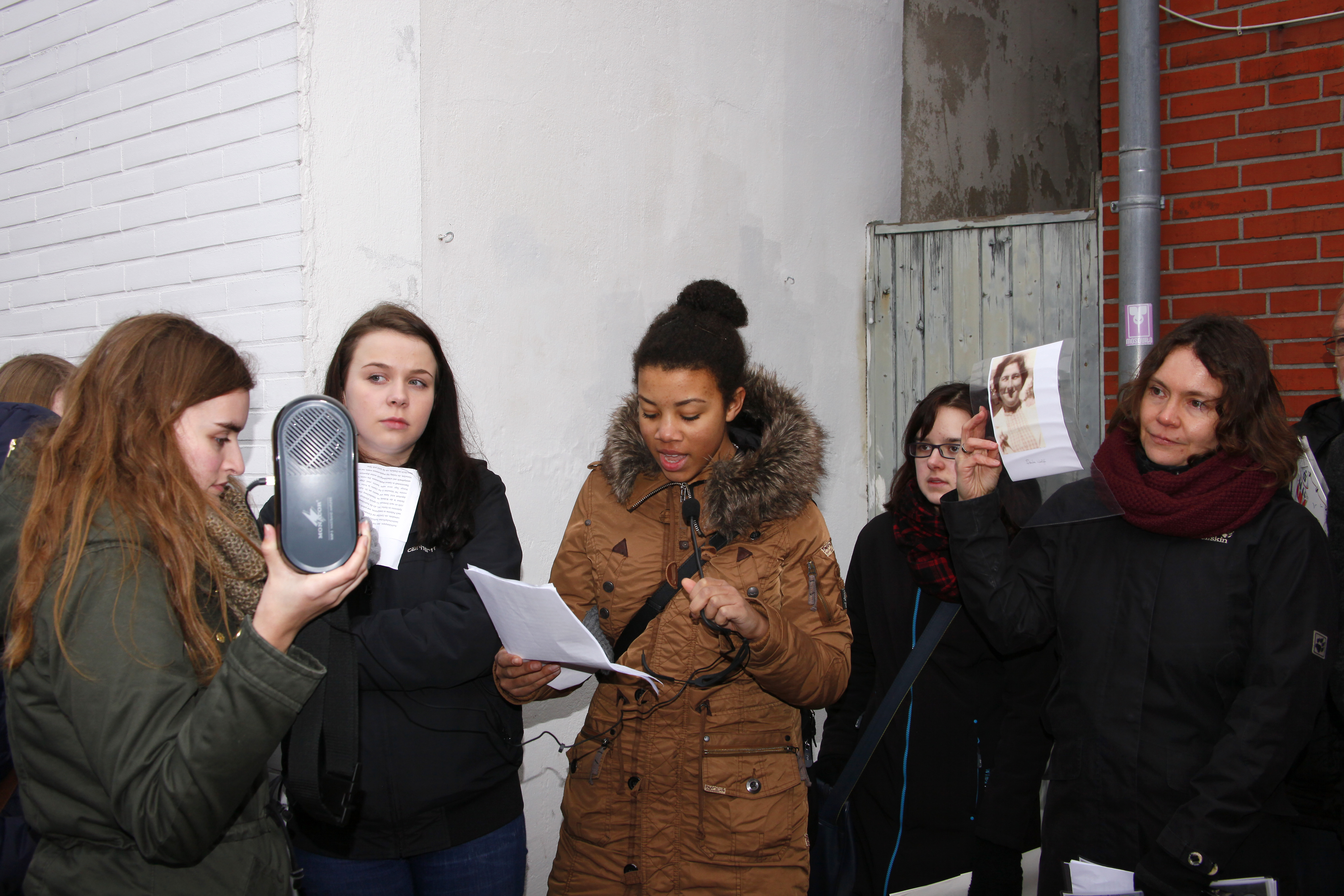 Rechts: Schülerinnen des Gymnasiums tragen die Biografien vor.