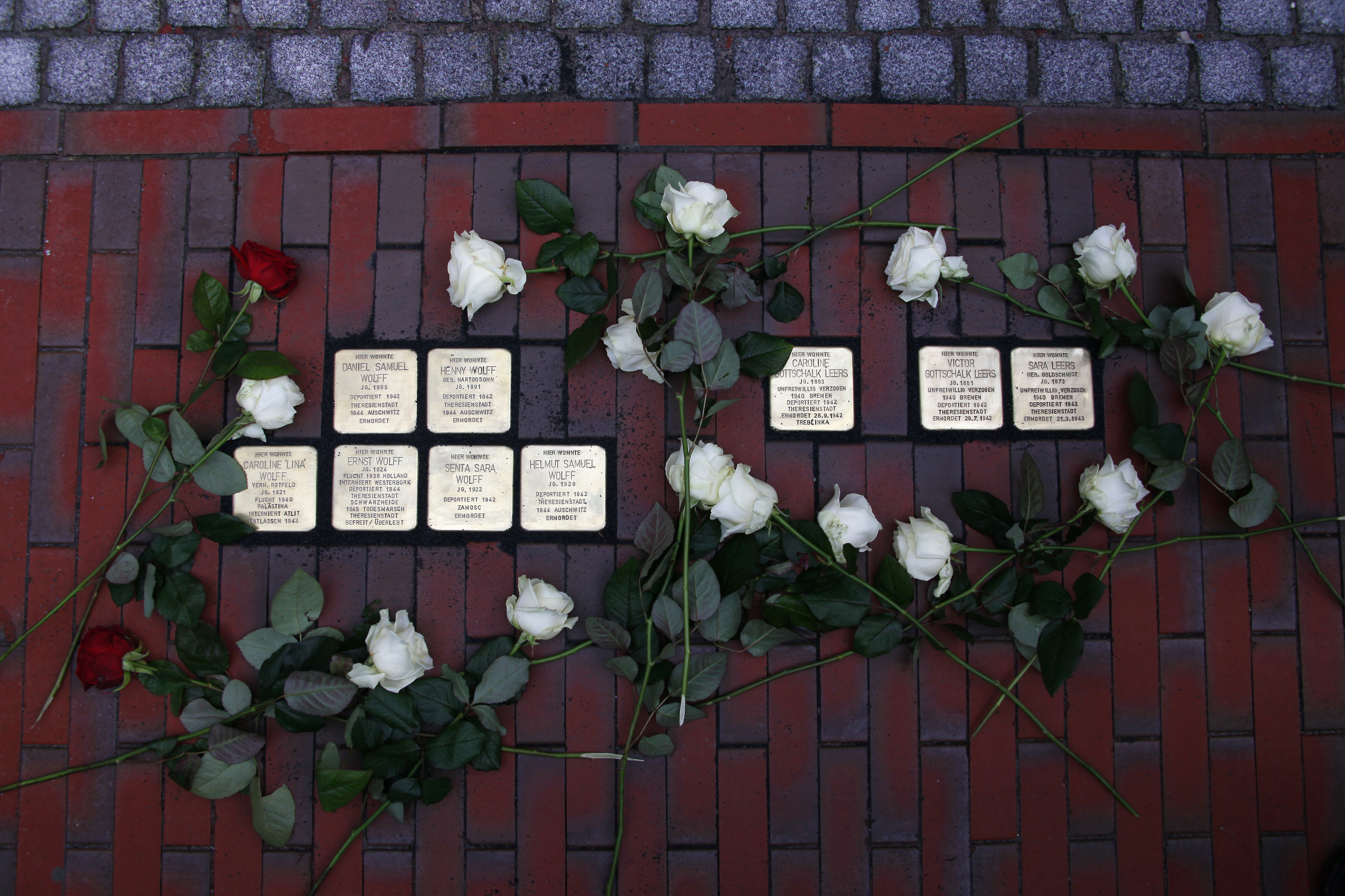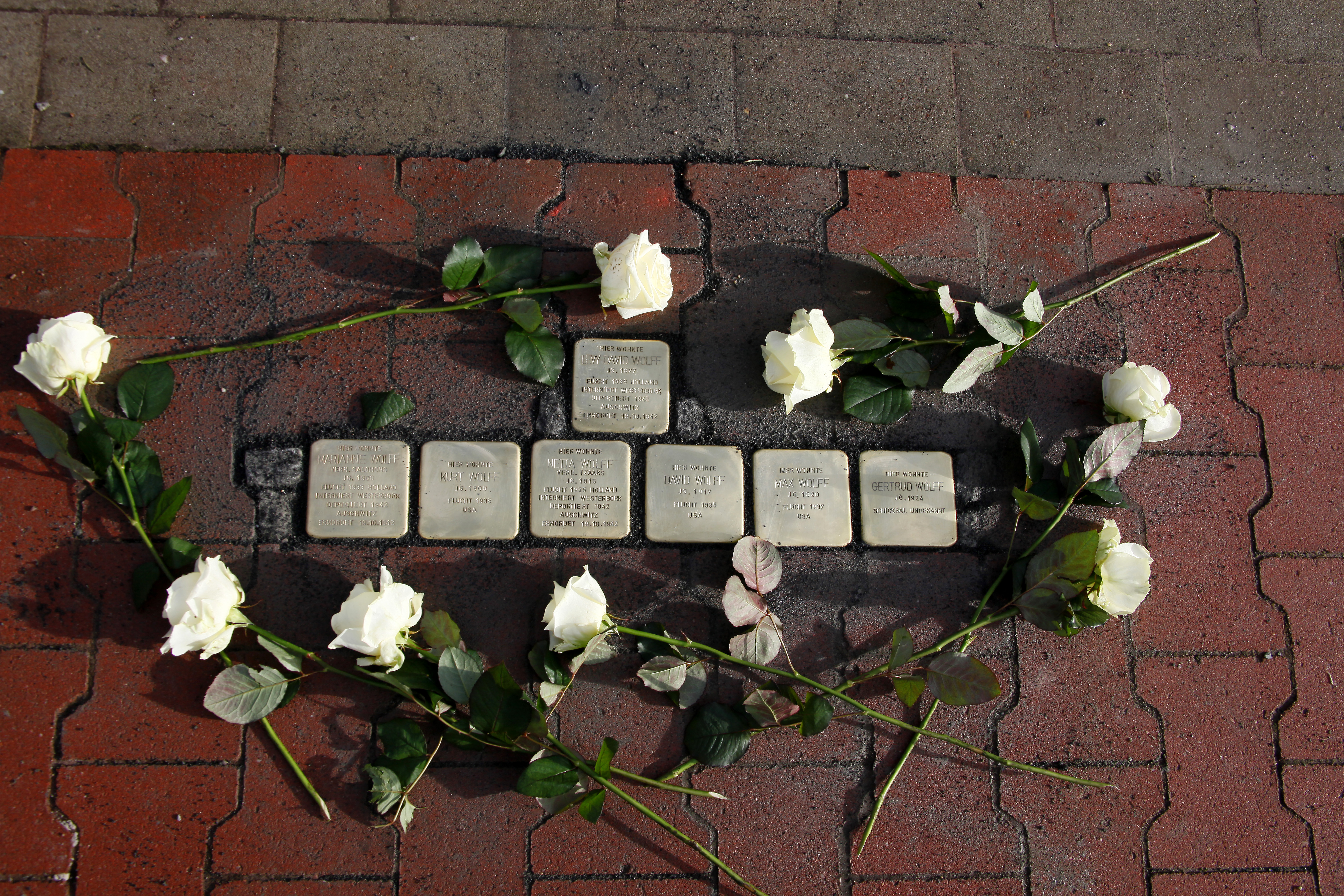 Rechts: Brigitte Weber und Jair Wolff legen Rosen bei der Steine für die Familie Cohen nieder.