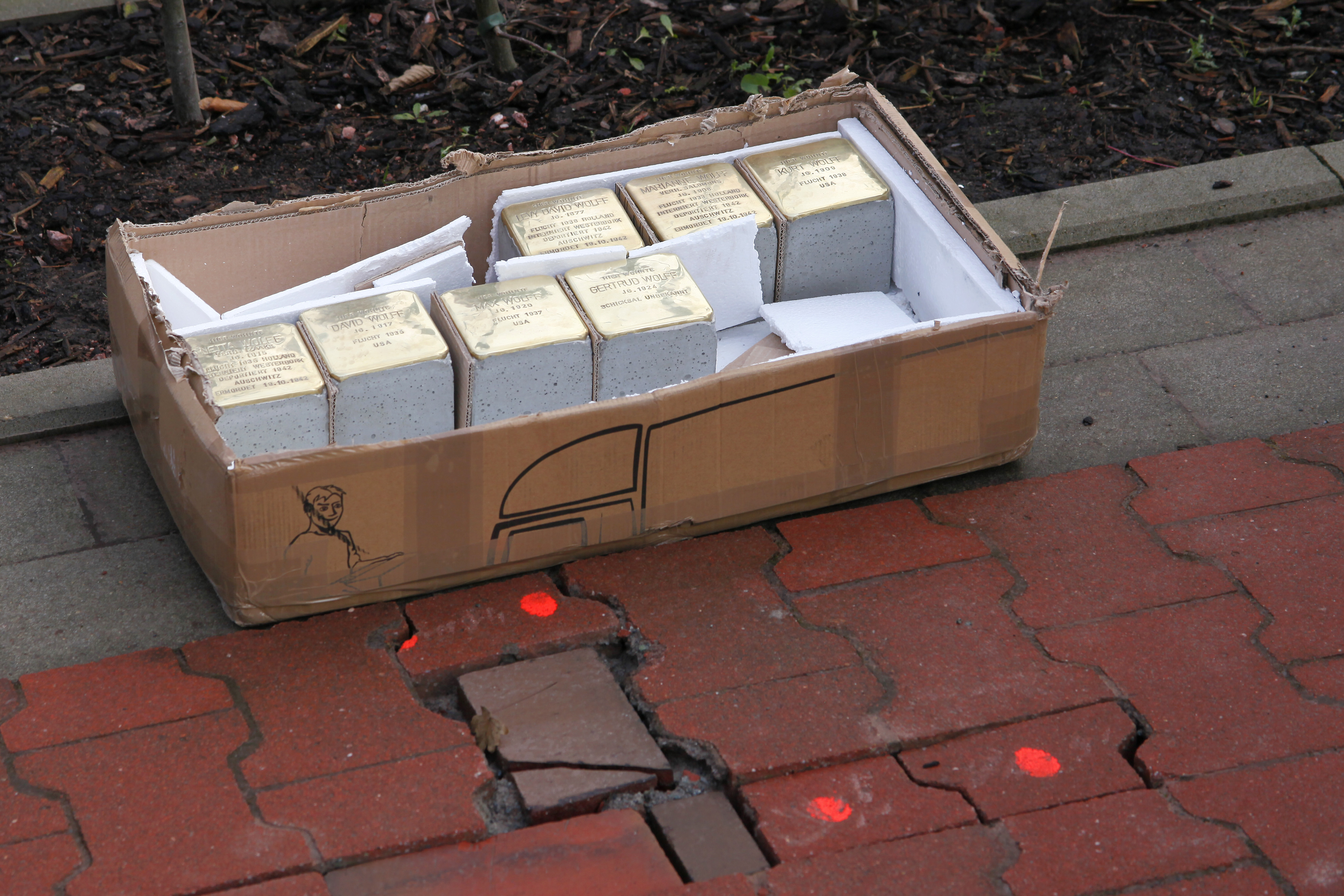 Links: Die Stolpersteine vor ihrer Verlegung an der Stelle, wo früher das Haus gestanden hat.