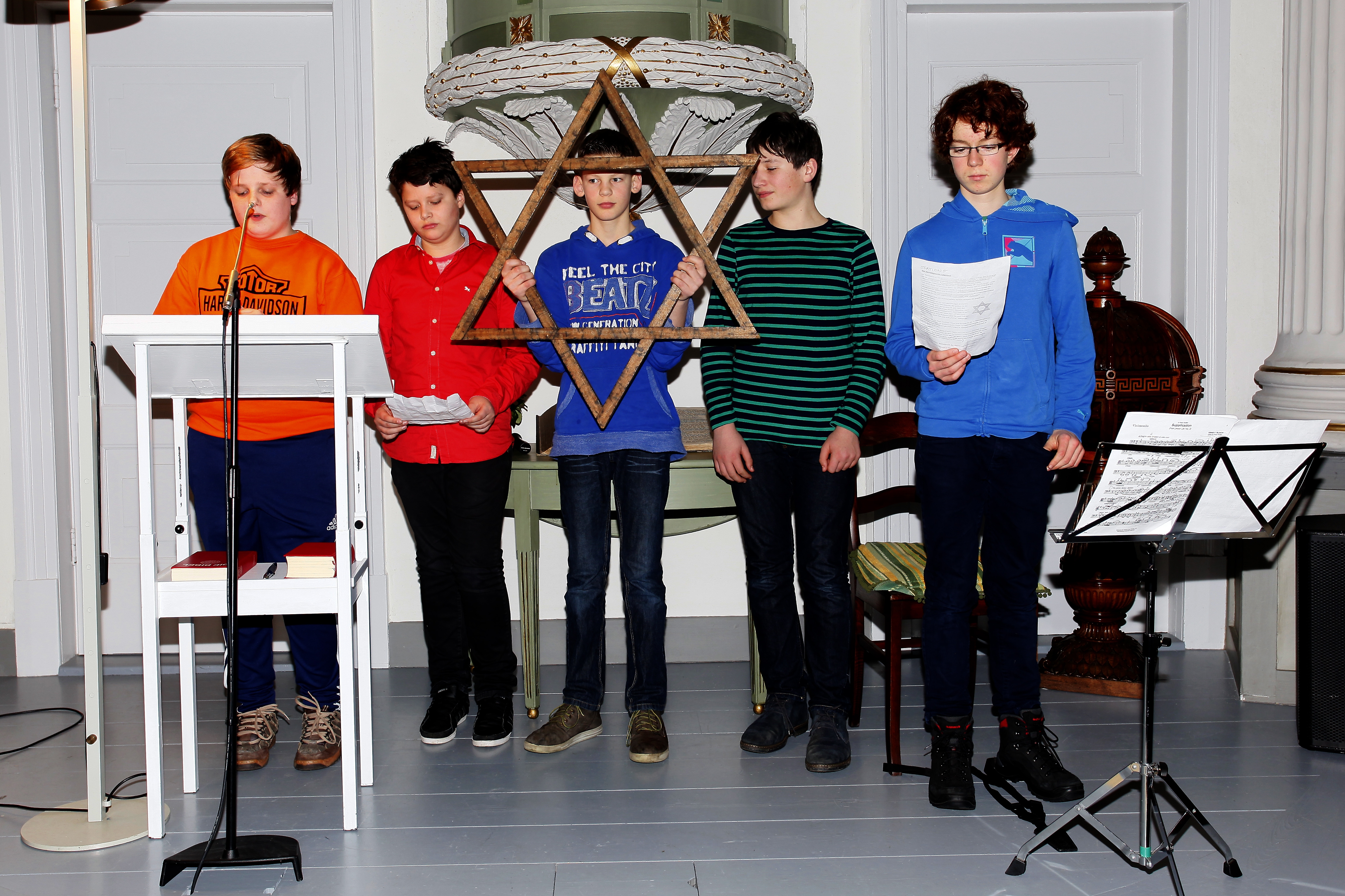 Links: Konfirmanden der ev.-ref. Gemeinde erläutern die Symbolik des Davidsterns.