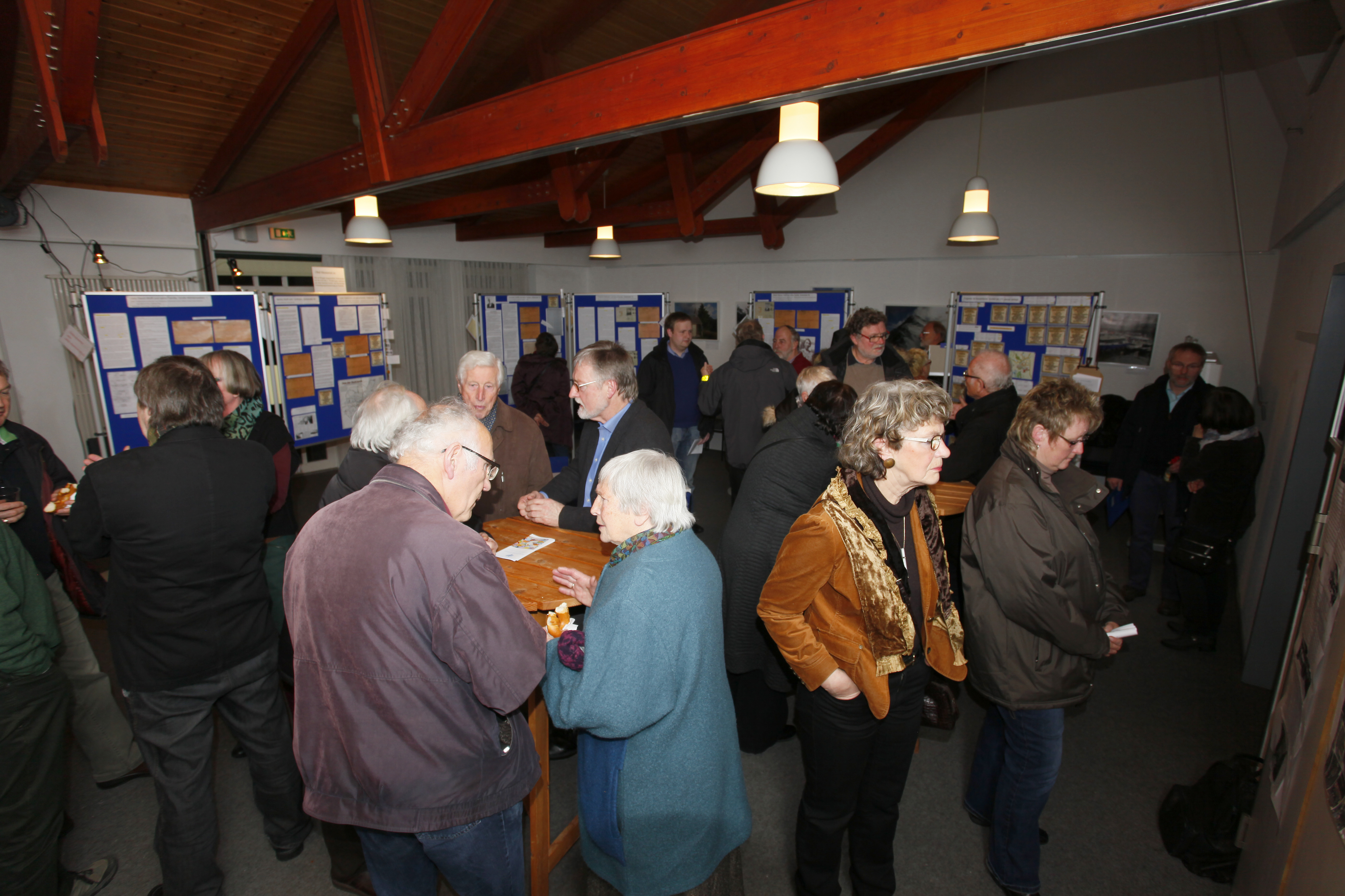 Nach der Feier findet die Ausstellung über die Auschwitzopfer in den Gemeinderäumen große Beachtung.