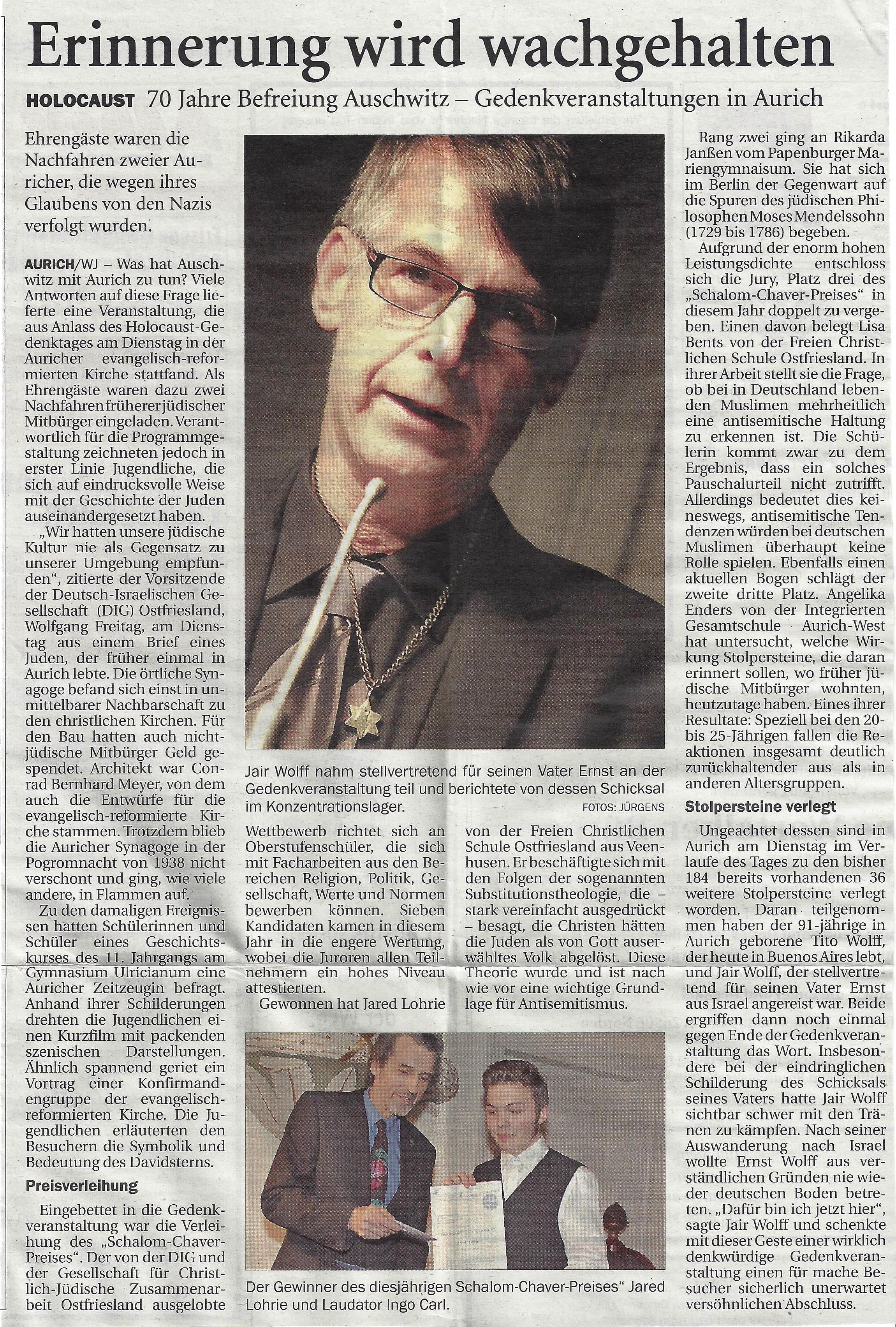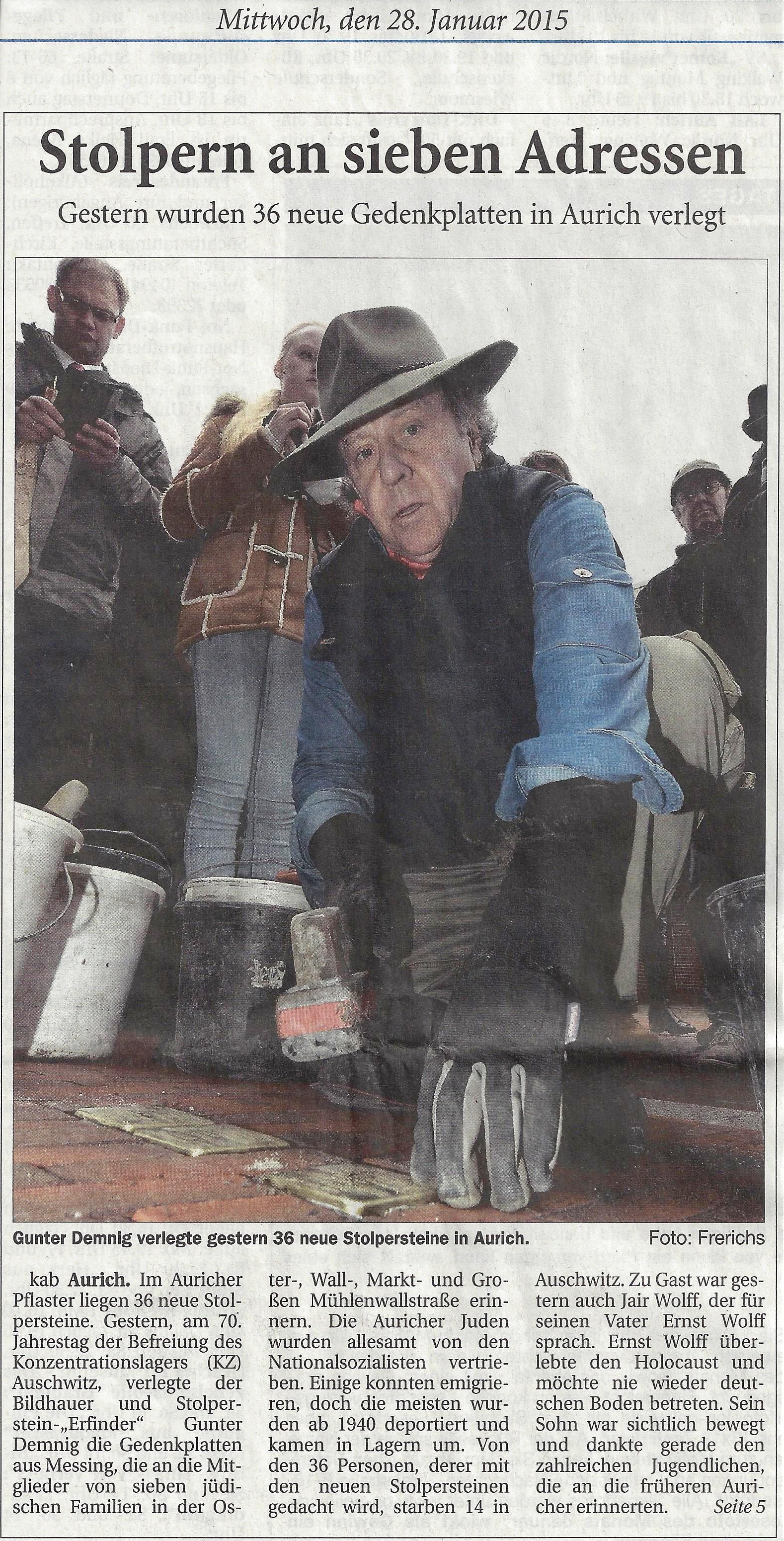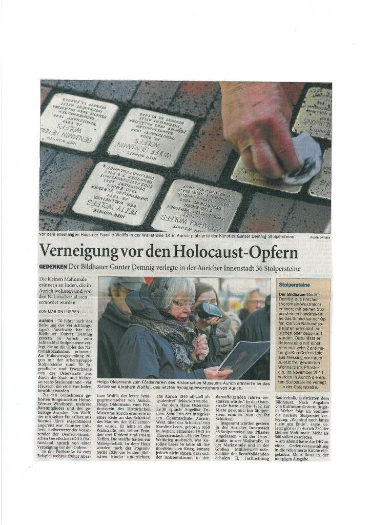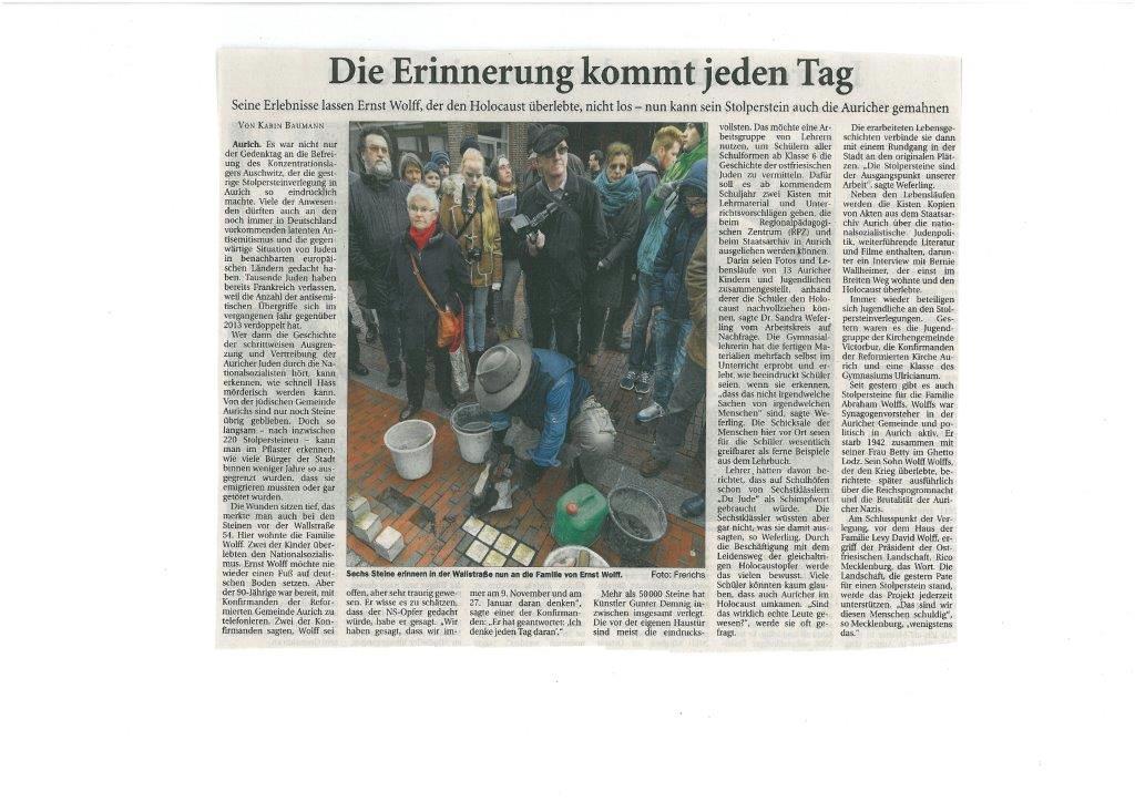 Am 27. Januar 2014 wurden 36 weitere Stolpersteine in der Auricher Innenstadt verlegt. Damit sind nun insgesamt 220 Gedenksteine verlegt. Auch die 8. Verlegung war keineswegs Routine, sondern ein besonders eindrucksvolles Erlebnis – vor allem durch die Teilnahme von Verwandten der Familien, für die die Steine verlegt wurden. Jair Wolff reiste aus Israel an, um der Verlegung des Steines für seine Vater und weitere Familienmitglieder beizuwohnen. Sein Vater wollte nicht nach Aurich zurückkehren, schickte aber seinen Sohn Jair Wolffals Vertreter.