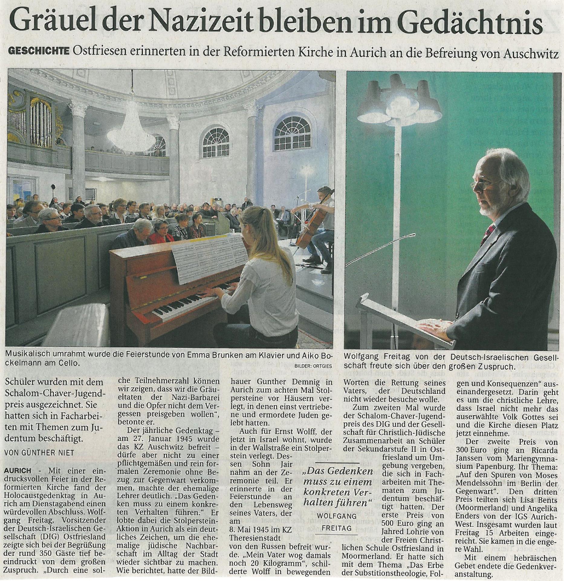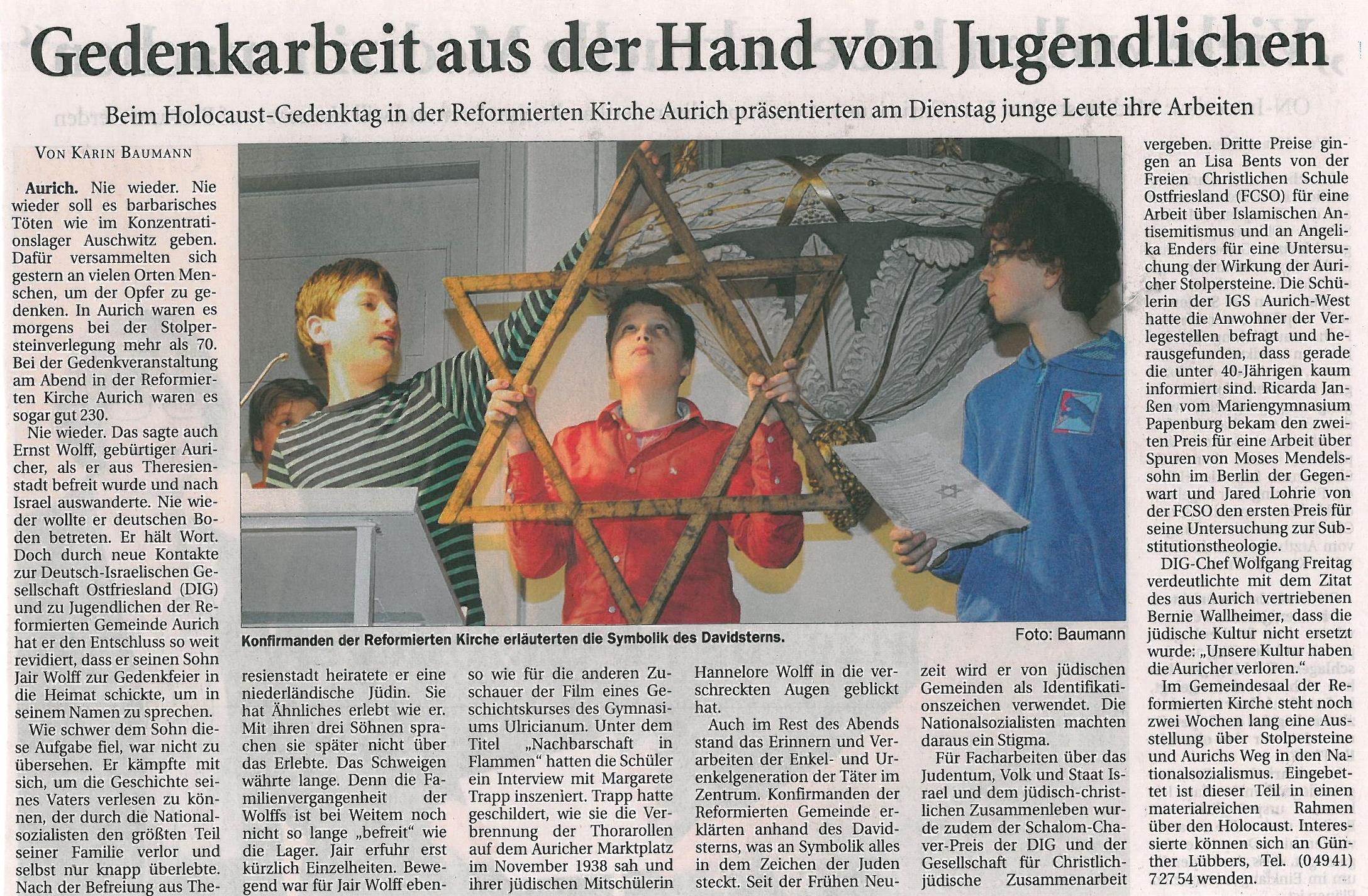 Links: Konfirmanden der Ev.-ref. Kirche Aurich verlesen die Biografiedaten für Helmut Wolff.