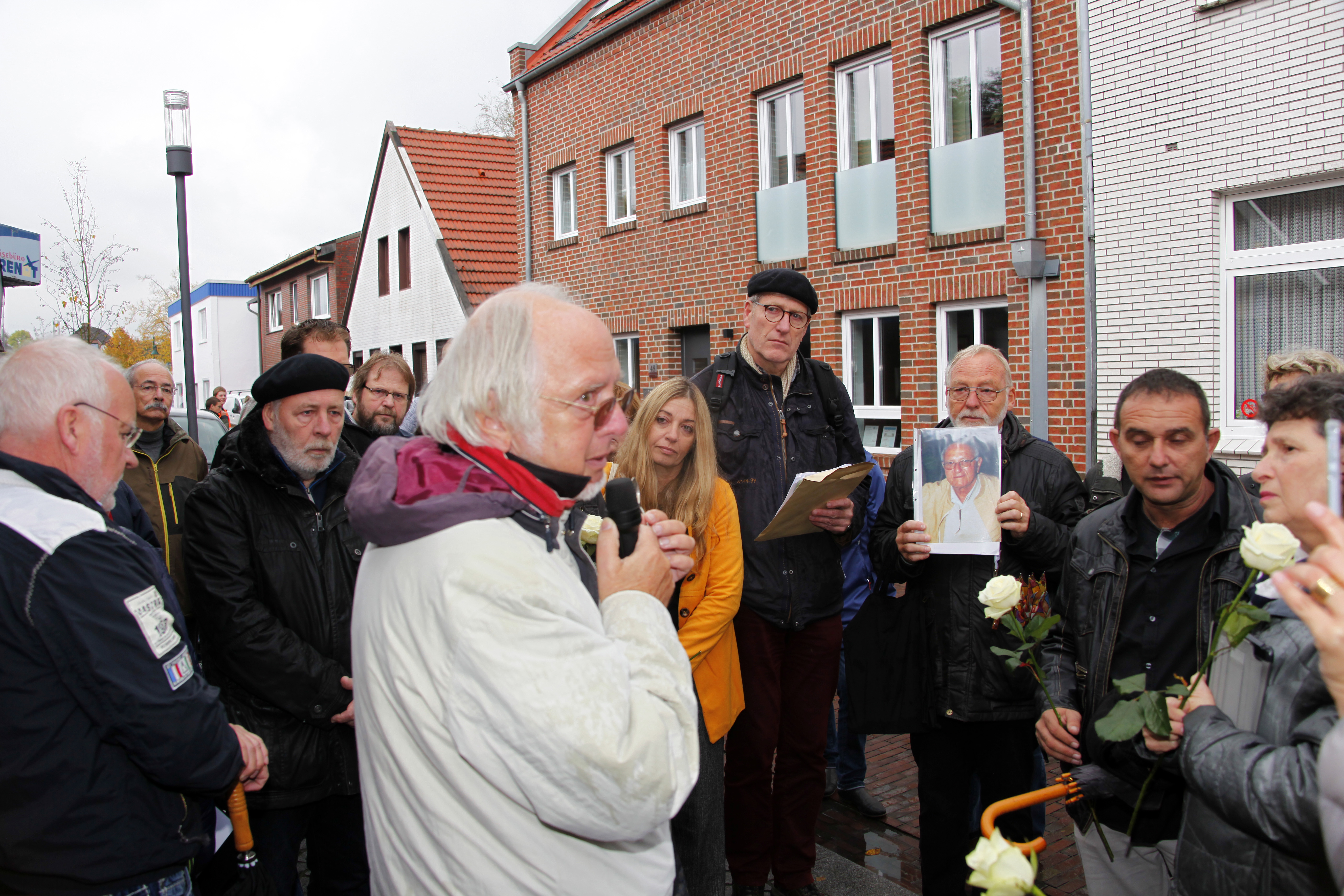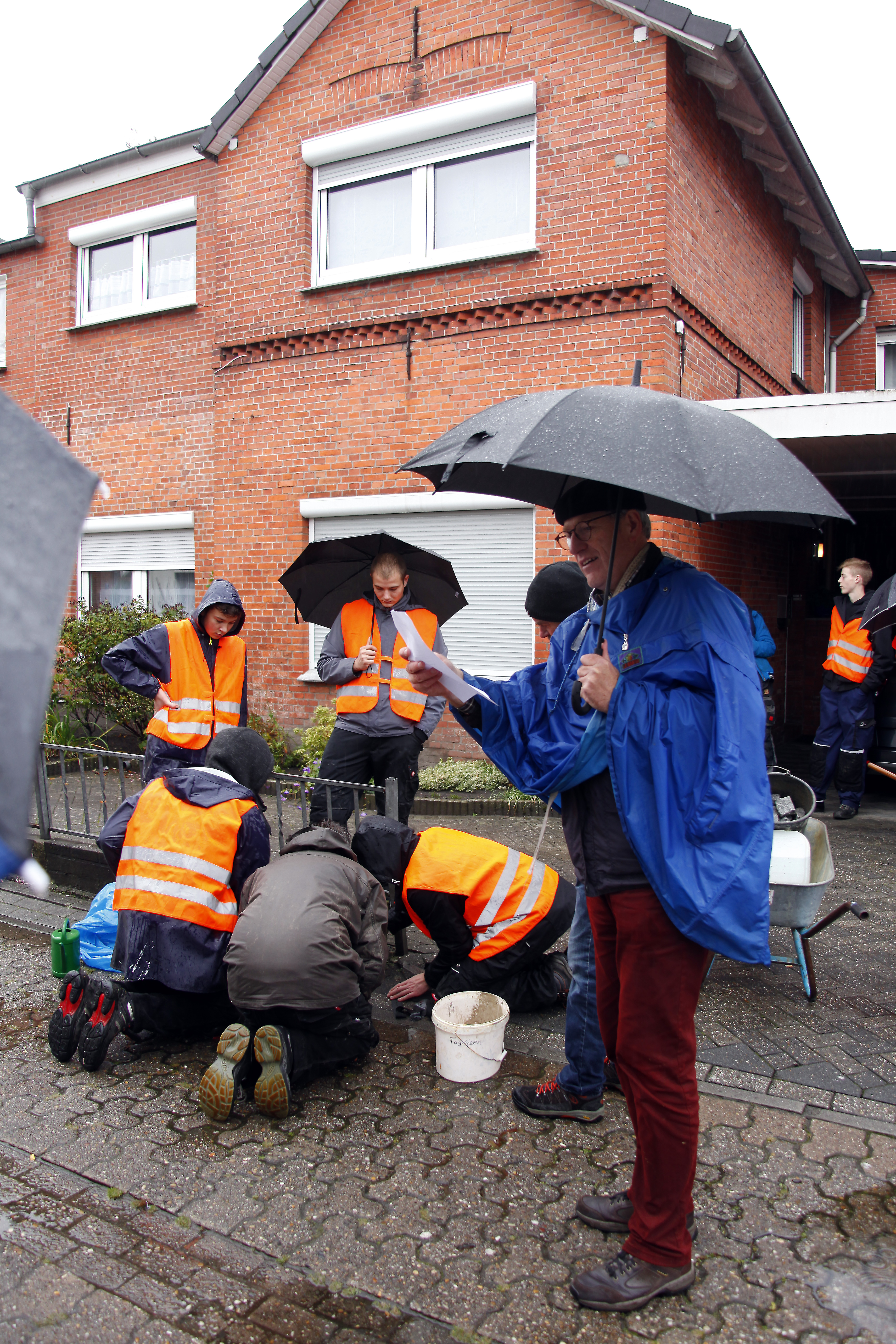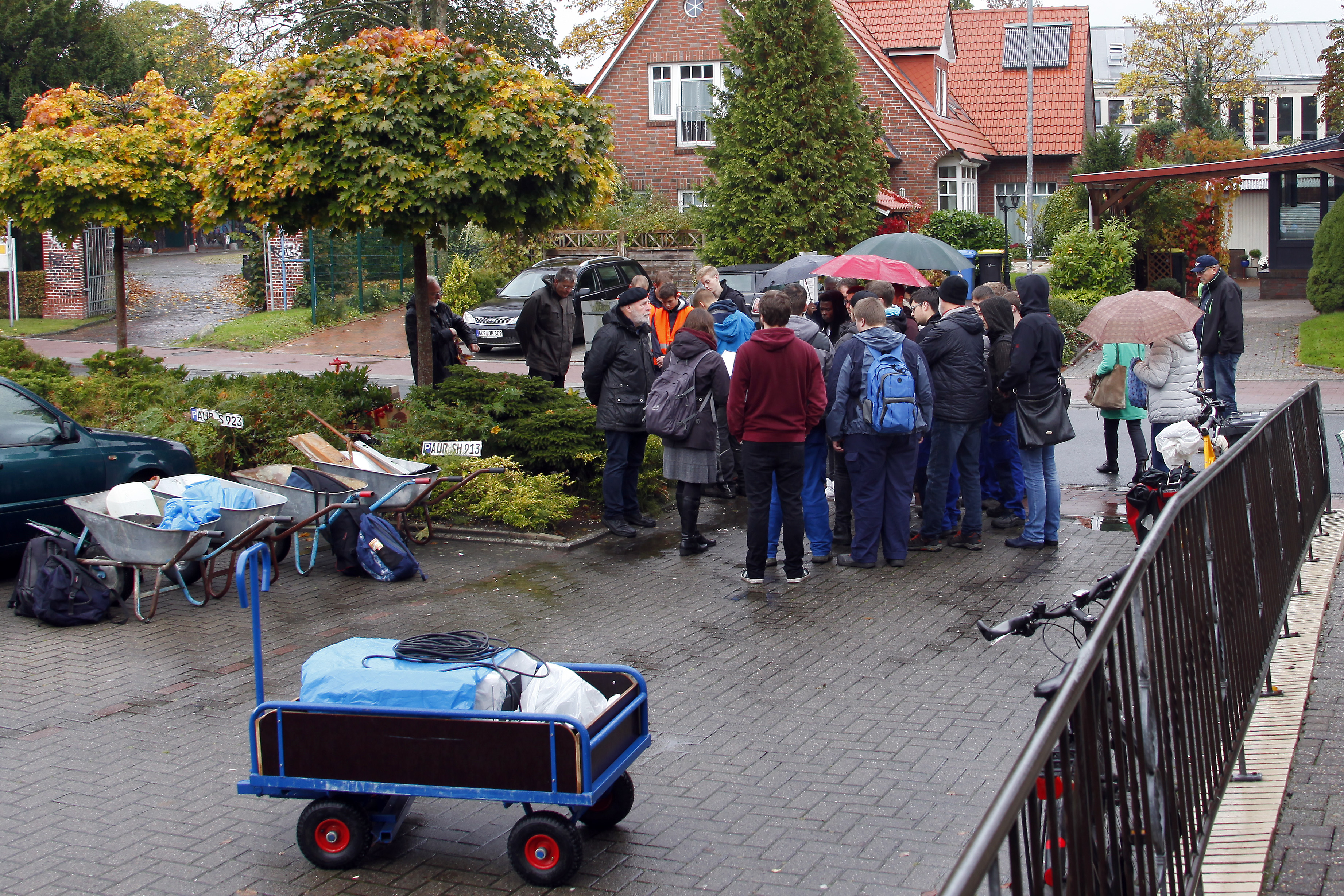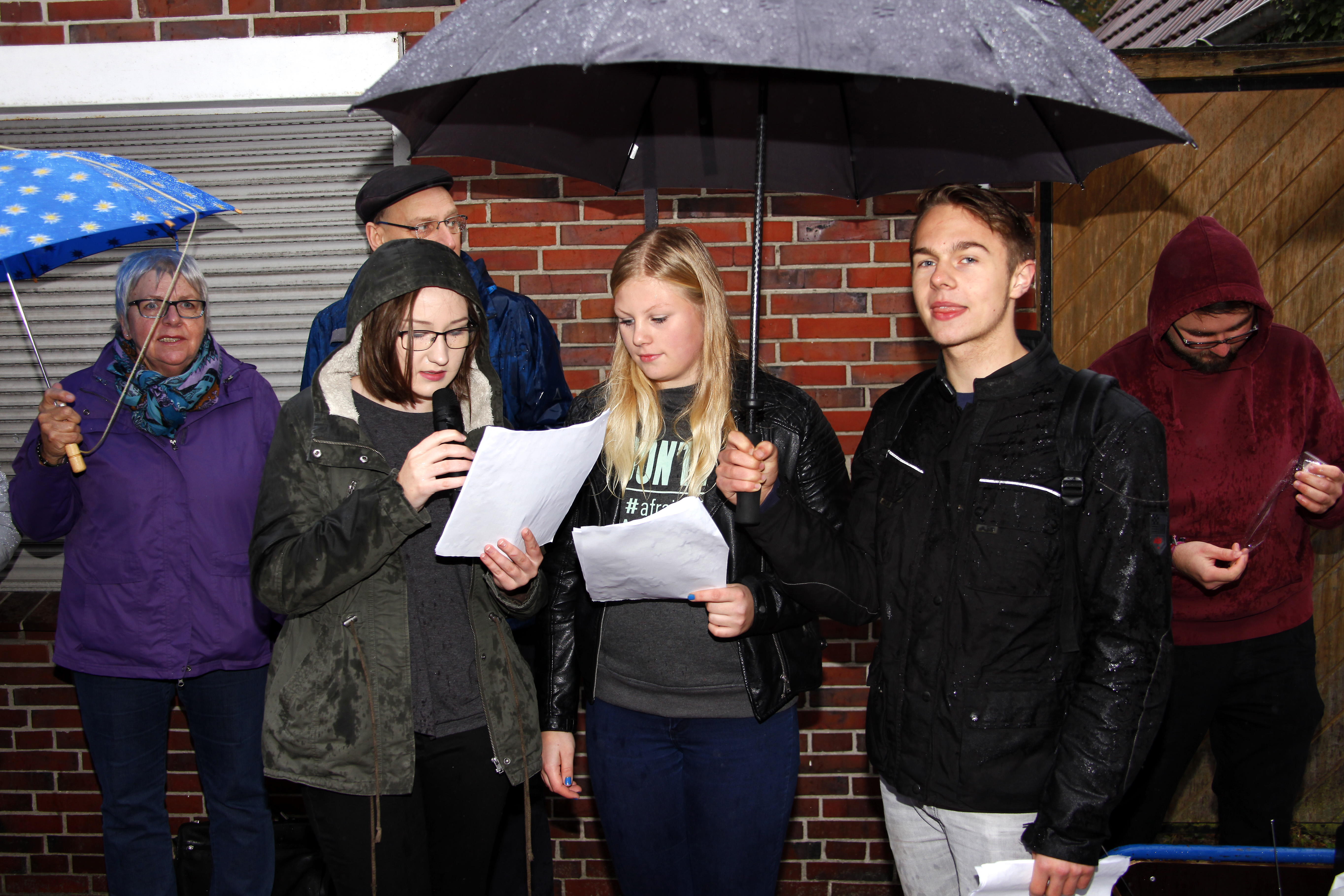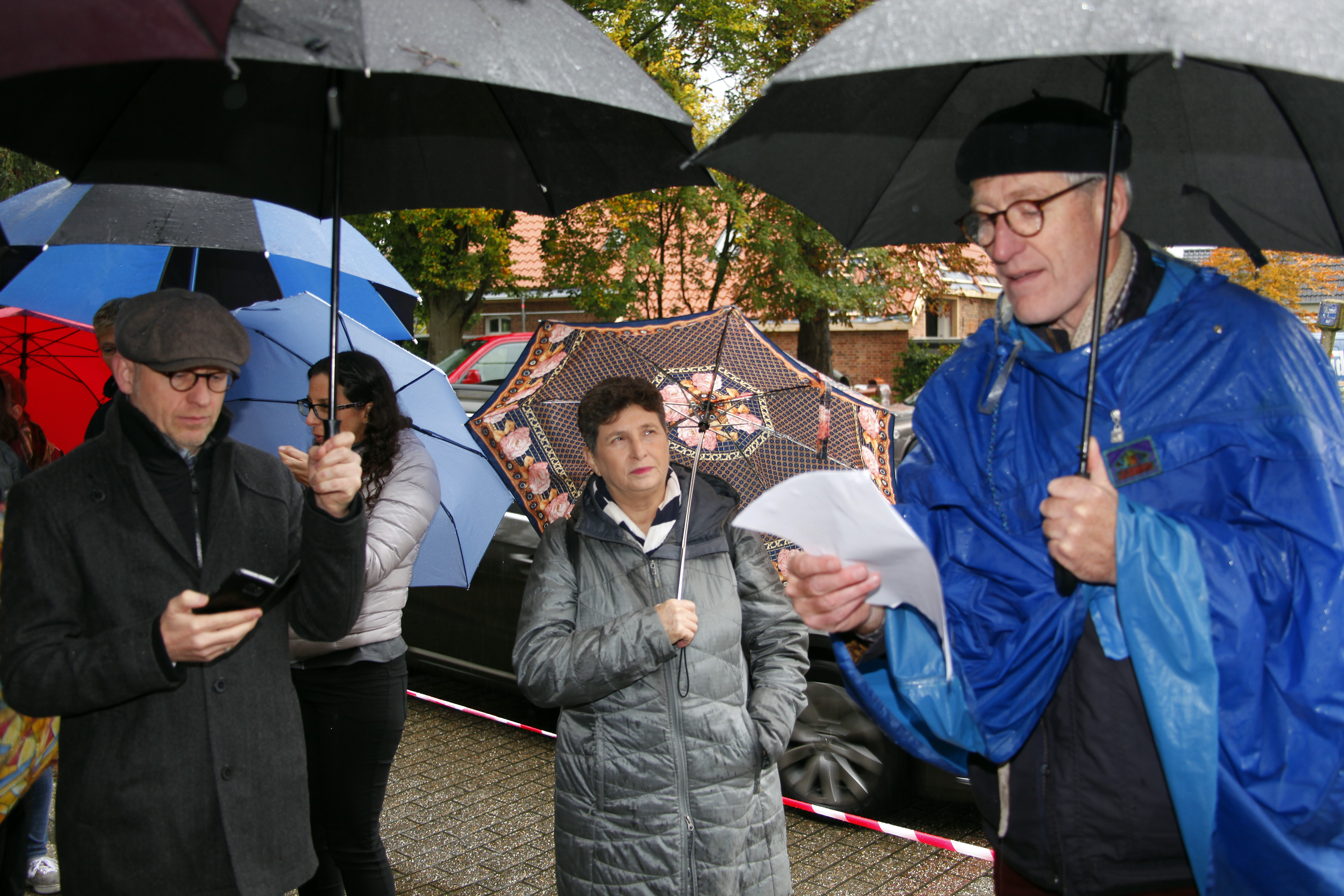 Wieder nahmen zahlreiche Auricher Bürgerinnen und Bürger an der Verlegung teil, darunter auch die Paten der Steine. Leider war das Wetter so ungemütlich, dass die Beteiligung mit fortschreitender Zeit abnahm. Neben den Mitgliedern der Recherchegruppe hatten auch Schüler der Berufsfachschule Bautechnik und Jugendliche einer Arbeitsgruppe der Kirchengemeinde Victorbur Rechercheaufgaben übernommen und trugen ihre Ergebnisse vor.