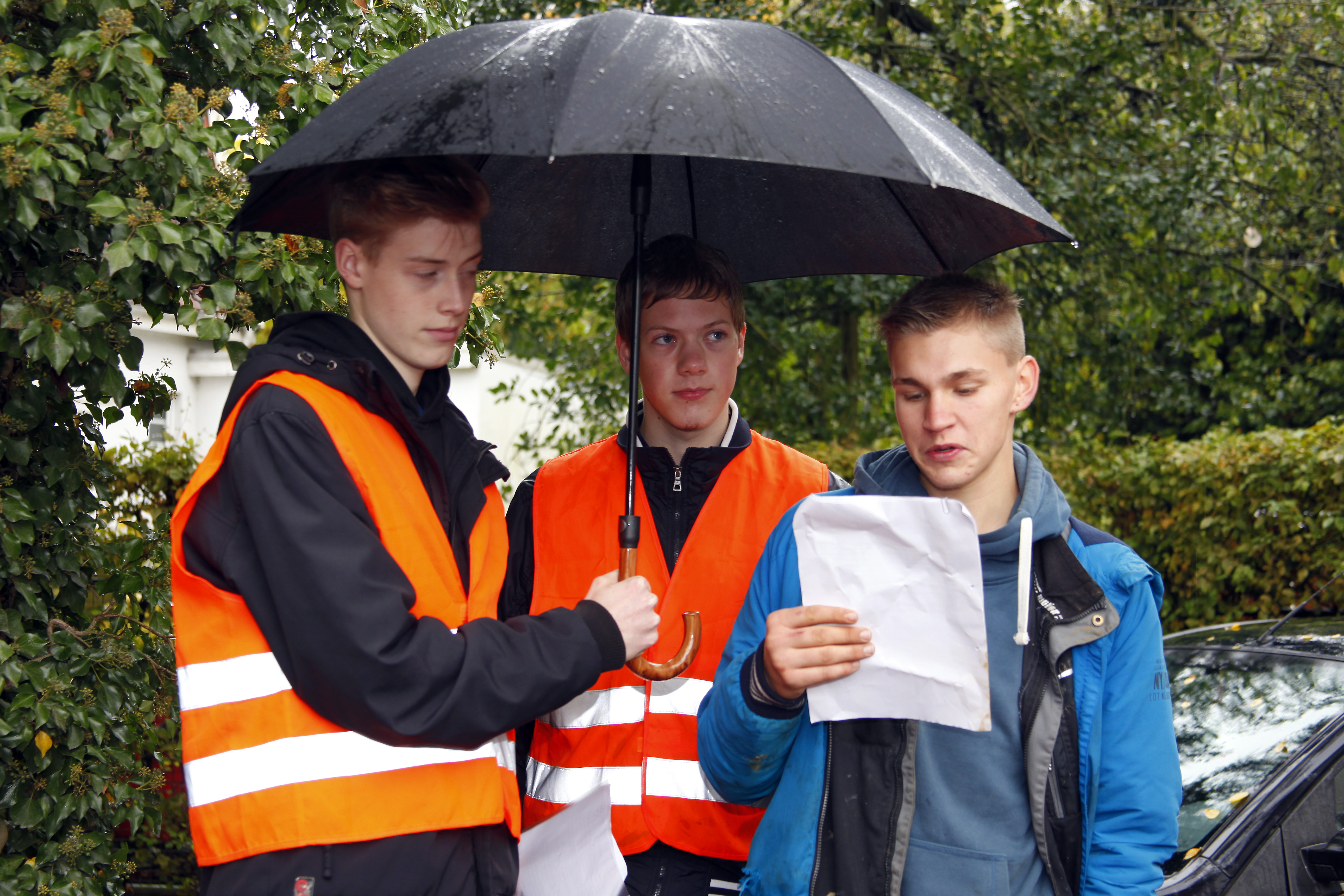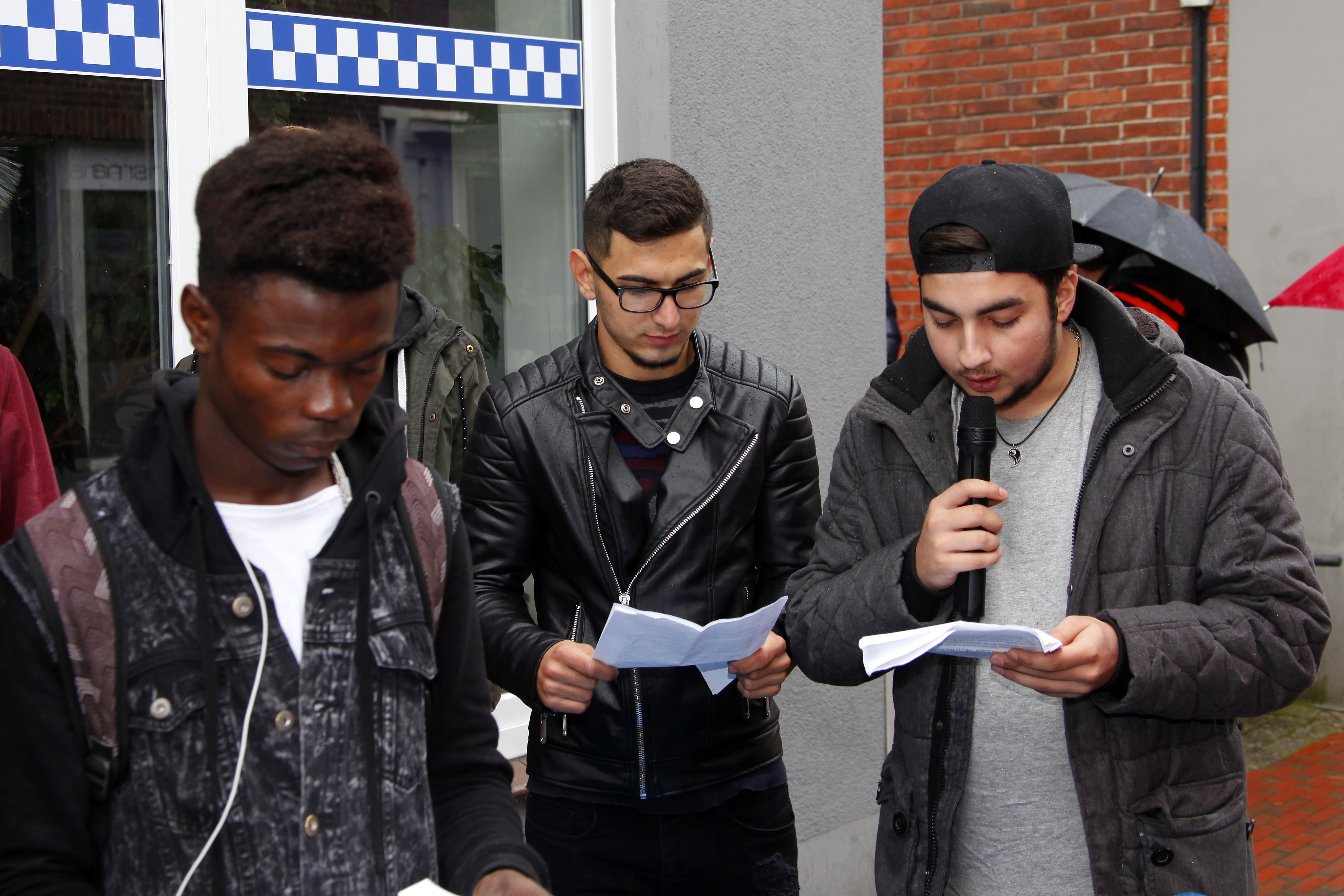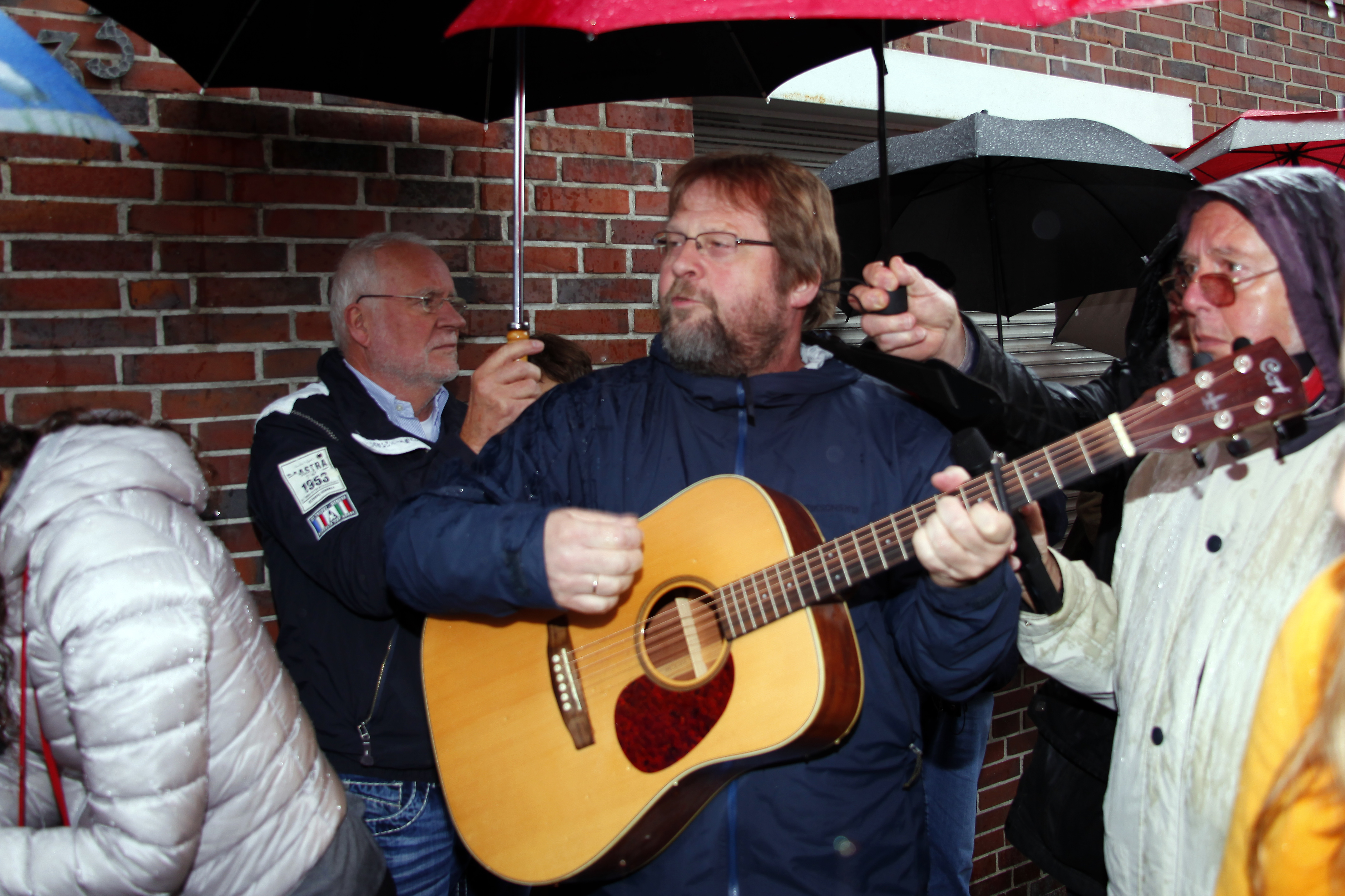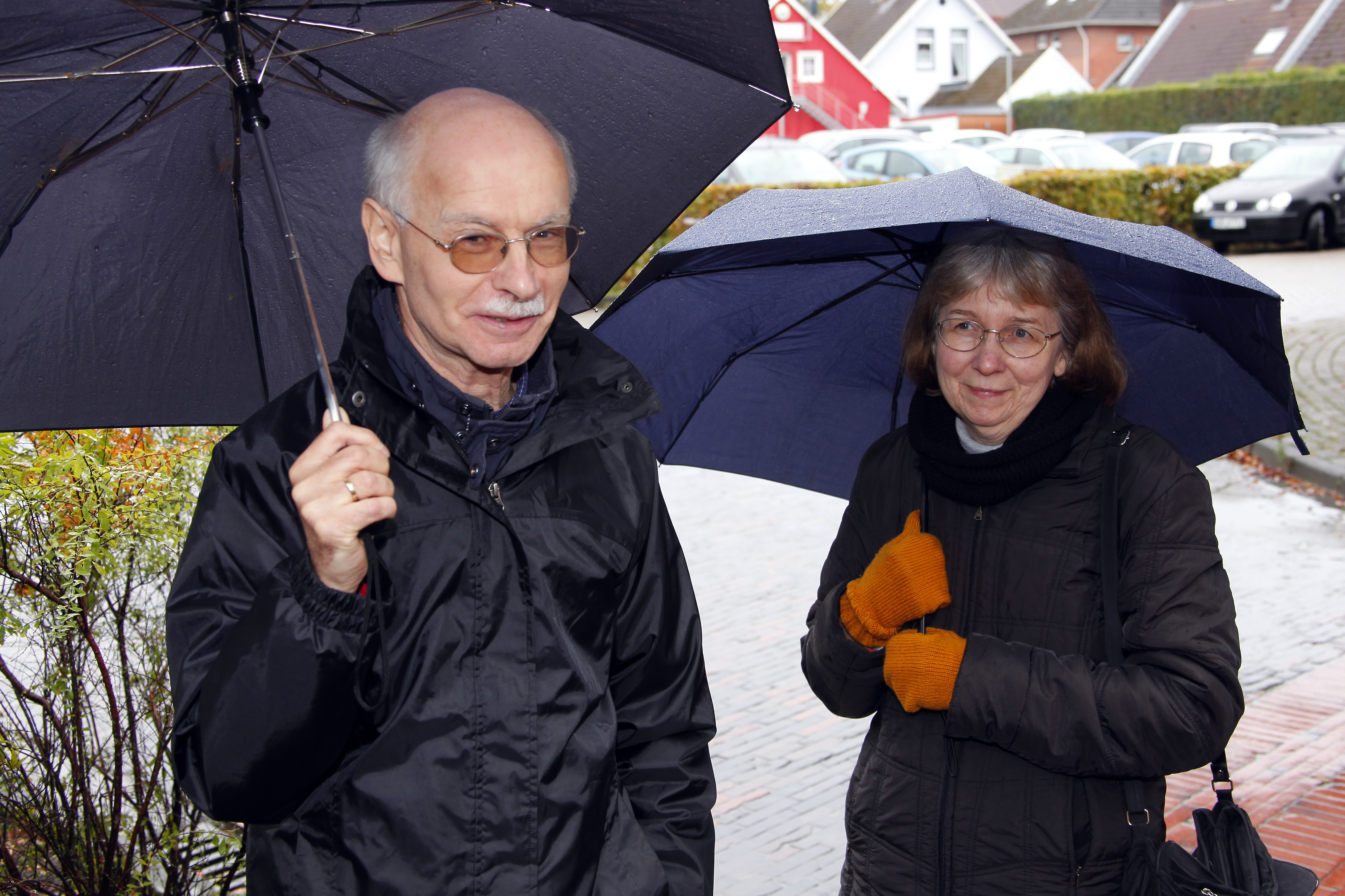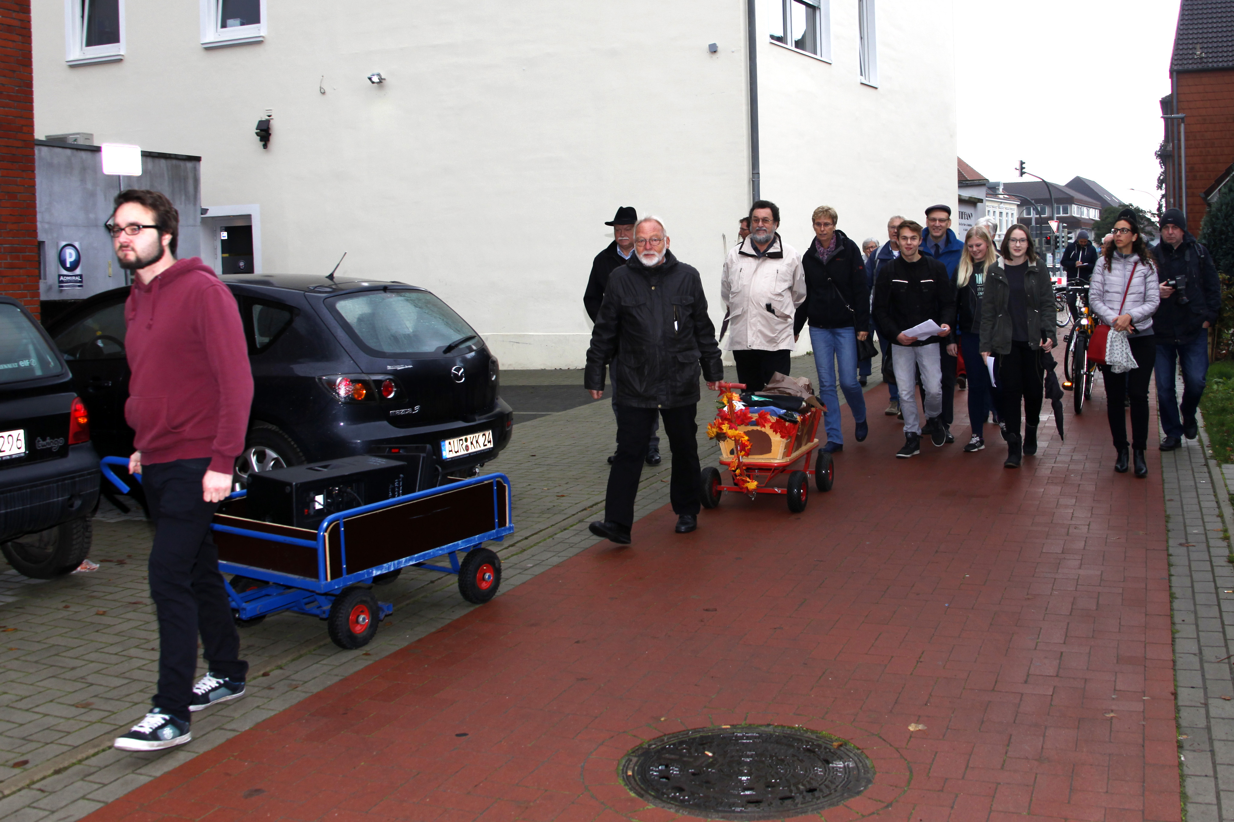Wieder nahmen zahlreiche Auricher Bürgerinnen und Bürger an der Verlegung teil, darunter auch die Paten der Steine. Leider war das Wetter so ungemütlich, dass die Beteiligung mit fortschreitender Zeit abnahm. Neben den Mitgliedern der Recherchegruppe hatten auch Schüler der Berufsfachschule Bautechnik und Jugendliche einer Arbeitsgruppe der Kirchengemeinde Victorbur Rechercheaufgaben übernommen und trugen ihre Ergebnisse vor.