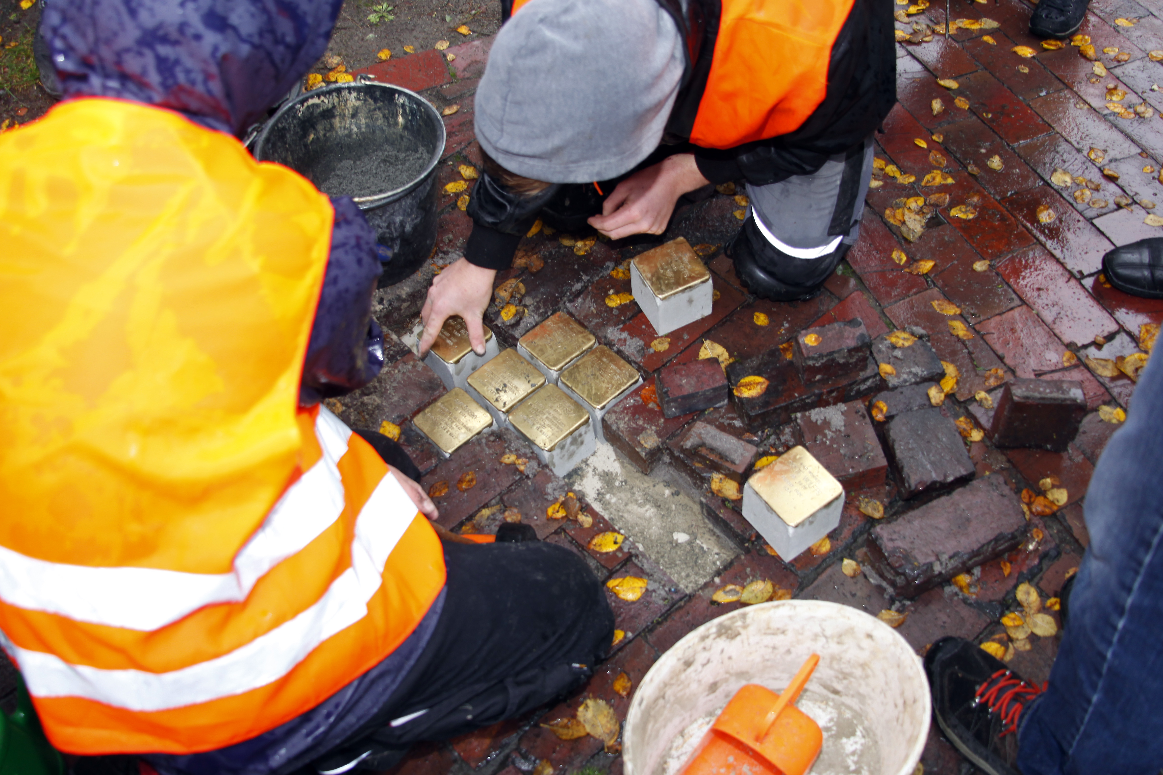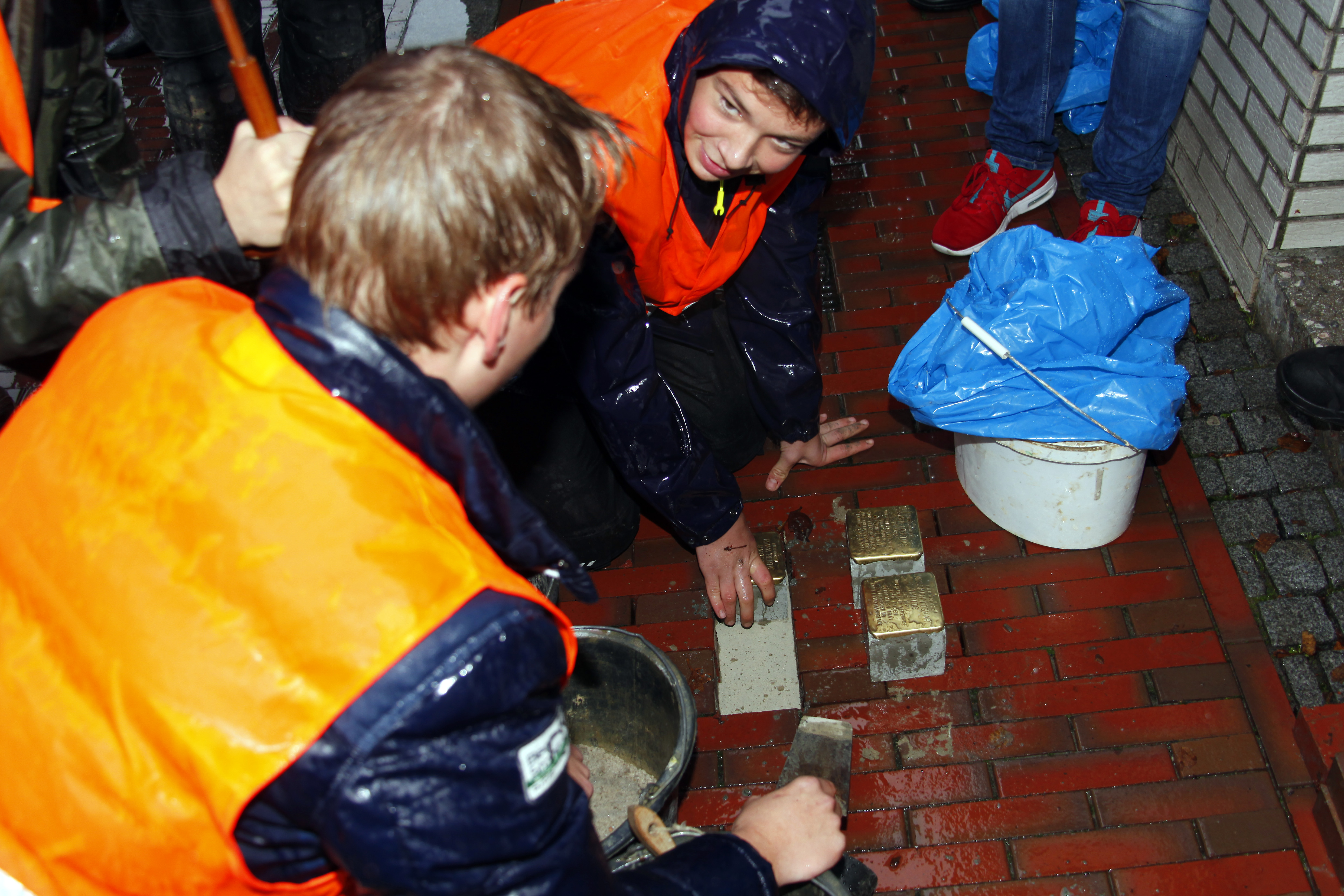 Der besondere Dank gilt den Schülern und Lehrern der Berufsfachschule Bautechnik der BBS II Aurich, die bei sehr unfreundlichem Wetter mit großer Sorgfalt und Geduld die Gedenksteine verlegten und in Abwesenheit von Gunter Demnig diese Verlegung erst möglich machten.