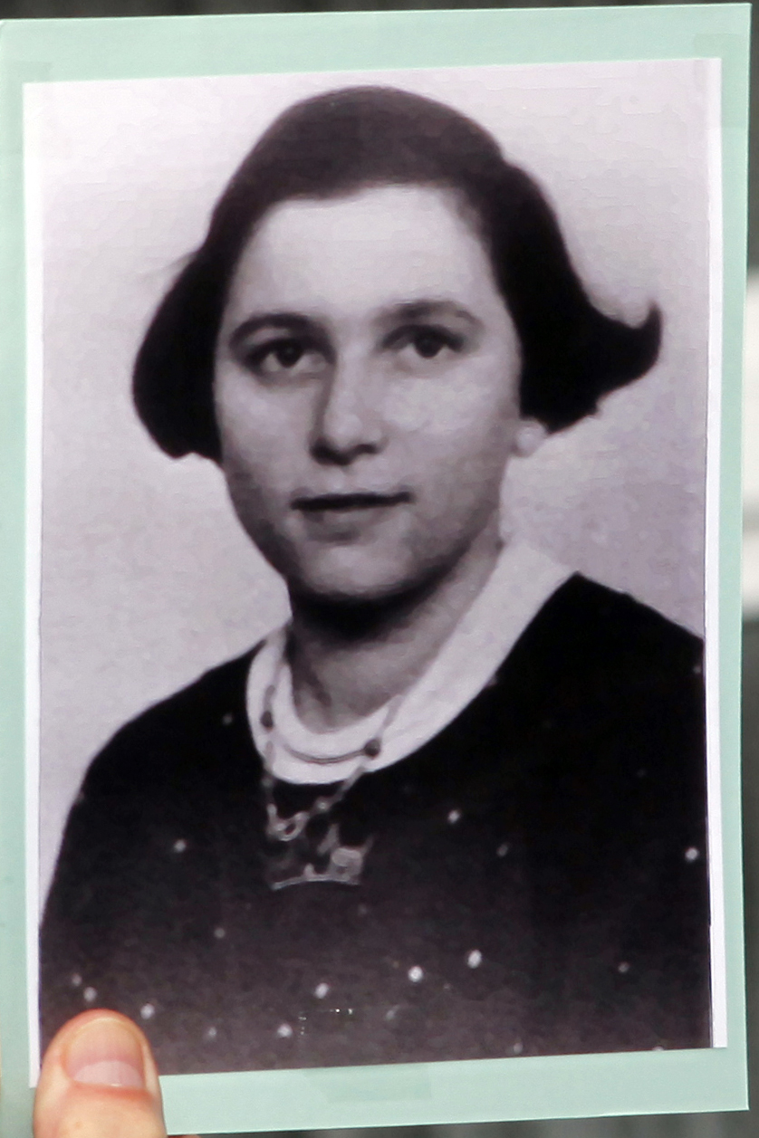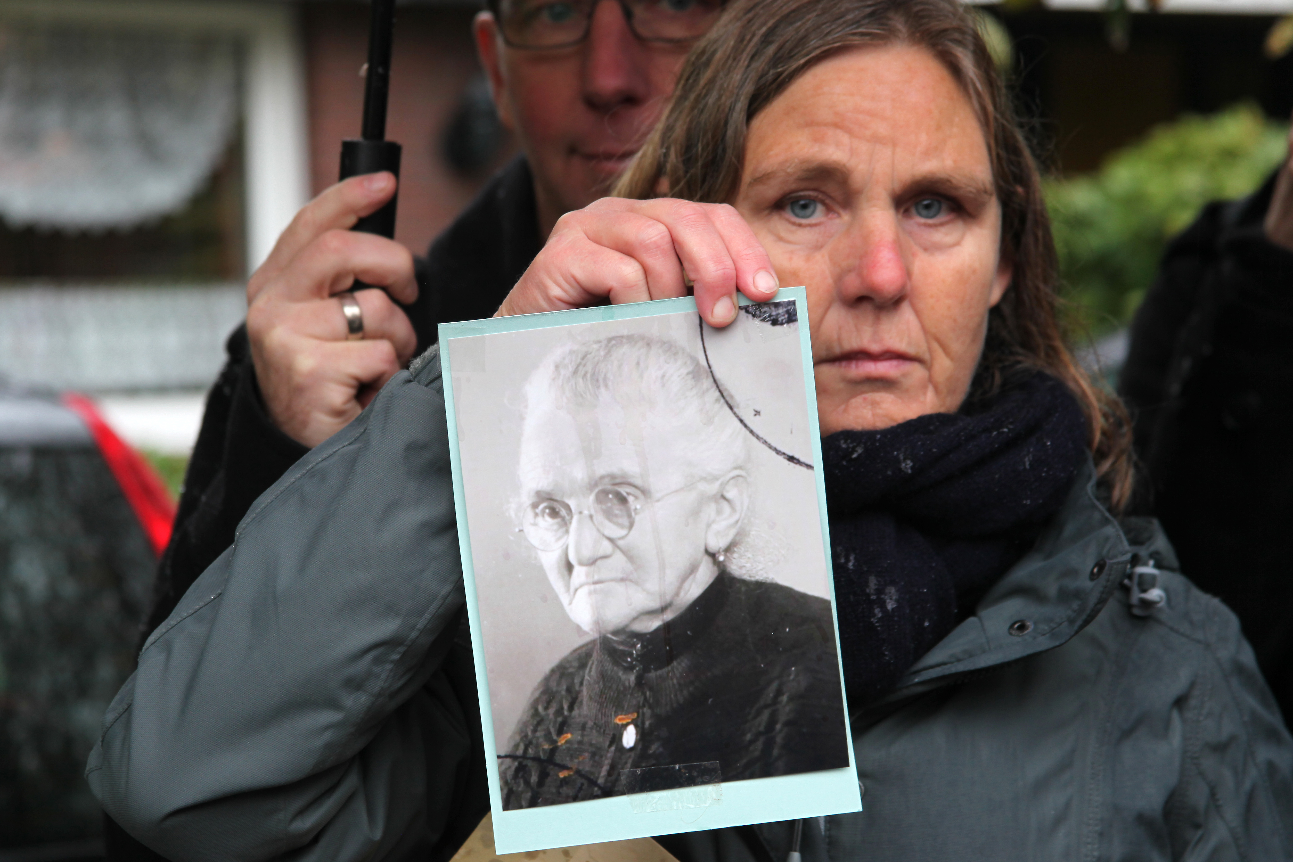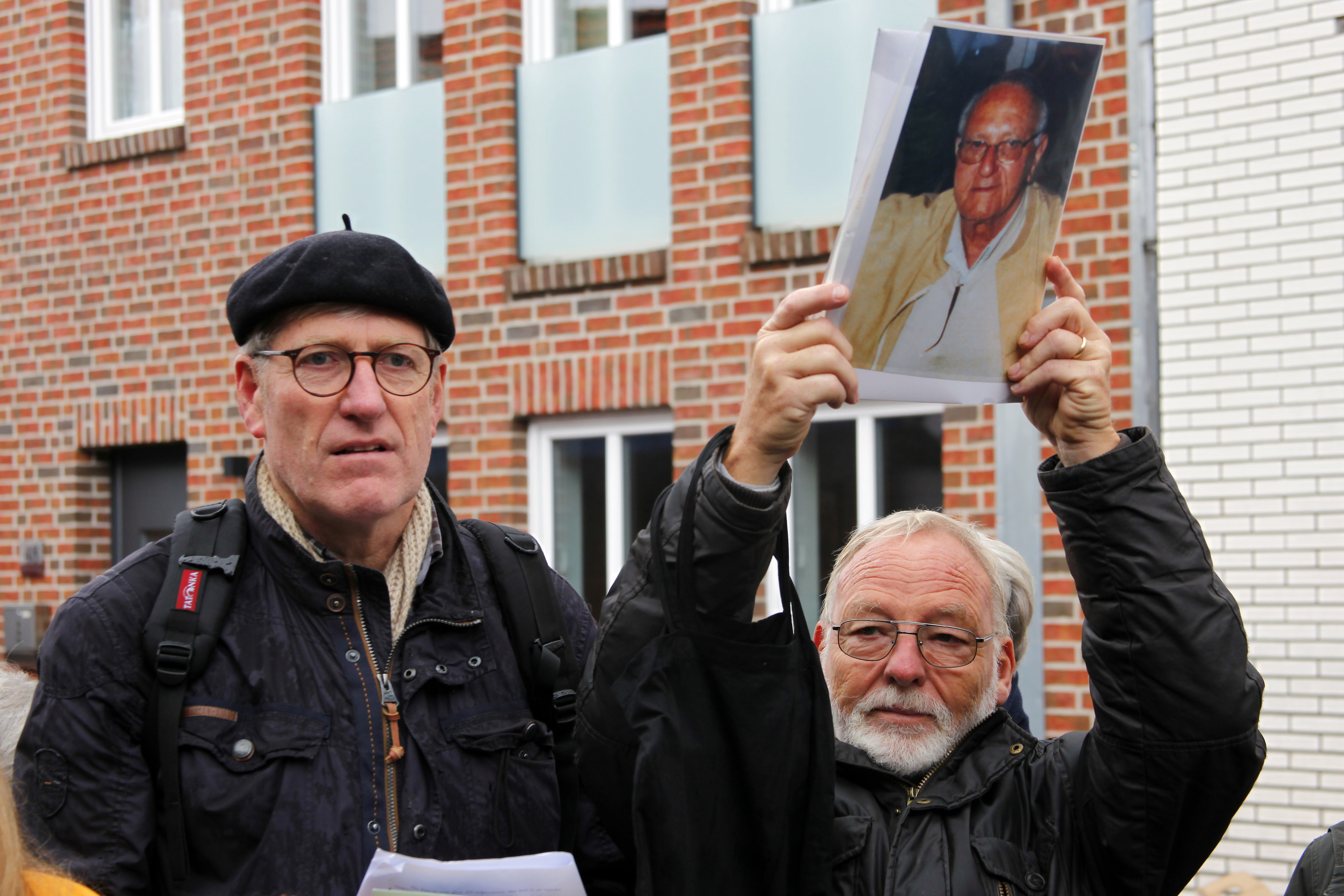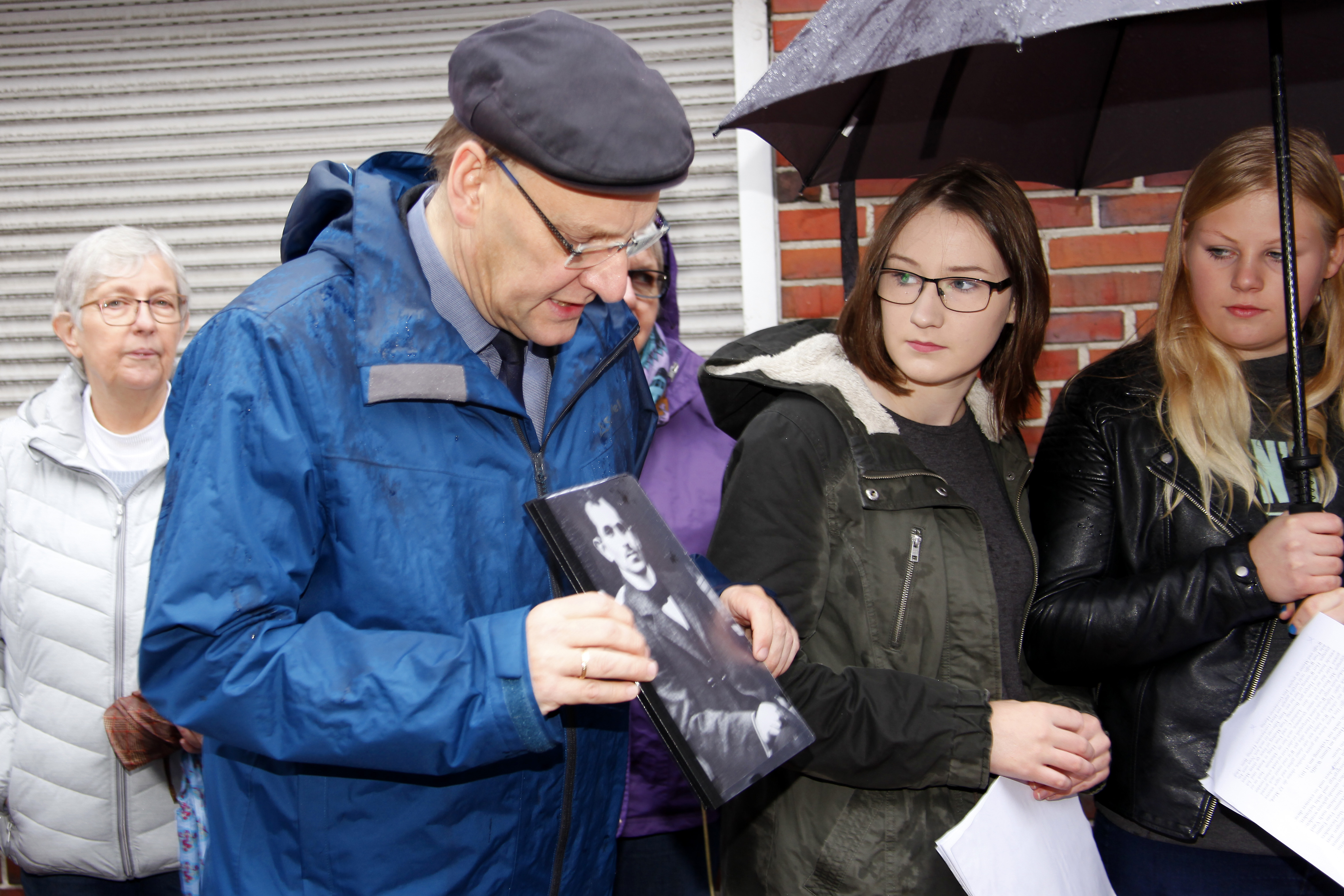 Minna „Minkel“ Wallheimer – Kreuzstraße 6d Patin: Gesa Fecht-Lückemeyer Karl Calmer Wallheimer – Kreuzstraße 6d Paten: Jelda Poppen und Wilfried Schnabel Julie Wallheimer geb. Salinger – Kreuzstraße 6d Paten: Heike und Tim SanderJörg Peter trägt die Biografien der Mitglieder der Familie Wallheimer vor. Karl und Julie Wallheimer sterben unter den unmenschlichen Bedingungen in Theresienstadt. Minna „Minkel“ überlebt diese Schrecken und verstirbt 1948.Anneke Peter mit dem Foto von Minna Wallheimer.Die Paten der Stolpersteine Jelda Poppen, Wilfried Schnabel und Heike Sander