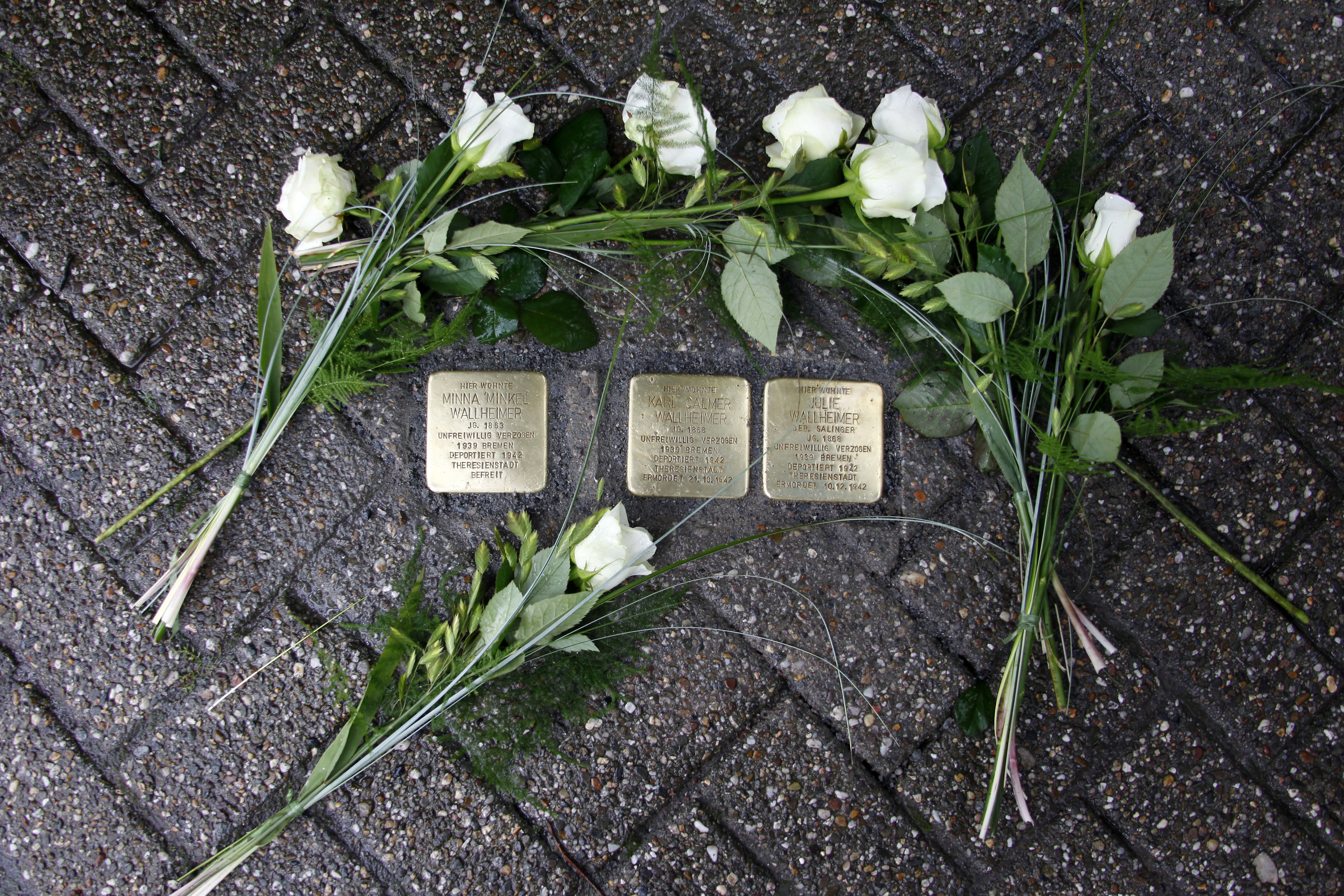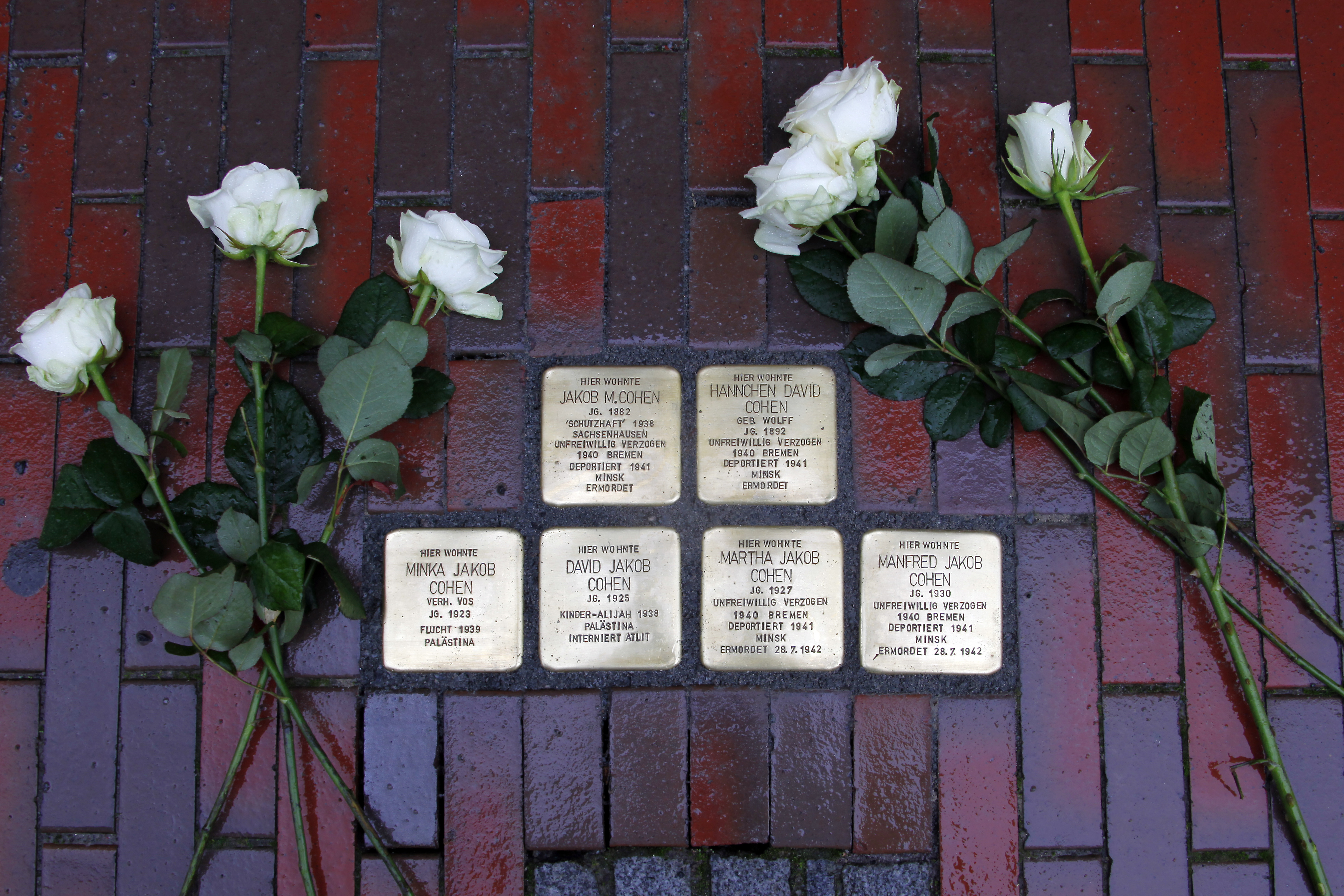 Jakob Moses Cohen – Wallstraße 33 Pate: Yoram Cohen Hannchen David Cohen geb. Wolff – Wallstraße 33 Patin: Hanna Vaknim Minka „Mia“ Cohen verh. Voss – Wallstraße 33 Paten: Chanan Nahari und Ely Vos David Jakob Cohen – Wallstraße 33 Paten: Ursula und Wolfgang Freitag Martha Jakob Cohen – Wallstraße 33 Pate: Familie Beninga-Arendt Manfred Jakob Cohen – Wallstraße 33 Pate: Familie Beninga-ArendtJörg Peter trägt die Lebensgeschichten der Mitglieder der Familie Jakob Moses Cohen vor. Hans-Jürgen Westermayer zeigt das Foto von David Cohen im Jahr 2002.Chana Nahari (hier mit ihrer Tochter Tal Nahari-Tenenbaum) berichtet vom Schicksal ihrer Mutter Mia und betont, wie wenig ihre Mutter von ihrer schweren Jugend und dem abenteuerlichen Weg nach Israel erzählen wollte.Hanna Vaknim trägt aus Erinnerungen an ihren Vater David Jakob vor.Wolfgang Freitag berichtet von seinen persönlichen Begegnungen mit David Jakob Cohen in Israel.Jakob CohenMinka CohenDavid CohenNur Minka „Mia“ und David Jakob Cohen konnten überleben, weil ihnen ihre Eltern die Flucht nach Palästina ermöglichen und sich schweren Herzens von ihnen trennten.Die israelischen Gäste Dodo Vaknim, Chana Nahari (Tochter von Minka Cohen), Ziv, Hanna und Avishay Vaknim, Ranni Cohen und Tal Nahari-Tenenbaum.