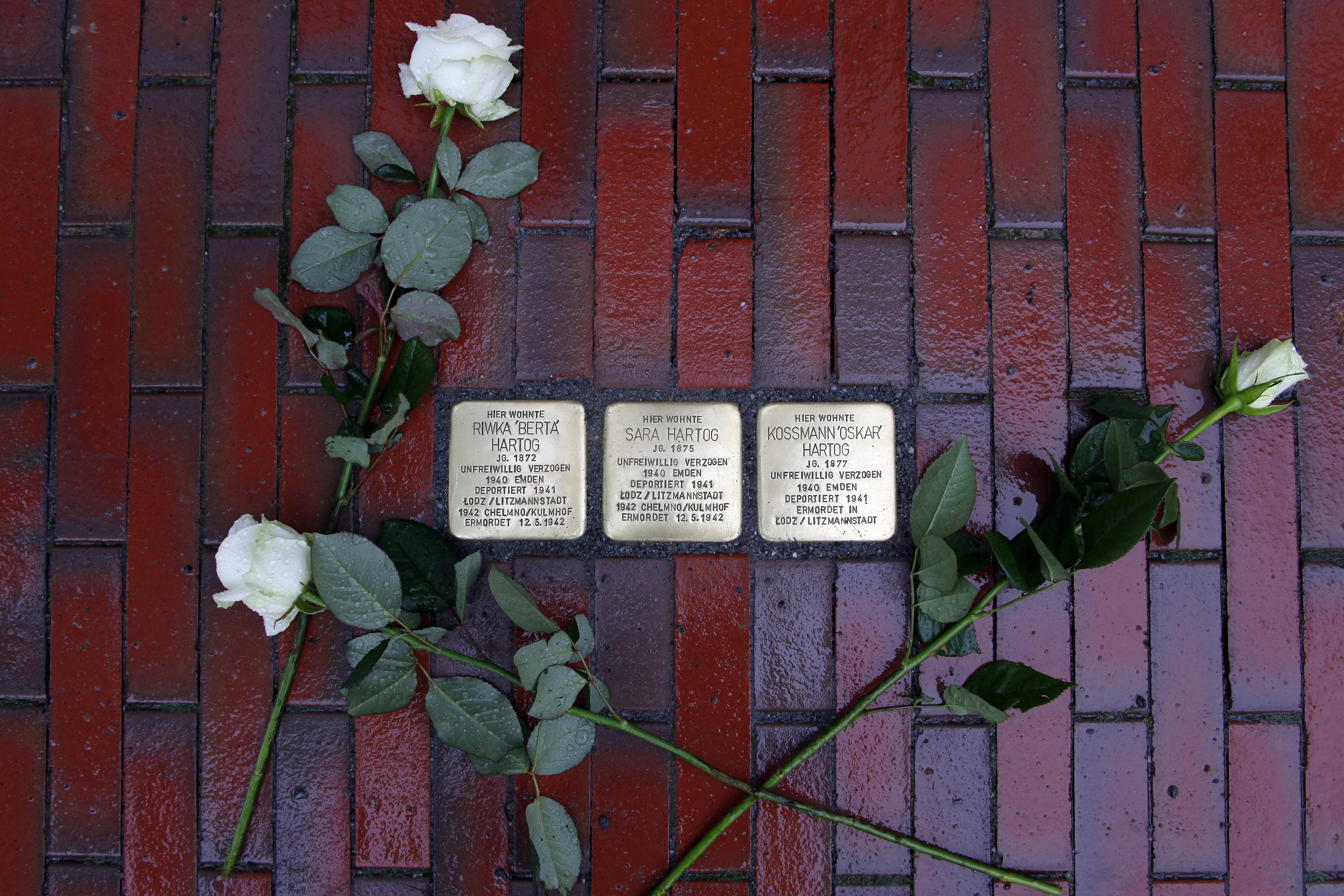 Berta „Riwka“ Hartog – Wallstraße 46 Pate: Eckard Hattensaur Sara Hartog – Wallstraße 46 Pate: Familie Beninga-Arendt Kossmann „Oskar“ Hartog – Wallstraße 46 Pate: Kirchengemeinde VictorburVorbereitung der Verlegung durch Schüler der Berufsfachschule BautechnikIn der Wallstraße 46 tragen Jana Joachims, Laura Lindena und Florian Linnemann, Jugendliche der Kirchengemeinde Victorbur, die von ihnen recherchierten Biografien der Familie Hartog vor. Die drei Geschwister Hartog wurden Opfer der Shoa.Pastor Jürgen Hoogstraat mit einem Foto von Kossmann Hartog.