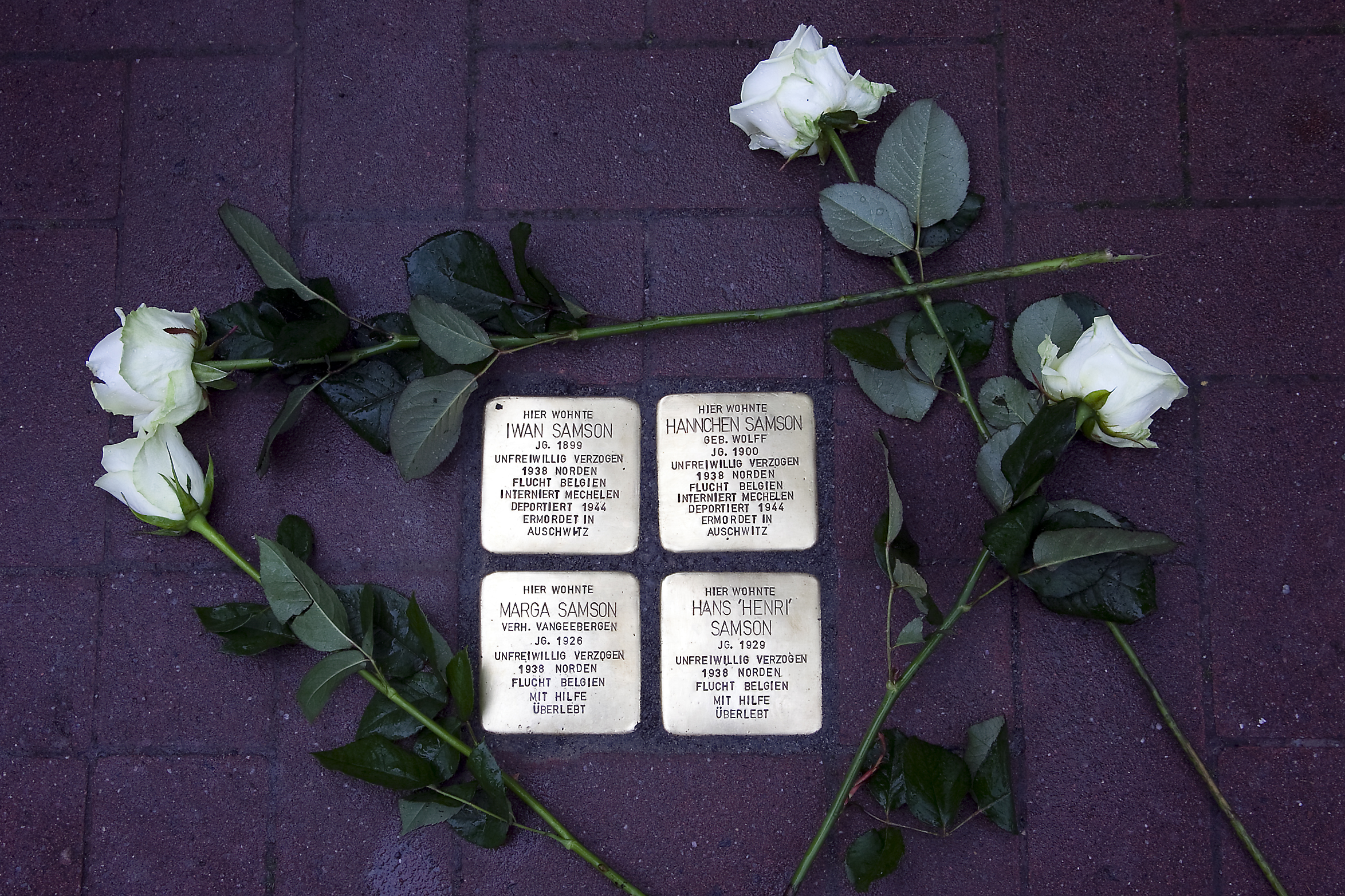 Vorbereitungen zur Verlegung im Breiten Weg 21. Das Haus, in dem die Familie Samson gewohnt hat, steht nicht mehr.Iwan Samson – Breiter Weg 21 Pate: Spenden zum 9.11.2014 Hannchen Samson geb. Wolff – Breiter Weg 21 Paten: Dr. Sandra Weferling und Heiko Schlake Marga Samson verh. Vangeebergen – Breiter Weg 21 Pate: Familie Beninga-Arendt Hans „Henri“ Samson – Breiter Weg 21 Paten: Elfriede und Günther LübbersDr. Sandra Weferling trägt die Biografien der Familie Samson vor. Iwan und Hannchen Samson werden in Auschwitz ermordet. Ihre Kinder Marga Samson und Hans „Henri“ können überleben, weil sie vor der Gestapo versteckt werden. Auf dem gezeigten Foto sind Ester und Henri Samson bei ihrem Besuch anlässlich der Woche der Begegnung in Aurich im Jahr 2002 zu sehen.Günther Lübbers, Pate des Stolpersteins für Henri Samson