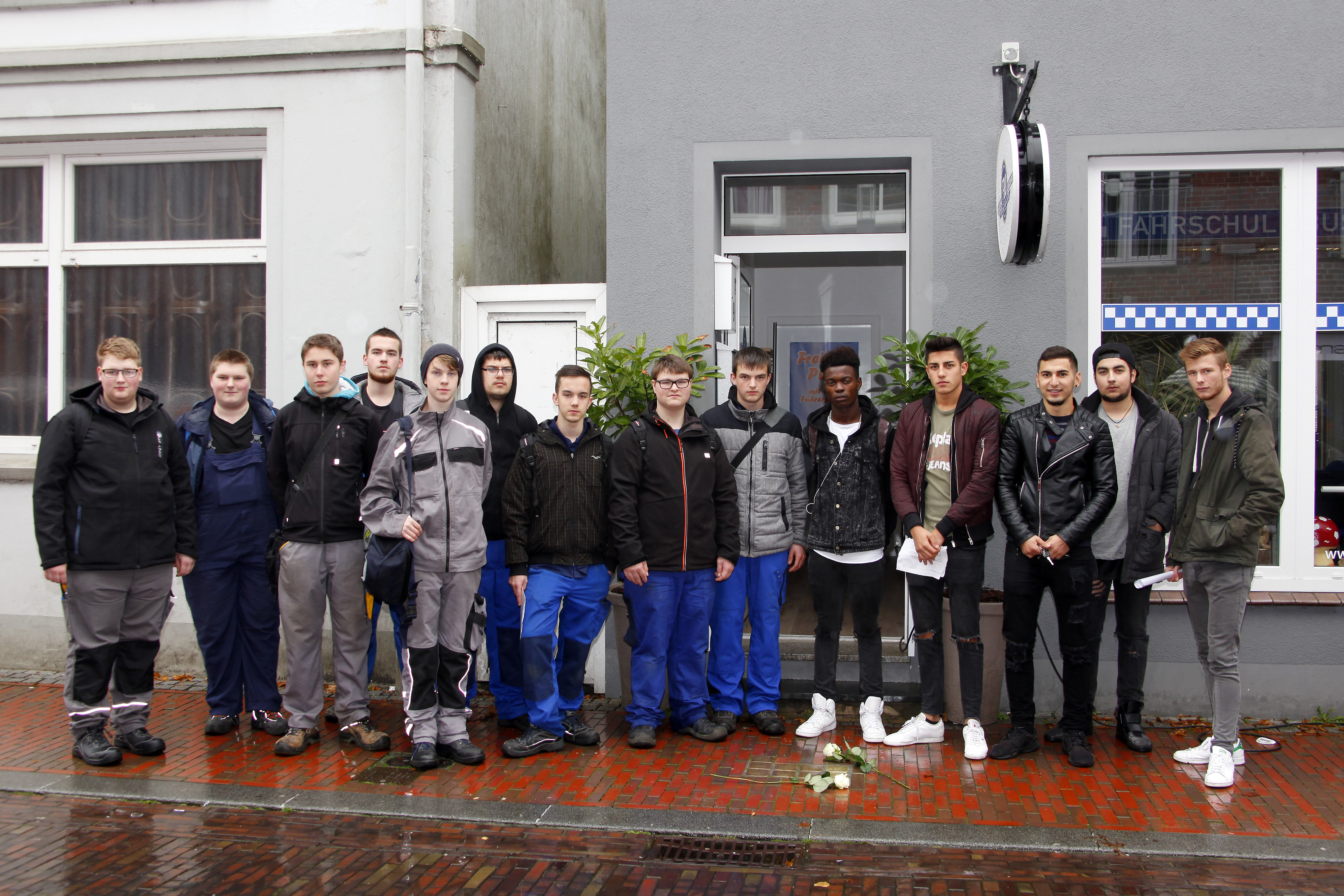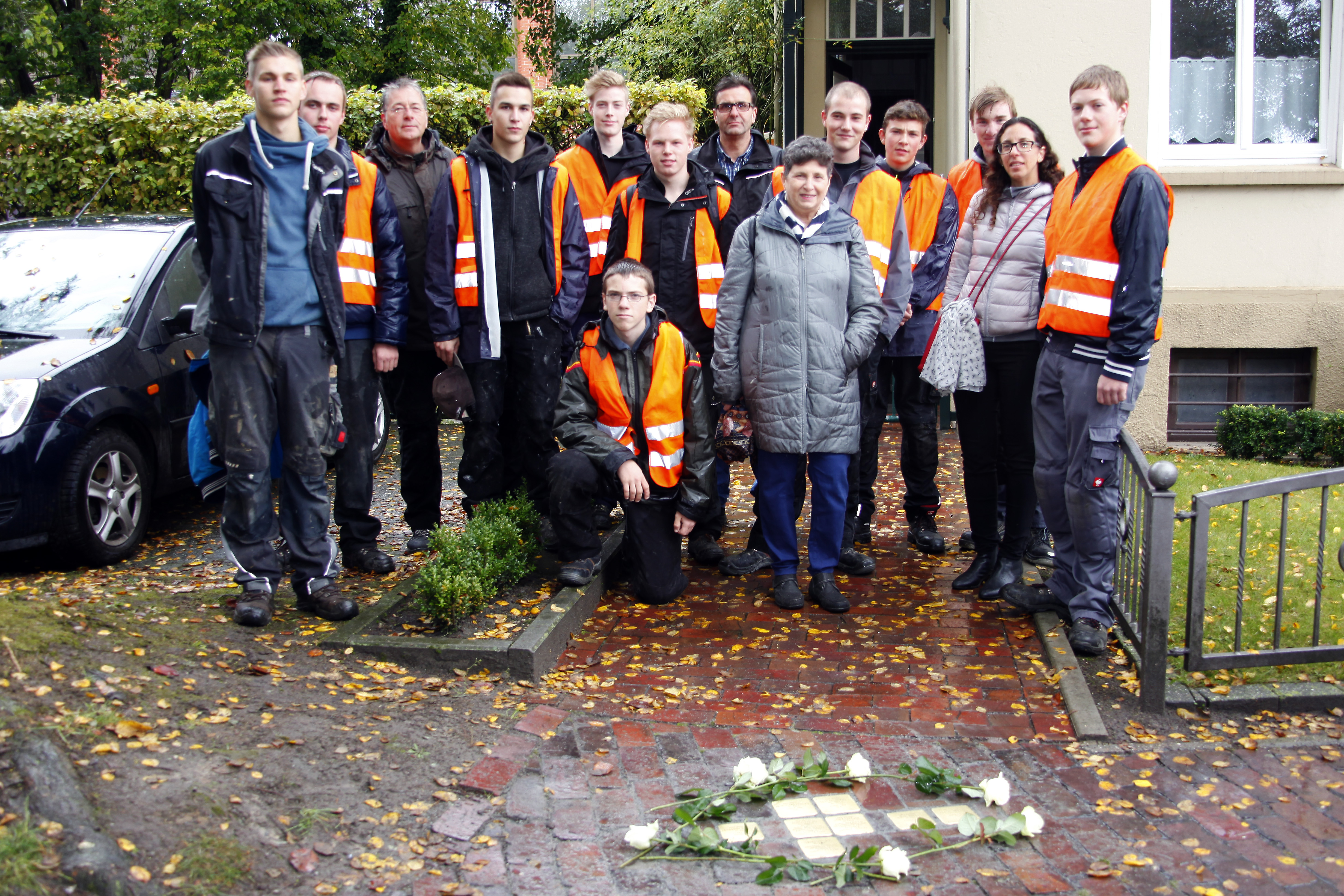 Abraham Wolff – Lilienstraße 9 Pate: Berufsfachschule Bautechnik der BBS II Aurich Minna Wolff – Lilienstraße 9 Patin: Irmtraut HausmannIn der Lilienstraße 9 wohnte der Fleischer und Schlachtermeister Selly Wolff und seine Frau Henriette geb. von der Walde mit ihren 12 Kindern. Nur drei ihrer Kinder überlebten den Völkermord.Schüler der Berufsfachschule B1MV haben mit ihrer Lehrerin Frau Bentlage-Heeren die Biografien erarbeitet und tragen ihre Ergebnisse vor. Abraham Wolff konnte nach Australien fliehen und starb an den Folgen der Misshandlungen im KZ Sachsenhausen. Minna überlebte durch Flucht in die Schweiz.Die beteiligten Schüler der B1MV Berufsfachschule „Anlagenmechanik für Sanitär-, Heizungs- und Klimatechnik“ der BBS Aurich II von links: Marcel Manott, Jann-Hinrich Siemering, Nils Buss, Patrick Kotow, Christian Störmer, Kevin Ulferts, Kevin Zaretzke, Mathias Schulz, Dennis Pellmann, Galvany Kiasowa, Almir Dogani, Gyoksel Rasim, Erwin Uka und Sascha Lazarowski.