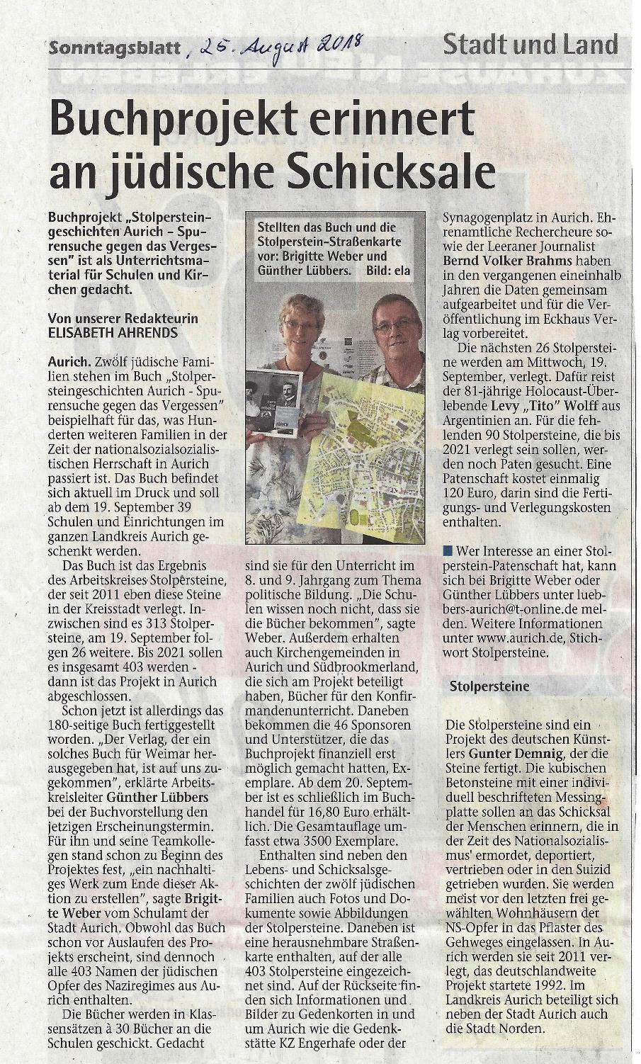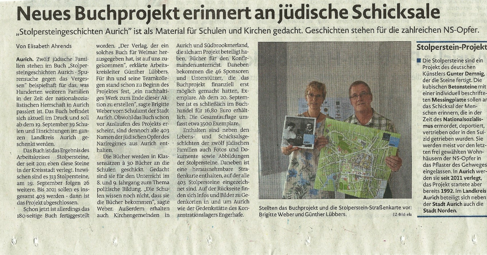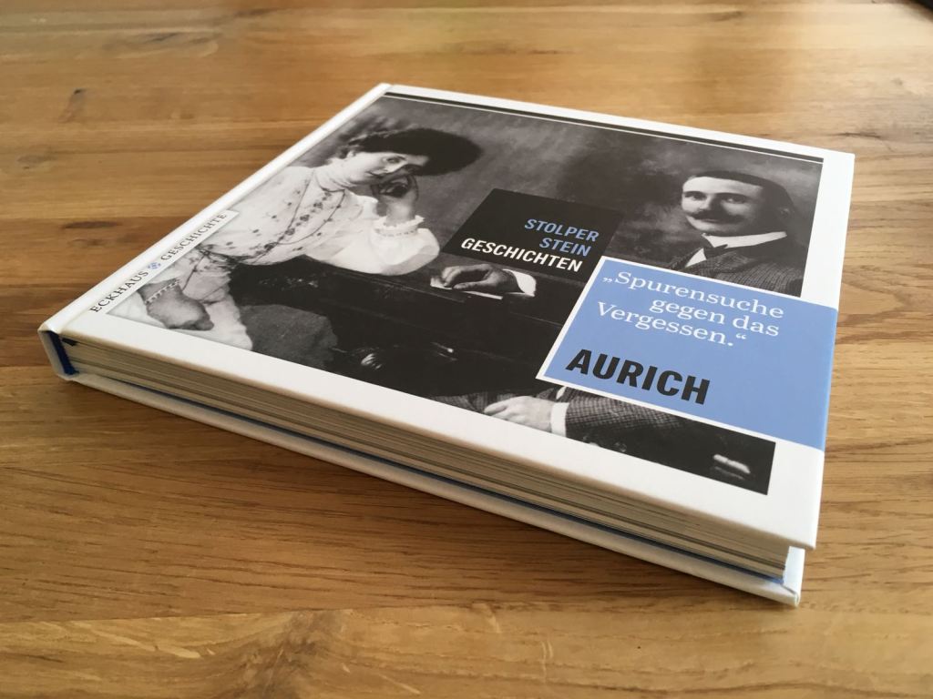 Am Abend des Tages der 13. Stolpersteinverlegung in Aurich (19.09.18 – Treffpunkt für die Verlegung: 14 Uhr Rathaus Aurich – genauer Zeitplan s. u.) wird das 180-seitige Buch „Stolpersteingeschichten Aurich – Spurensuche gegen das Vergessen“ vorgestellt und dann in Klassensätzen zu je 30 Exemplaren an Schulen, Kirchengemeinden und Einrichtungen im Landkreis Aurich verteilt. Das Buch enthält 12 Biografien, die von Mitgliedern der Arbeitsgruppe „Stolpersteine Aurich“ recherchiert und von dem in Leer gebürtigen früheren OZ-Redakteur und heute in Stendal tätigen Volker Brahms redaktionell bearbeitet wurden. Wir bedanken uns bei den 46 Sponsoren und Unterstützer, die insgesamt 50 Klassensätze finanziert haben und damit dieses Buchprojekt erst möglich machten.