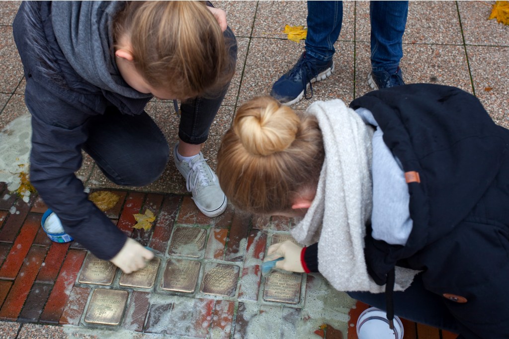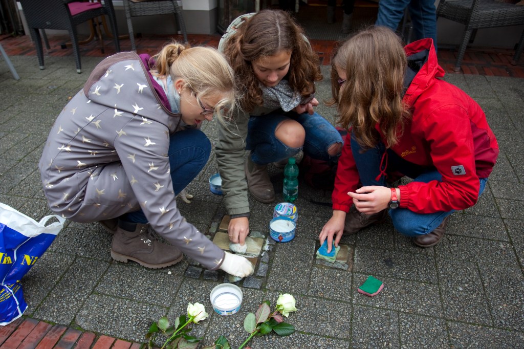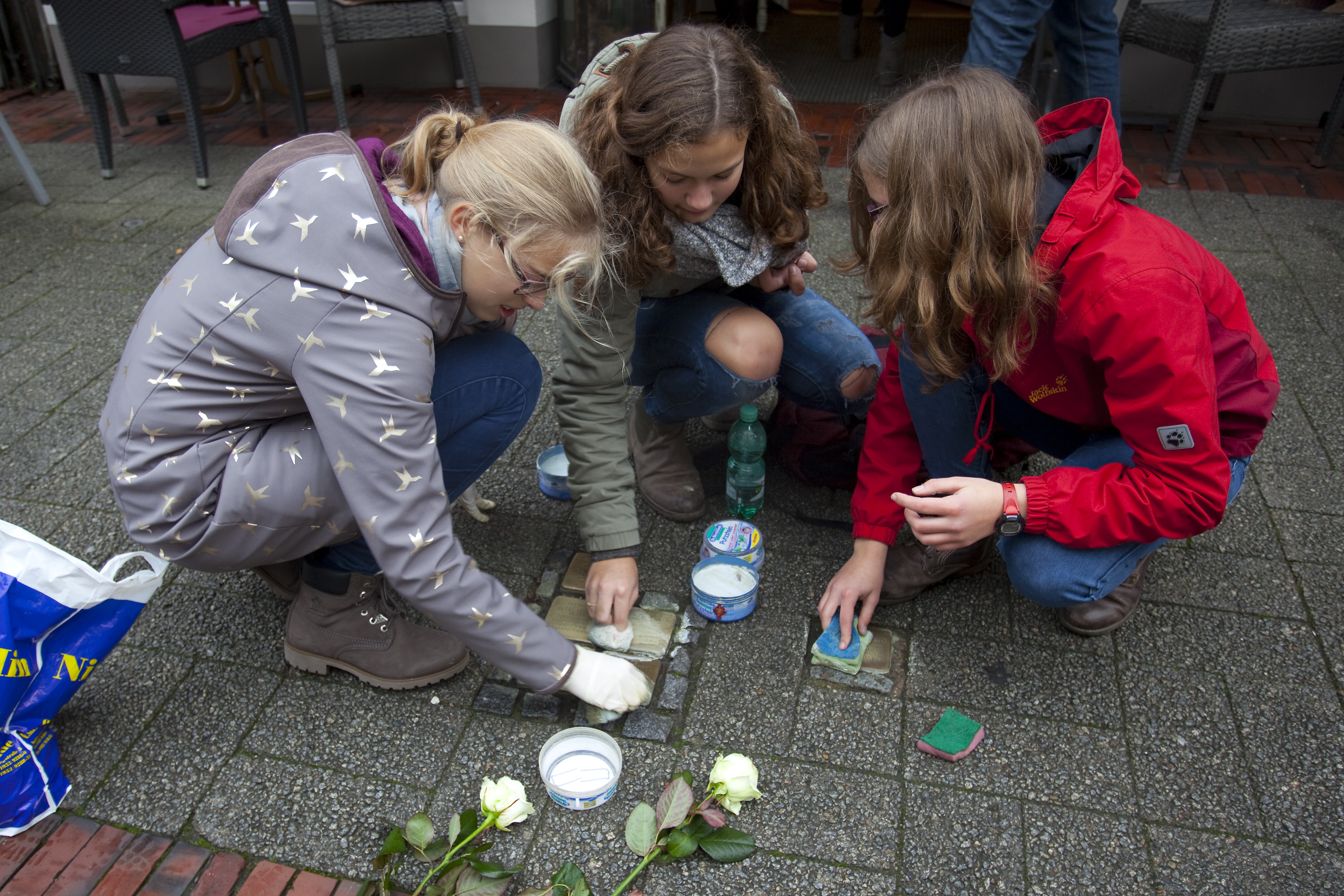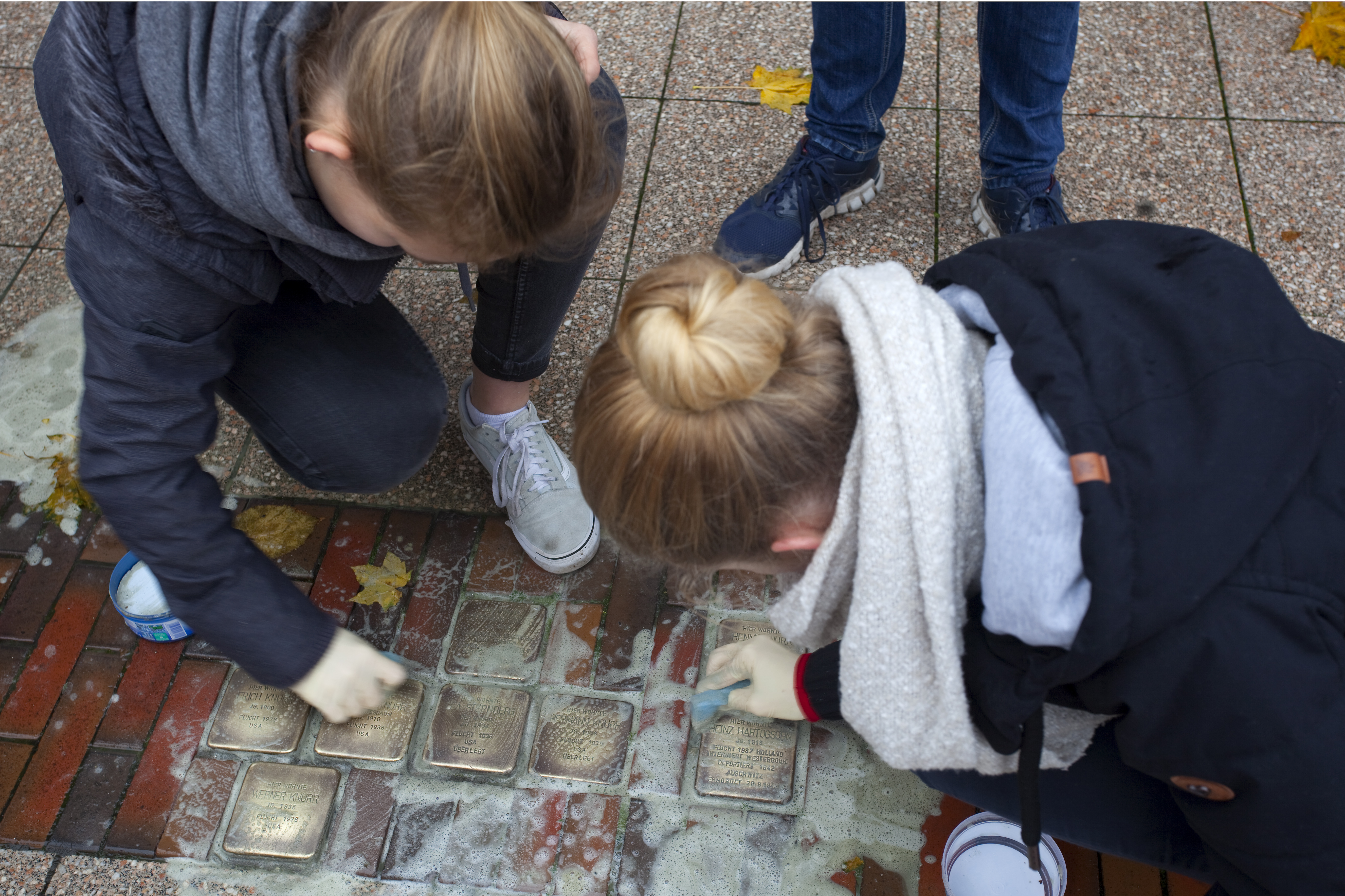 Das Putzen war nicht immer leicht und erforderte insbesondere von den jüngeren Jahrgängen erhebliche Kraftanstrengungen, aber als die zum Teil stark patinierten Messingplatten wieder zum Glänzen gebracht waren, stand vielen der Stolz ins Gesicht geschrieben. Es wurde aber auch manchmal deutlich, wie wichtig es ist, die Erinnerung an die vor 80 Jahren von den Nazis begangenen Gräueltaten wachzuhalten. Es gingen schon viele Passanten vorüber, die nicht nur sich sondern auch die Putzenden fragten, warum denn gerade an diesem Tag einer so merkwürdigen Beschäftigung nachgegangen wurde.