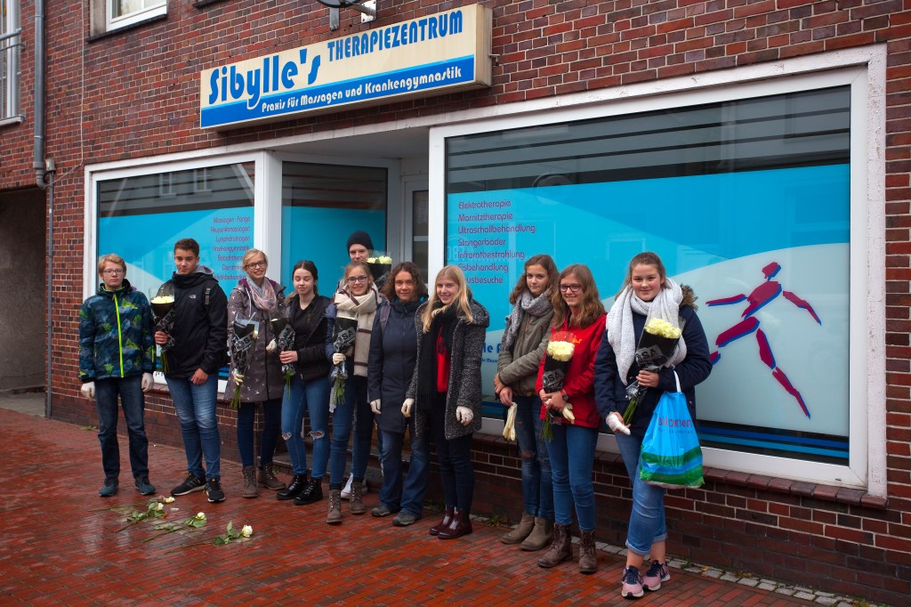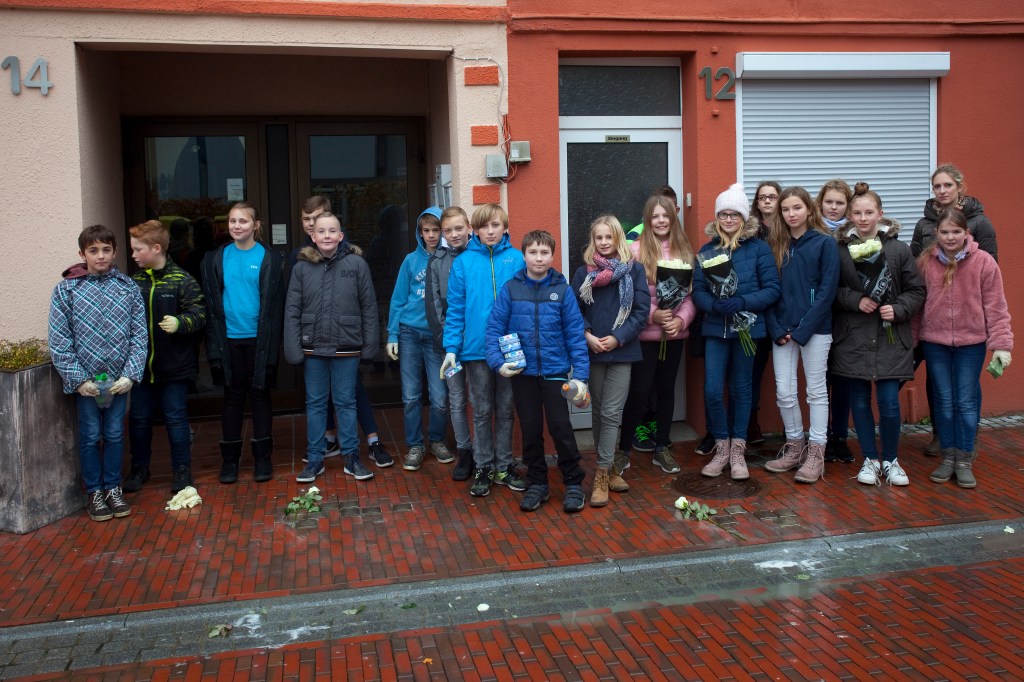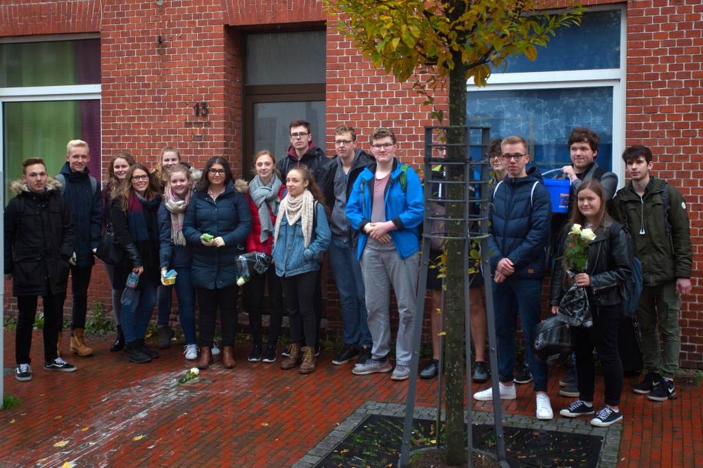 Aus Anlass des Gedenkens an die Reichspogromnacht am 9. November 1938 wurden auch in diesem Jahr die Auricher Stolpersteine geputzt. Seit der Verlegung von weiteren 26 Steinen am 19. September 2018 liegen davon insgesamt 339 Stück. Vor nun schon 67 Häusern überwiegend in der Auricher Innenstadt wurden gleichzeitig insgesamt 176 weiße Rosen niedergelegt. An der Aktion beteiligten sich Schülerinnen und Schüler der Jahrgänge 6, 7, 8 und 11 des Gymnasiums Ulricianum Aurich mit ihren Lehrerkräften Dr. Sandra Weferling, Sarah Kirsch und Christian Steininger. Erstmals war die Realschule Aurich durch eine 8. Klasse und die Lehrerin Traute Hartmann beteiligt.
