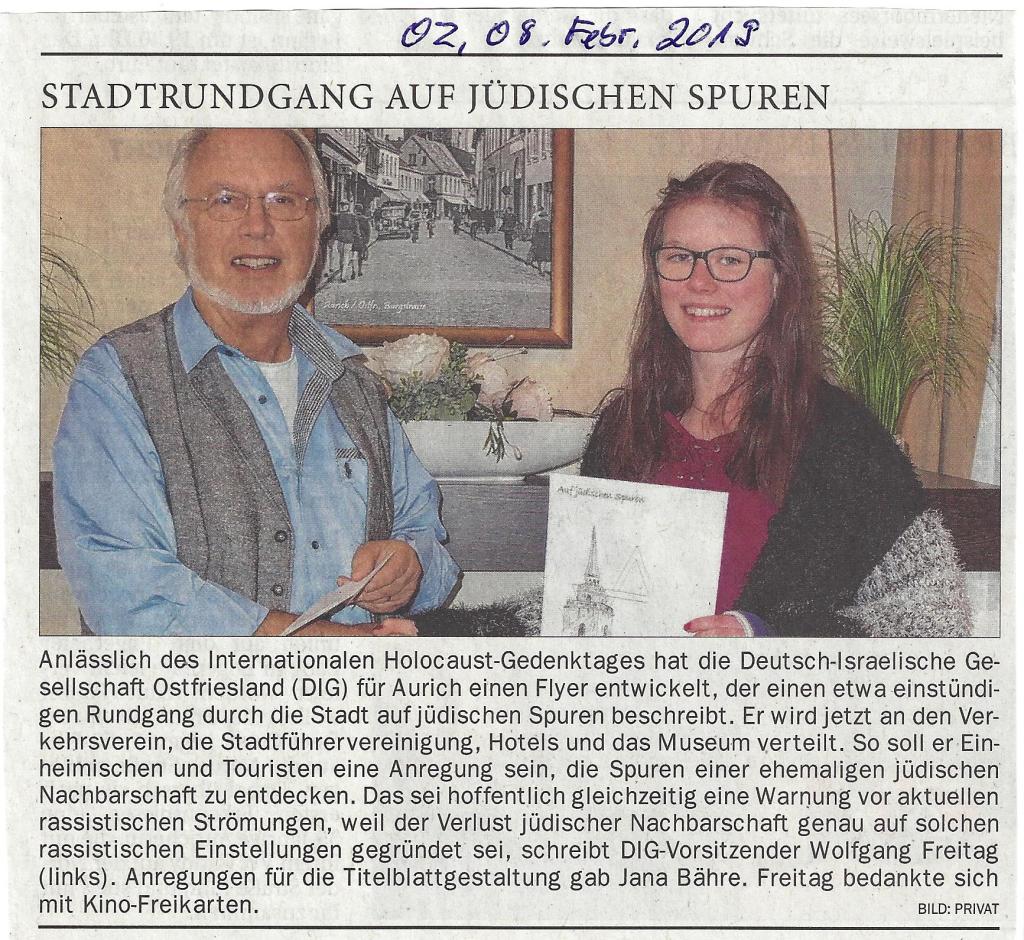Ein Faltblatt mit Anregungen für einen Stadtrundgang auf jüdischen Spuren in Aurich liegt seit Anfang Februar 2019 beim Verkehrsverein, beim Stadtmuseum und in Hotels aus. Es wurde von der Deutsch-Israelischen Gesellschaft (DIG) entwickelt (s. Presseartikel unten).