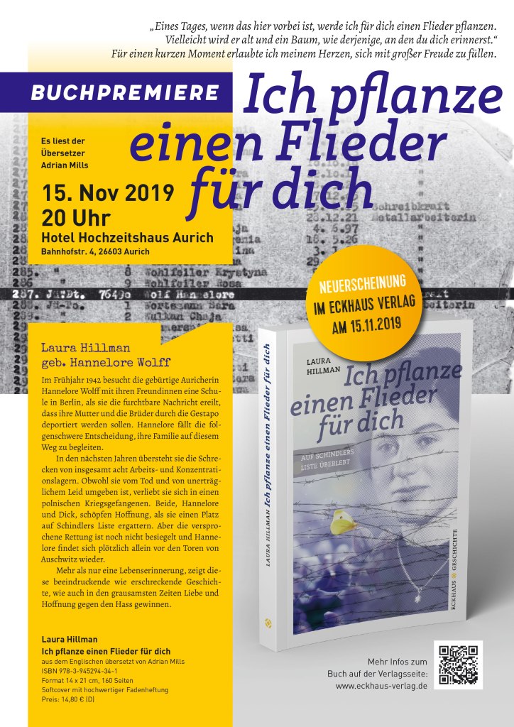 Am Freitag, dem 15.11.2019, wird im Hotel Hochzeitshaus Aurich um 20 Uhr Laura Hillmans Bericht über ihre Zeit in den Konzentrationslagern und die Rettung durch die Aufnahme in Schindlers Liste vorgestellt. Das Buch „I will plant you a lilac tree“ (2005) wurde von Adrian Mills aus dem Englischen übersetzt und wird von ihm in Auszügen am Premierenabend vorgelesen.