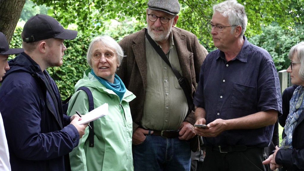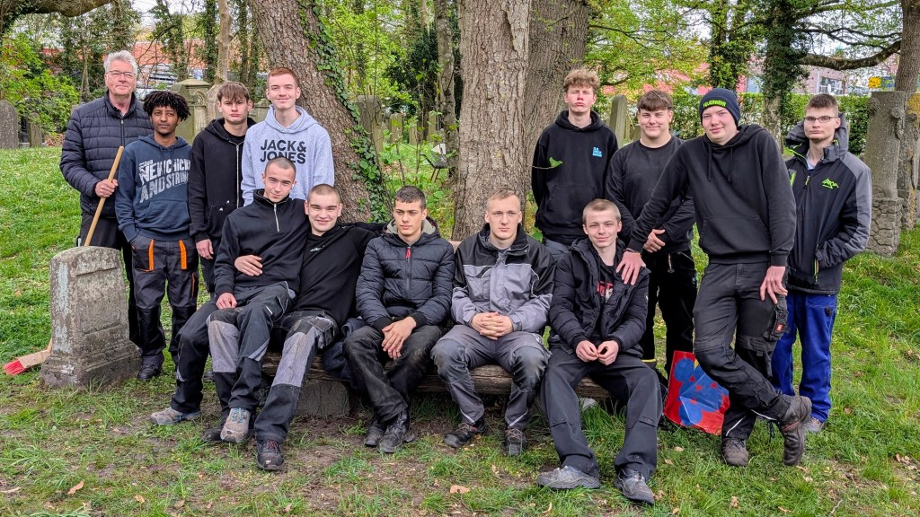 Am 22. April 2025 gingen die Pflegearbeiten weiter. Wieder hatte sich eine Reihe von Schülern mit ihrem Fachpraxislehrer Harmannus Cornelius daran gemacht, weitere Grabplatten auf dem alten Friedhofsteil freizulegen und zu säubern.